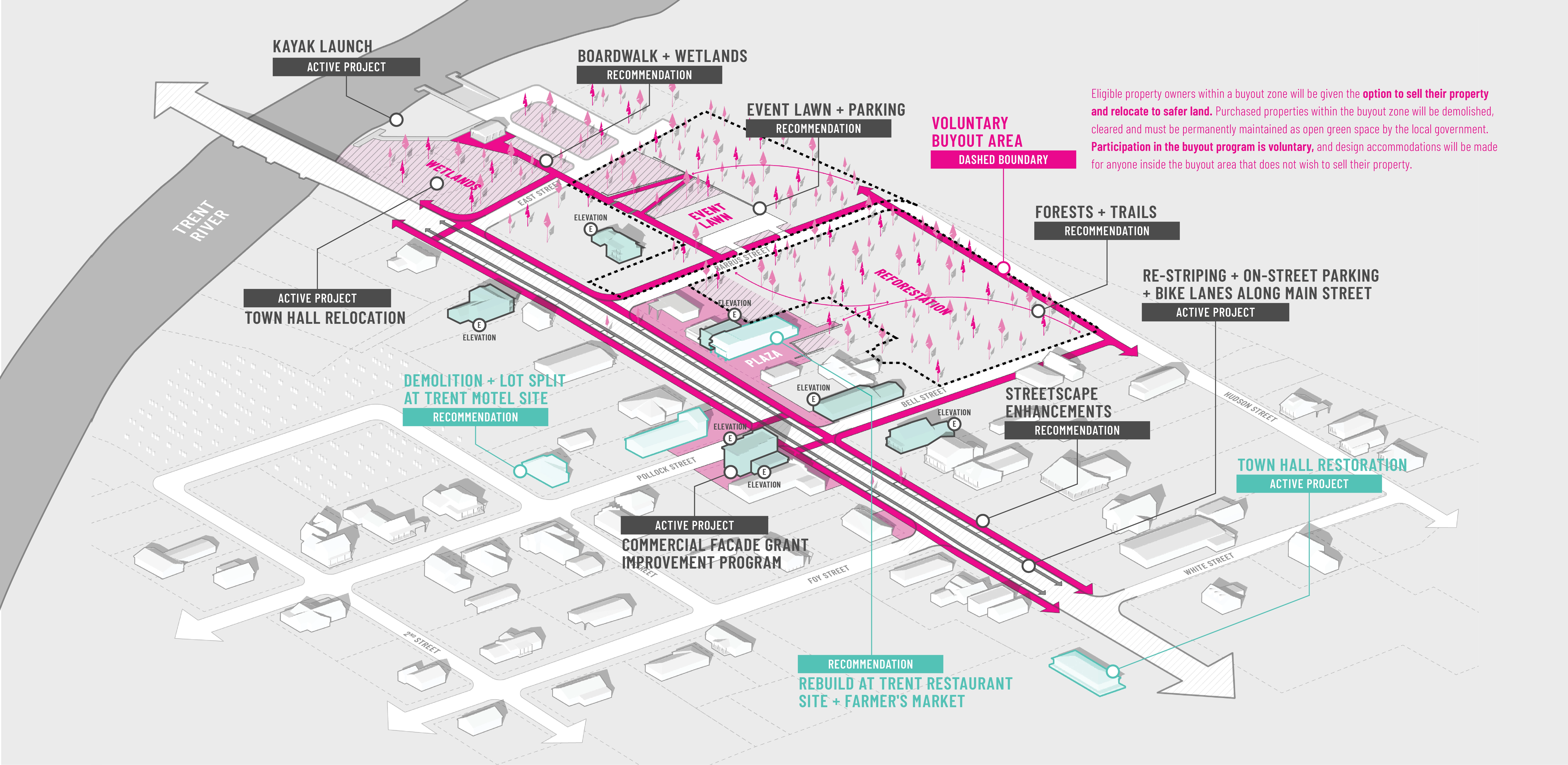 Overview: The Town of Pollocksville, North Carolina (population 216) is in the midst of a multi-year flood recovery process resulting from Hurricane Florence (2018). The rainfall generated by Florence was equivalent to a 1,000-year storm event, causing over $17B in monetary damages in North Carolina. In Pollocksville, the impacts of riverine flooding from the storm far exceeded the 500-year floodplain, inundating dozens of homes and nearly two-thirds of the town’s commercial properties. The Pollocksville Community Floodprint is bolstering community recovery efforts through an integrated portfolio of rebuilding projects. The project team led mixed-method participatory processes to co-produce the plan with the community. The rigorous planning and analysis undertaken by the project team continue to assist local leaders attract the financial resources needed to make Pollocksville a vibrant place to live and work while simultaneously increasing its resilience to future shocks. Context: The Town of Pollocksville is a small, rural community located on the banks of the Trent River in Jones County, North Carolina. Like other places across Eastern North Carolina, Pollocksville is deeply rooted in an agrarian past. The community maintains a direct connection to agricultural commodities including corn, soybean, cotton, and timberlands that adjoin much of the town’s periphery. Pollocksville is increasingly referred to as the “Gateway to Nature” due to its direct access to the Trent River, the Croatan National Forest, and classification as a Bird Sanctuary. In recent years, Pollocksville has leveraged its location through investments in its Riverfront Park, fishing pier, and kayak launch. These amenities, combined with the existing building stock in the Main Street commercial district and newly completed NC Highway 17 exit that accesses the town, afford Pollocksville a unique opportunity to rebuild in a way that increases its overall community resilience – social, economic, and environmental. Rural, Overburdened & Underserved: Often limited in the financial resources or technical capacity required to adequately recover from and plan for disasters, small towns across America are often left with few options for building back more resiliently. Specific to Eastern North Carolina, the long-term planning processes and infrastructure projects required for improved community resilience are seldom accessible. For citizens of Pollocksville, and more generally Jones County, the community faces a combination of demographic and environmental vulnerabilities that meet the U.S. Environmental Protection Agency criteria for both an “overburdened” and an “underserved” community. In the census tract that includes Pollocksville, the average per capita income is $22,183 (NC average: $30,783), the percent of the population age 65+ is 23.5% (NC average: 16.7%), and the percentage of the population who identify as People of Color is 40.5% (NC average: 29.4%). These figures: i) represent income, age, and race characteristics that are representative of a community with elevated social vulnerability risk factors; and ii) contribute to the inability of Pollocksville residents to attain the resources necessary to make the community more resilient to environmental stressors. As witnessed after Hurricane Florence, these vulnerabilities become active threats to life and property during and long after a natural disaster. Pollocksville and Jones County also face significant obstacles to financing the infrastructure projects needed to better prepare for weather extremes. Of the 80 counties classified by the NC Rural Center as having ‘rural’ population densities, 17 of them (including Jones County) share the dual characteristics of having: i) annual, per capita capital expenditure budgets that are less than the average for NC rural counties ($78.74/person/year); and ii) total budgets for annual capital expenditures that are not able to finance the local cost-share requirement (25%) of a single ‘resilient infrastructure’ project based on 2020 national average costs ($1,400,510.00, FEMA). Together, these data points suggest that without external financial support, communities in Jones County are both under-resourced compared to other rural counties in the state and lack the ability to self-fund capital improvement projects that may be necessary for community viability and sustainability. The Pollocksville Community Floodprint responds to these financial and technical challenges by strategically aligning community-identified values for resilience with potential funding sources that are external to local funding streams, and creating support materials that make Pollocksville more competitive to receive the external investments, grants, and resources it needs and deserves. Role of the Landscape Architect: As documented in Pollocksville and other rural communities, the overlap of vulnerable populations and heightened environmental risks imposes barriers to accessing the long-term technical support and financial resources needed to better prepare for future disasters. In response to these shortfalls, the project team – led by landscape architects – secured external grant funding to develop the Pollocksville Community Floodprint at no cost to the community. The project team led a mixed-method community engagement campaign. The project occurred during the height of the pandemic; engagement activities were hosted outside (with masks) and interactive sessions were designed to promote social distancing. Even with these challenges, the attendance for in-person activities included 30% of the town’s population. These efforts were further bolstered by mailed (included with monthly water bills) and online surveys. The project team also worked with town officials to assemble a Technical Advisory Committee that included representatives from state mitigation and emergency management agencies, local non-profits, and county fl