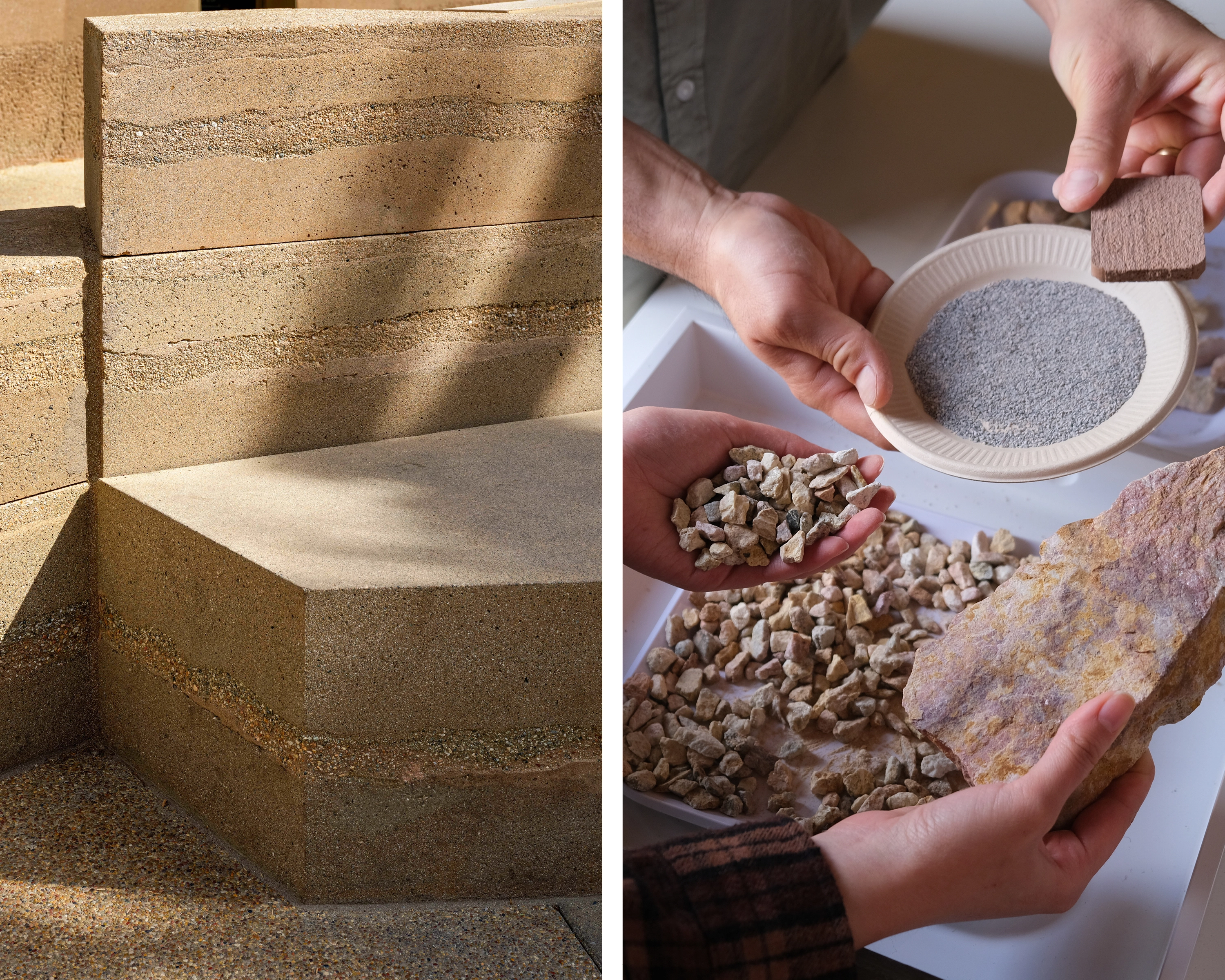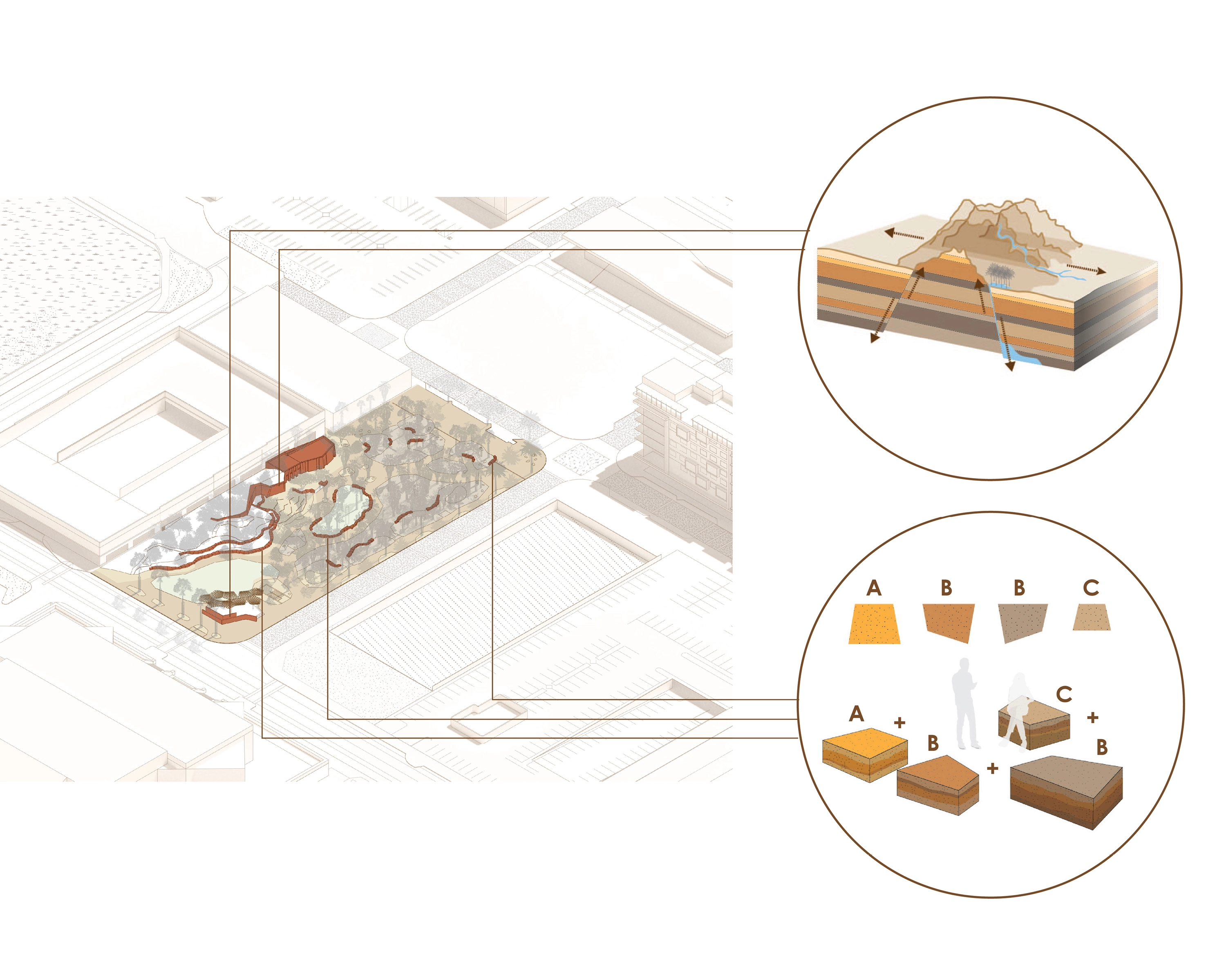 Vision Palm Springs Downtown Park is an inviting 1.5-acre urban oasis for residents and visitors to Palm Springs, a design-forward desert destination nestled along the base of the San Jacinto Mountains along the southwestern boundary of the Coachella Valley in California’s Sonoran Desert. The park lies in the ancestral homeland of the Agua Caliente band of the Cahuilla people who seasonally migrated between the shady palm groves and meltwater creeks of mountain canyons in summer and the hot springs and temperate climate of the valley floor in winter. The park is also fortuitously located on the historic site of Nellie Coffman’s Desert Inn. An early booster of Palm Springs, Coffman stressed the space, stillness, solitude, and simplicity of Palm Springs. Nellie’s “four S’s” would inspire the park’s design, which amplifies the intrinsic qualities of this extraordinary place to immerse visitors in the multisensory beauty of the desert and celebrate Palm Springs’ legacy as a destination for health, nature, and pleasure seekers. The park is made up of three overlapping spaces: the Palm Grove, the Outcrop, and the Theater. Each offers distinct programmatic capacities and reveals facets of the region’s dynamic geology, distinctive vegetation, and rich history. The Palm Grove The densely planted Palm Grove satisfies the need to achieve thermal comfort in the extreme heat of summer days that can exceed 120 degrees. The tight arrangement of over 130 Washingtonia filifera, California’s only native palm, was inspired by team hikes to Palm Canyon on the Agua Caliente Reservation. The canyon’s sandy floor and continuous canopy formed a cooling cathedral that would significantly influence Downtown Park’s identity. The design team measured air temperatures inside and outside Palm Canyon and mapped the spacing of its palms, most of which retained their frond skirts except where a fire had burned them off and charred their trunks. Some had even been struck by lightning creating a sinuous trunk form known as a “snake palm”. For the park, palms of varying heights were selected for their unique and irregular forms and composed to create shady social eddies of varying sizes. 3D modeling of seasonal shade scenarios was used to ensure coverage throughout the year. Custom aluminum park furnishings stay cool to the touch and are left loose for users to “follow the shade” throughout the day. Visitors move them around to support morning coffee klatches, family picnics, or quiet reading. After dark, the grove is illuminated to glow like a lantern inviting park use into the cooler evening hours. The Outcrop The dramatic Outcrop rising along the park’s northern edge was initially conceived to obscure an adjacent parking garage to allow for an immersive park experience that relates to the surrounding mountains. Team hikes in Tahquitz Canyon offered an up-close experience of the colorful banded rock formations which offer such striking views from the valley floor. The team abstracted this geology into a custom “sedimentary” finish for shotcrete vertical walls and pre-cast concrete modular seat blocks that retain slopes and form gathering spaces in the park. The uplifted geologic layers of the Outcrop reflect the ombre of tones that make up the San Jacintos, reddish and rumpled sandstones along the base to desaturated and smooth granite along the top. Meandering trails rise with a landform at the east as the Outcrop becomes the backdrop for the park’s dramatic centerpiece, a powerful cascade inspired by Tahquitz Canyon’s iconic waterfalls. In front of the waterfall is an interactive water feature of jets and fog emitters that cools the heart of the park while bringing the magic of surrounding mountains into the urban core. The Outcrop’s westernmost extent contains park restrooms and a police substation fully integrated into the geologic structure. The Theater Park visitors flock to the shade of the Palm Grove and the relief of the Outcrop’s water features to beat the heat during the day, but at night as temperatures come down, the Theater comes to life. This space honors the cultural heritage of Palm Springs and the Coachella Valley, a world-class destination for the performing arts from the days of singing cowboys to contemporary music, dance, and film festivals. The Theater hosts an array of events from live performances, lectures, film nights, and music festivals taking place on an elevated stage with a capacity of over 1000 on the event lawn and amphitheater seat blocks stepping up into the Outcrop. The stage is framed by a palm frond-inspired shade canopy and has a dramatic backdrop of the Palm Springs Art Museum and the San Jacinto Mountains. Materiality The materials and the plantings in the park are rooted in the character and natural history of Palm Springs. Local ‘Palm Springs Gold’ stone was sourced from a quarry 10 miles away and used as boulders, cobble mulch, concrete topcast, and decomposed granite to complement the hues and tones of the surrounding mountains. Climate-appropriate native and regional desert plantings were specified to provide ecological habitat, attract native pollinators such as monarch butterflies and hummingbirds, and showcase the biodiversity of the desert. Mesquite and Palo verde trees provide shade and anchor a more arid and sculptural palette of ocotillo, agave, and barrel cactus on the Outcrop. Hesperaloe, bulbine, and desert milkweed are among the more colorful species in the Palm Grove planting areas, which also contain a series of rain gardens receiving and filtering all stormwater from the park. Armrests on the seat blocks increase accessibility while offering pops of vibrant color sampled from the blooms of surrounding flora.