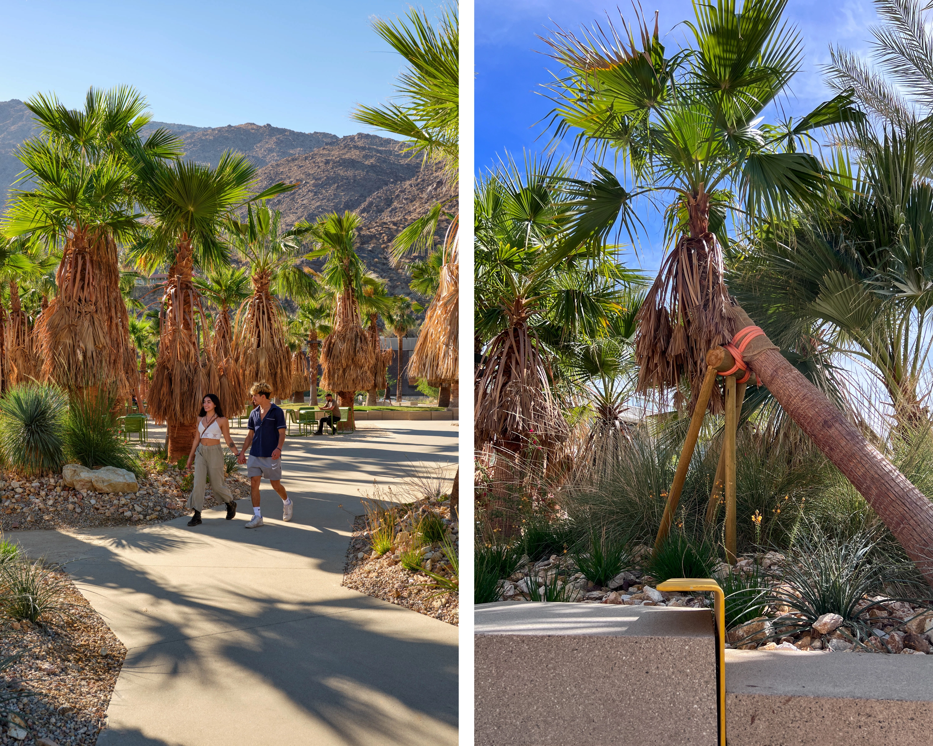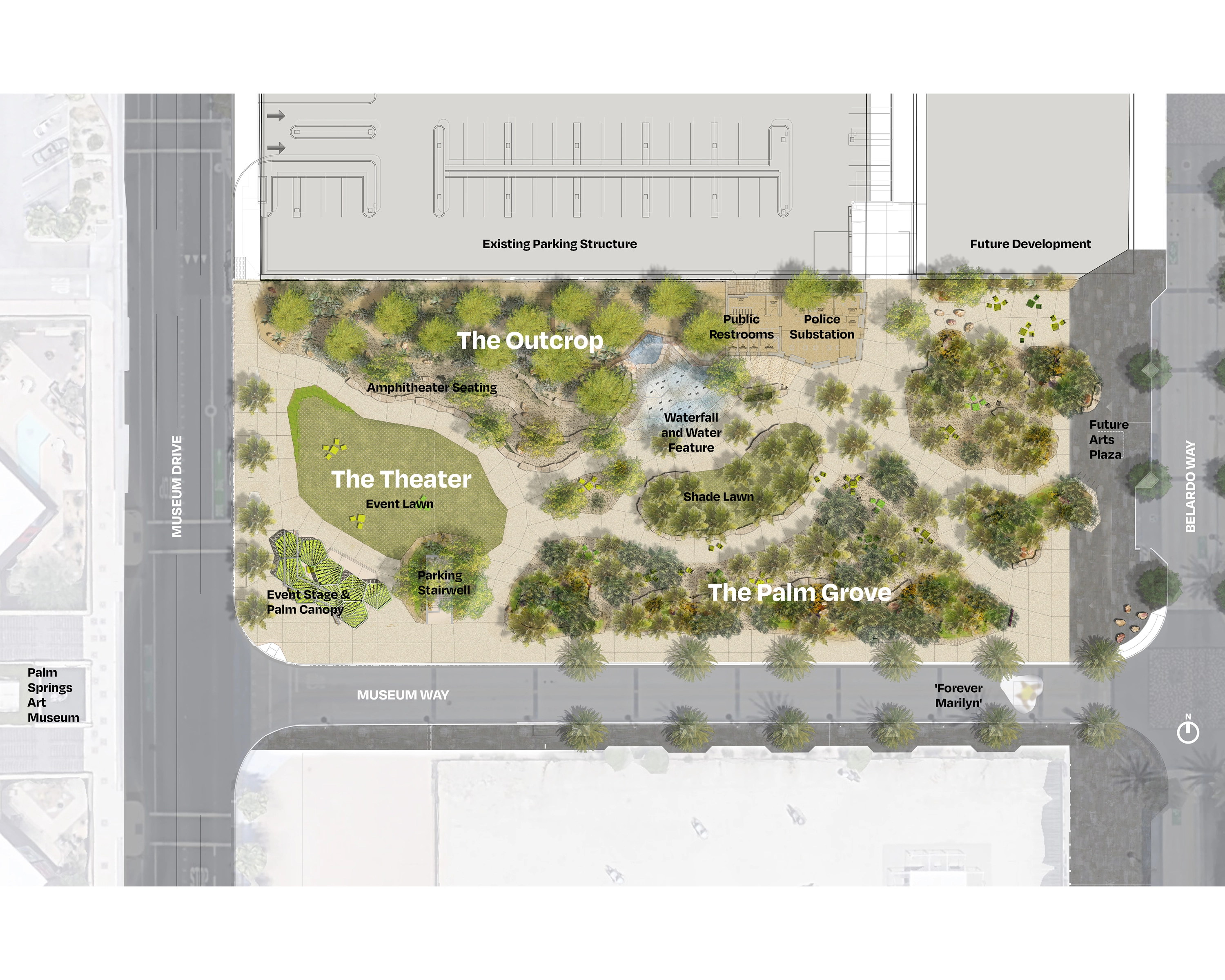 Palm Springs Downtown Park is an inviting 1.5-acre urban oasis for residents and visitors to Palm Springs, a design-forward desert destination nestled along the base of the San Jacinto Mountains along the southwestern boundary of the Coachella Valley in California's Sonoran Desert. The park lies in the ancestral homeland of the Agua Caliente band of the Cahuilla people who seasonally migrated between the shady palm groves and meltwater creeks of mountain canyons in summer and the hot springs and temperate climate of the valley floor in winter. The park is also located on the historic site of Nellie Coffman’s Desert Inn. An early booster of Palm Springs, Coffman stressed the space, stillness, solitude, and simplicity of Palm Springs. Nellie’s “four S’s” would inspire the park’s design, which amplifies the intrinsic qualities of this extraordinary place to immerse visitors in the multisensory beauty of the desert and celebrate Palm Springs’ legacy as a destination for health, nature, and pleasure seekers. The park is made up of three spaces: the Palm Grove, the Outcrop, and the Theater.
