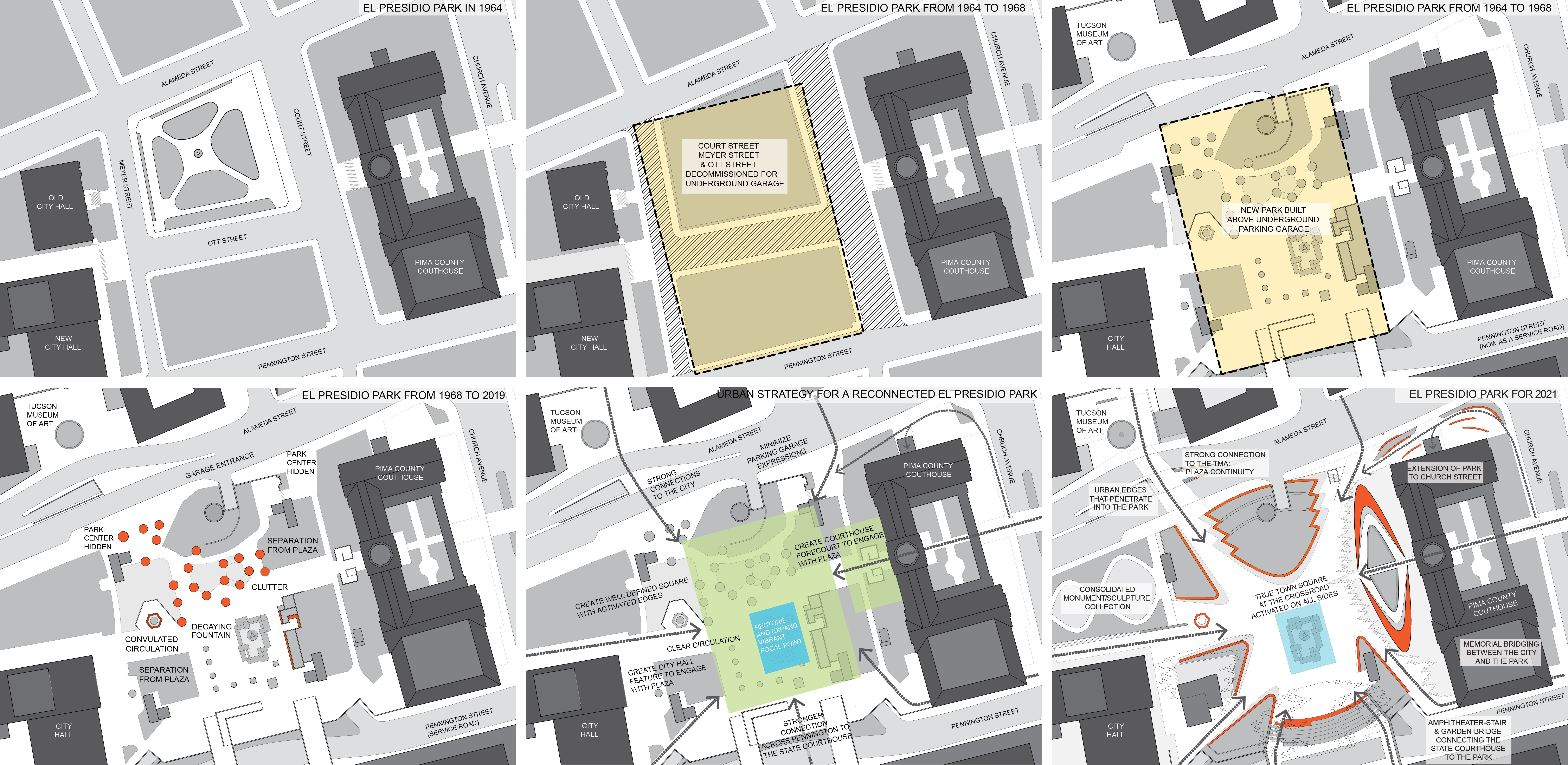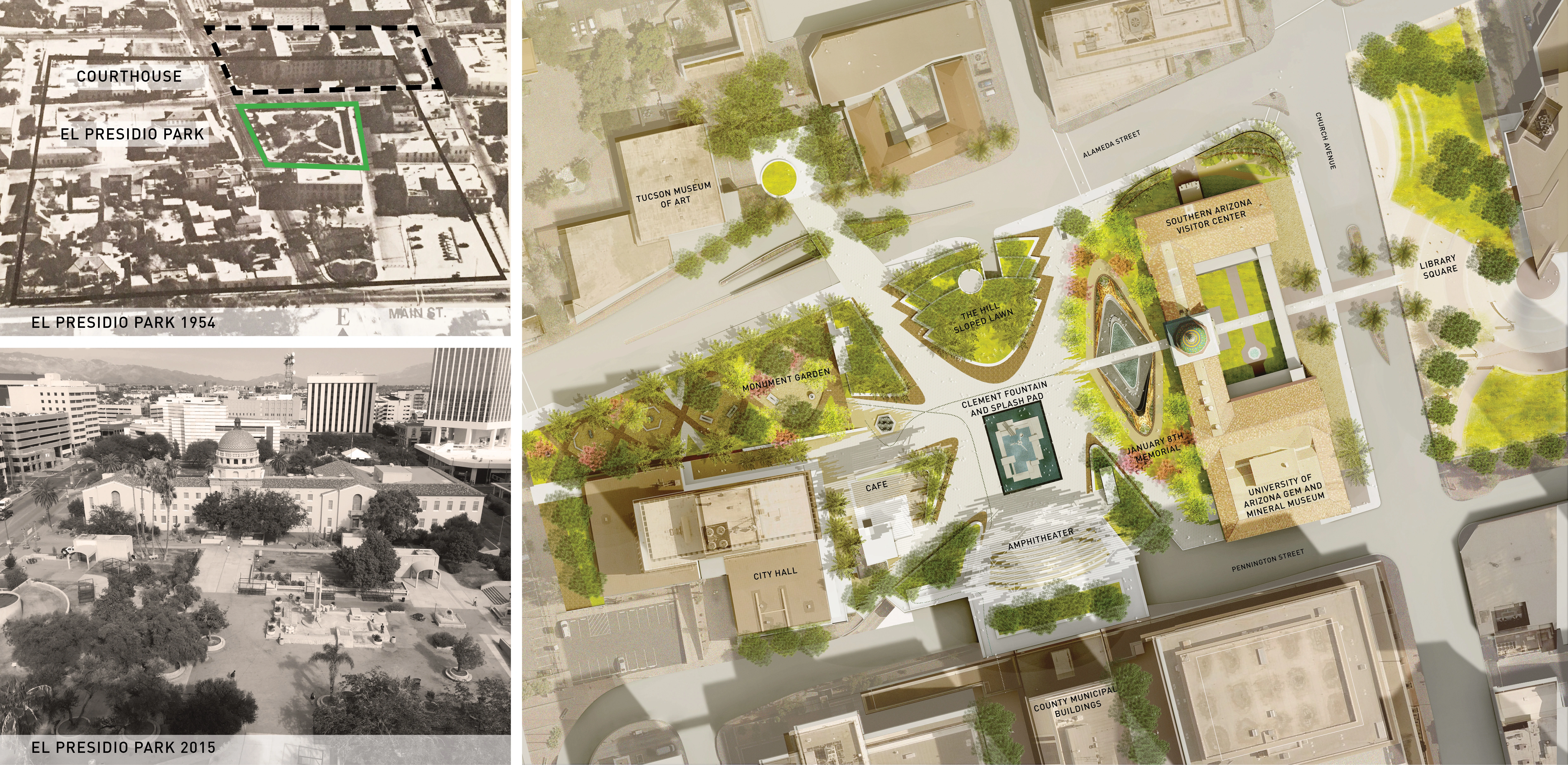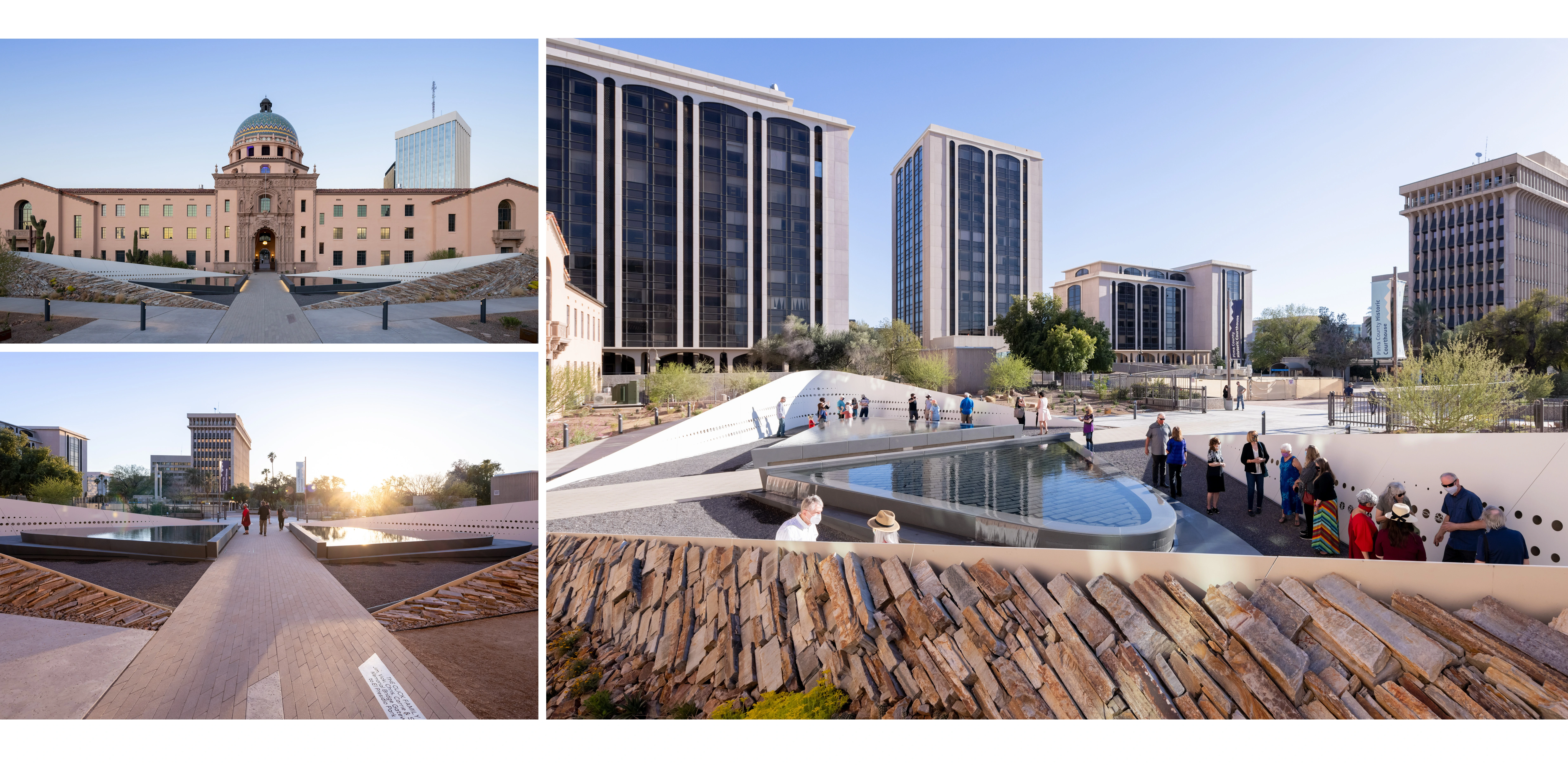 On January 8th, 2011, a gunman shot nineteen people assembled to meet Congresswoman Giffords in Tucson, Arizona. Six people died and thirteen were injured including Ms. Giffords who was shot in the head. This was an attack on democracy, and the first time a House member was targeted. To bring healing and a sense of closure, the January 8th Memorial Foundation sought a permanent Memorial to commemorate the tragedy and create a symbol of hope, celebrating the community’s resilience. They also sought a place for social discourse for future generations. The Memorial would be within El Presidio Park, adjacent to the County Courthouse. This required a masterplan vision for El Presidio Park which had become an aging, underutilized public space. Over the course of 5 years, the design team worked closely with the Foundation, victims’ families and survivors, and City and County staff to bring this inclusive and holistic vision to fruition.