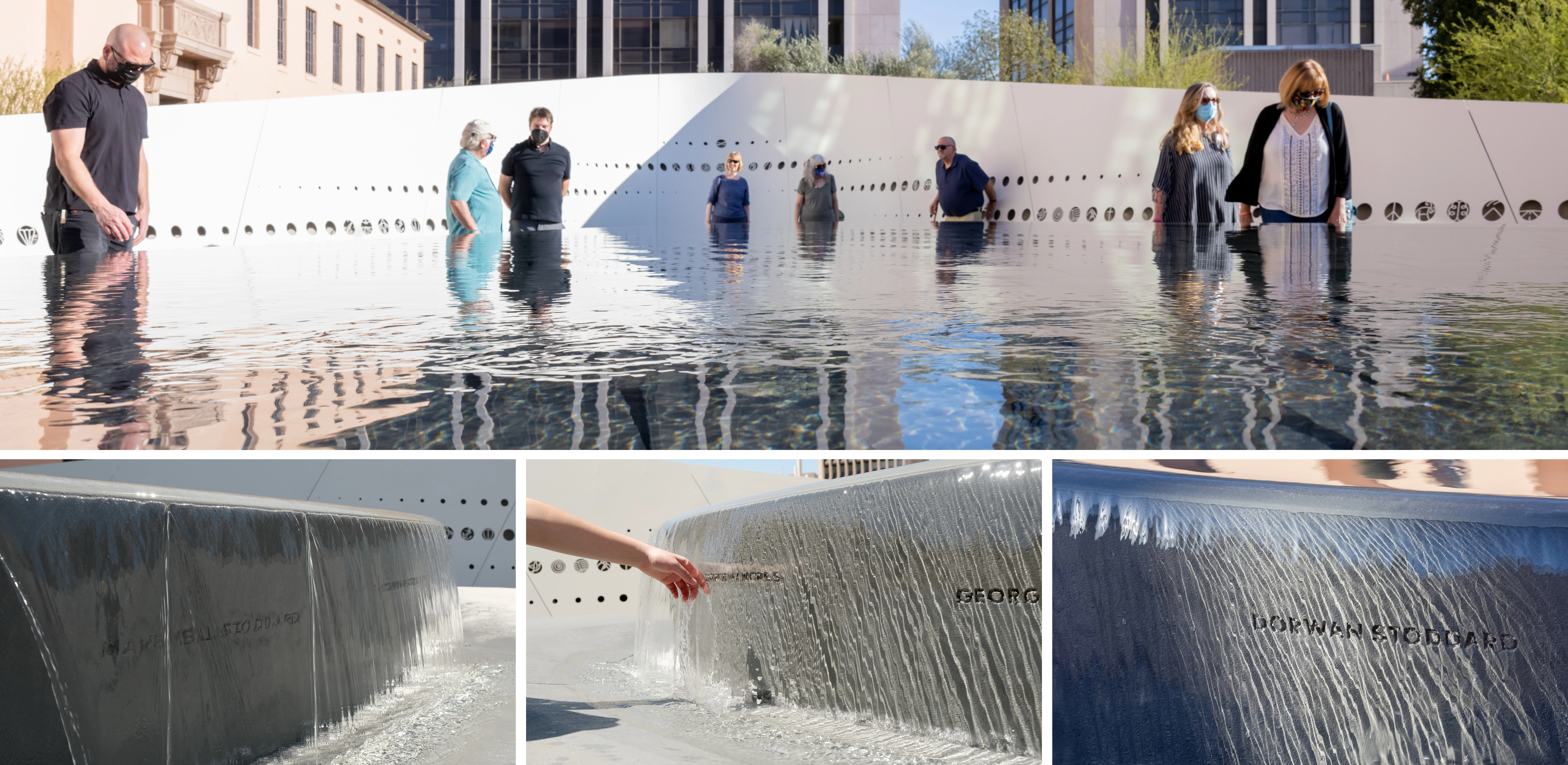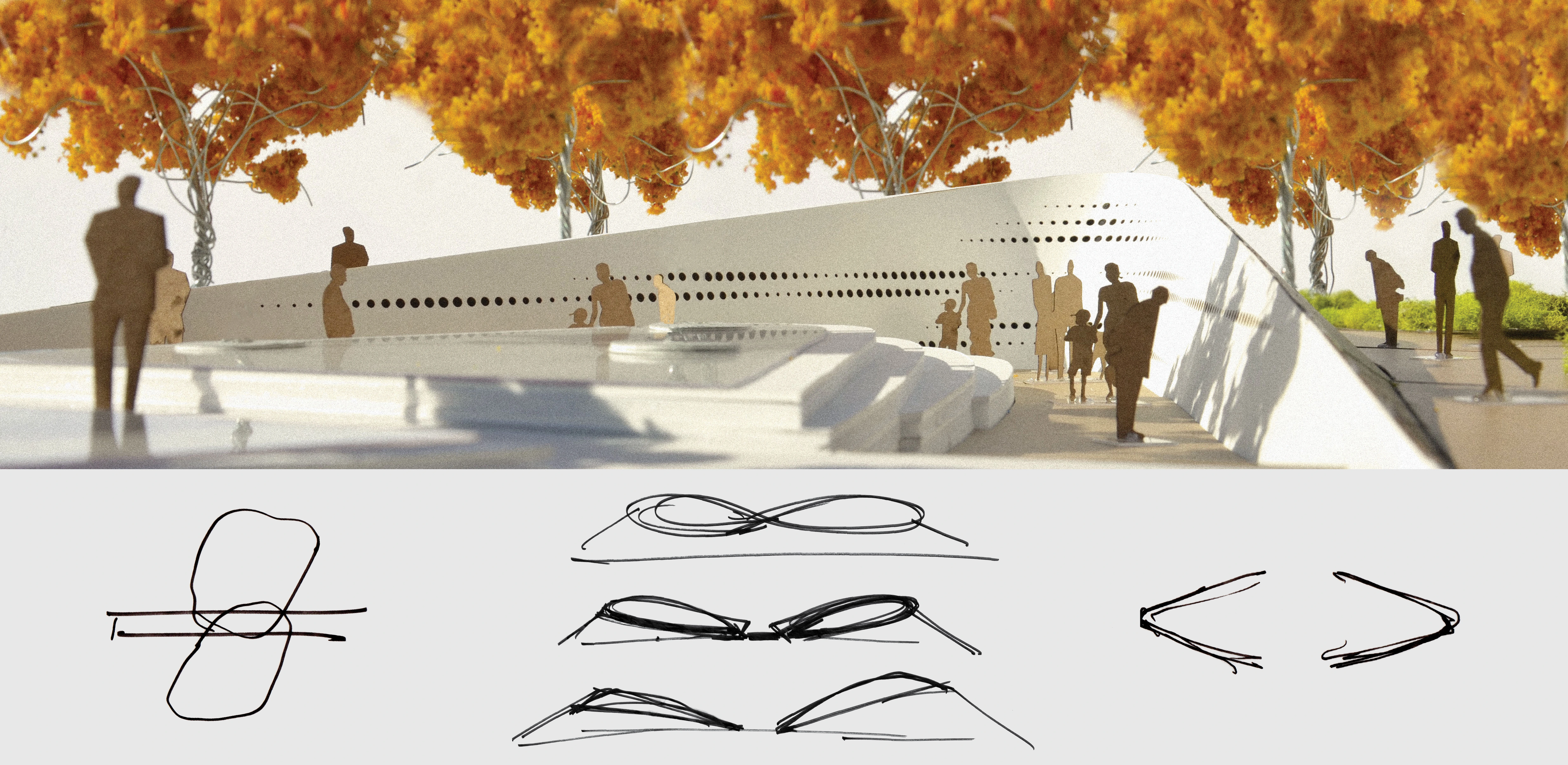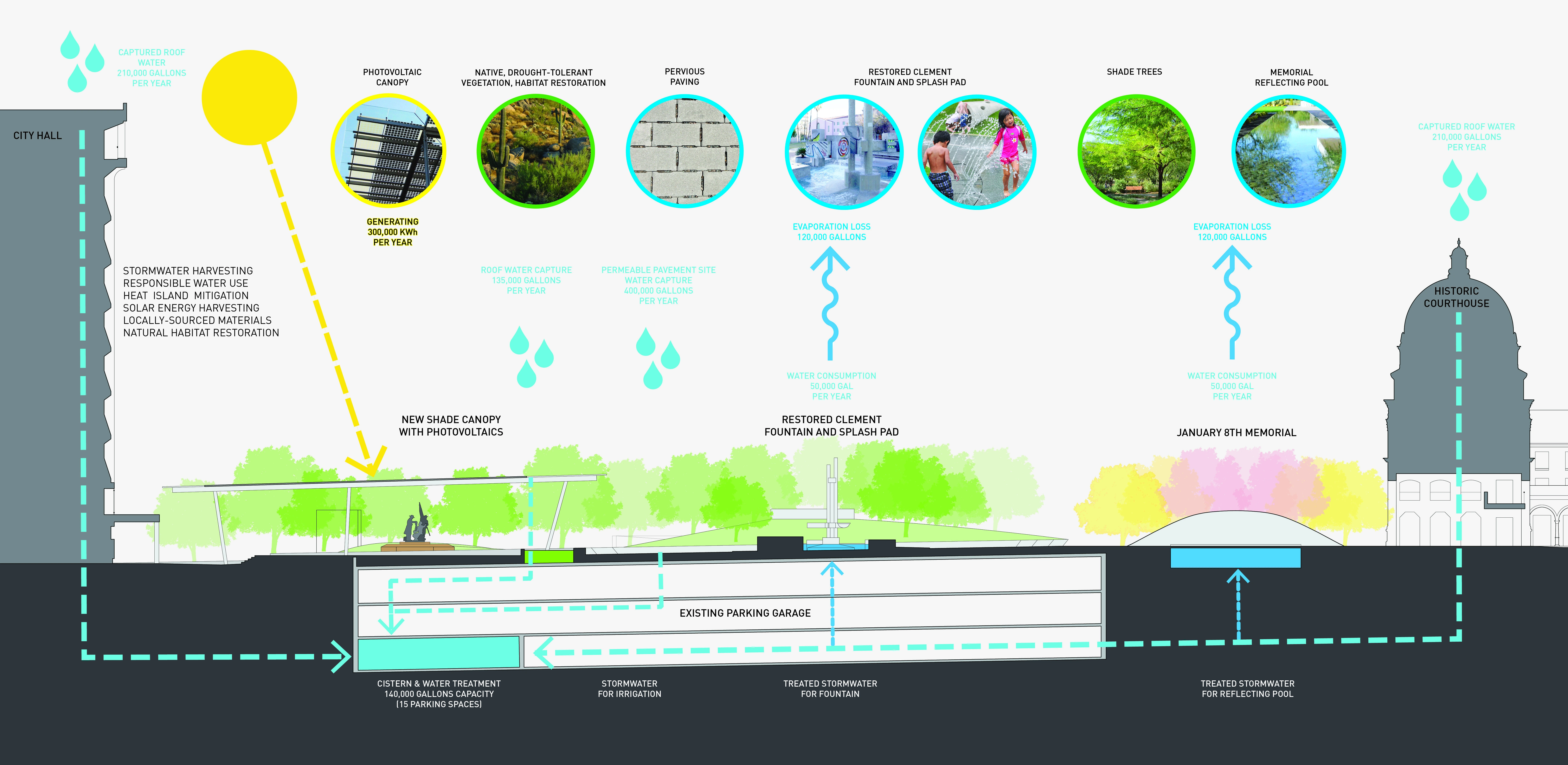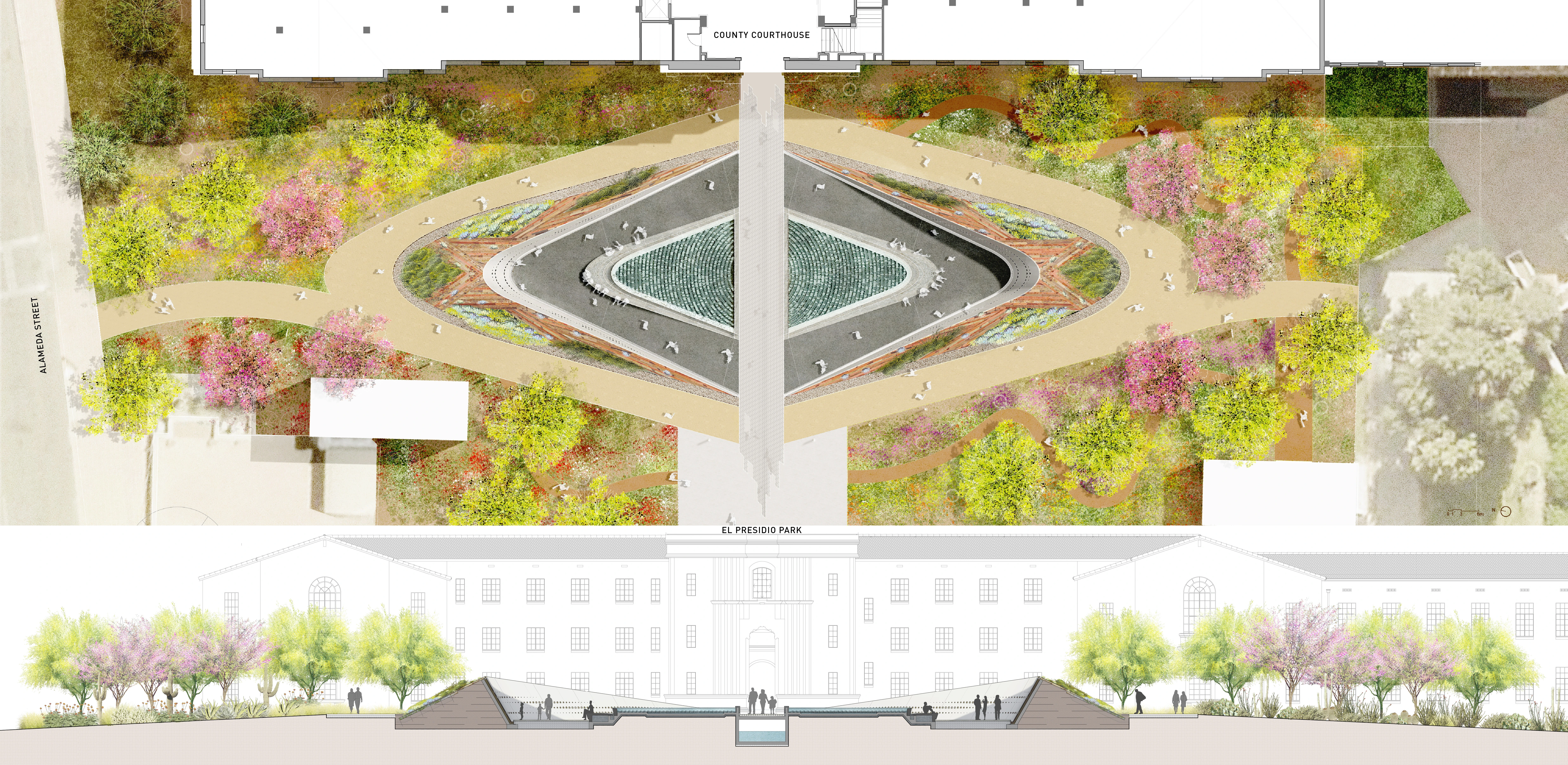 SITE AND MASTERPLAN El Presidio Park a 4-acre site located in Tucson, Arizona and is the city’s main civic space, surrounded by City Hall, County and Municipal Buildings. Nearby are several cultural institutions such as the Tucson Museum of Art, Fox Theater, and the Museum of Contemporary Art, making El Presidio Park the central location for civic and cultural events. Although the shooting took place elsewhere in Tucson, The January 8th Memorial Foundation and County agreed to locate the Memorial at El Presidio Park near the County Courthouse to make it highly accessible to the public. To create the proper setting for the Memorial, a masterplan vision was created. El Presidio Park was once a 1-acre town square accessible on all sides. During the 1960’s, a parking garage was constructed which required the decommissioning of roads for garage entry/exit points. A new park was relocated on top of the garage, but due to convoluted planning and addition of government buildings, it became hidden from the street and was less effective as an every day public space. The masterplan vision identified several deficiencies. One was the lack of visibility from the street of the park interior. View corridors were created to make the park center visible from the street and adjacent cultural institutions with Clement Fountain restored and enhanced as a children’s splash pad. Second was the configuration of the public space. The central space is reshaped and re-proportioned as an intimate town square with activated edges through seating and shade that invite people inward. Third was the lack of public activities and amenities. To bring activity, key features anchor each quadrant of the square - the January 8th Memorial in front of the Courthouse, a 500-seat Amphitheater that also serves as a land bridge to better connect the site; a cafe in front of the City Hall that brings a night and weekend use to the site; a Monument Sculpture Garden to consolidated the various smaller memorials on site; and a sloped lawn as a informal gathering place as well as to hide the garage vent. SUSTAINABILITY Because the site was surrounded by buildings and hardscape, a site strategy for sustainability was highly desired. Given the site’s desert climate, a near net-zero approach would be needed to sustain any water features. The Cafe and Amphitheater canopies would be fitted with photovoltaics for energy production while providing shade. Storm water would be captured on all roof and paved surfaces and stored in a cistern in the parking garage below for reuse in the water features and irrigation. COMMUNITY ENGAGEMENT Given the site was historically a place of conquest for many centuries, the design team sought out input from a wide range of groups, organizing a 4-month public engagement process for the Master plan and Memorial. The design team engaged the Memorial Foundation; victims’ families and survivors; neighborhood, City and County leaders; historians; cultural and educational institutions; the Tohono O’odham Nation; and surrounding business leaders, meeting monthly to understand varying view points, practical concerns, cultural conflicts, desert issues, the flora and fauna, economic development while reviewing and refining the design with these considerations. The public consultations culminated with many of the groups who had disagreed and had no common ground, now coming together with a renewed cultural understanding and sense of resolution through the inclusive process with the Memorial and Masterplan being approved by the City and County. THE JANUARY 8TH MEMORIAL Based on interviews and workshops with the Foundation, the victims’ families, the survivors, and first responders, and the artifacts from the many spontaneous memorials after the tragedy, the Memorial is an Embrace - a symbol of hope for a better future. It’s landforms represent the Community, like healing arms protecting the inner memorial where the spirit of the victims and survivors are represented and the story of January 8th is told. The Memorial is a place where citizens can gather to remember and honor those who gave their lives in pursuit of a better democracy. It is also a place to celebrate the solidarity of Tucsonans in the face of tragedy, a sense of community that still resonates today. SITE Through the masterplan vision, the Memorial is located in front of the historic Courthouse on Tucson’s Civic Axis that connects to El Presidio Park. The presence of the Memorial at the foot of the Courthouse is a reminder that the violence perpetrated on January 8th interfered with freedom of expression and self-government. Its position on the Civic Axis ensures that the Memorial is part of the everyday life and consciousness of the city. Arriving through the Courthouse gate, visitors enter the Memorial as a gateway to El Presidio Park. From the park, its landforms are seen rising from the earth, framing the Courthouse as forecourt to the historic building. DESIGN AND EXPERIENCE Walking along the civic axis, visitors discover the Memorial and are invited to take a moment of pause. As one traverses through, the color of life in the earthen Memorial form is contrasted with the abstract and monochromatic quality of the Inner Memorial, creating the sensation of suspension and timelessness. Visitors look across two overflowing reflecting pools. As one gently descends into the Memorial space, the inner wall rises and slopes outward, creating a chapel like space for remembrance and contemplation while the urban noise recedes to the sound of cascading water. Carved into the Inner Wall are constellation of symbols that are inspired by the 6,000-year old Hohokam petroglyphs that tell the story of January 8th through the people who died, survived and responded. Each symbol strand began with 33 holes to represent the number of bullets fired, and the symbols represents the values of each life lost and survived. The gradation of the strands overlap with