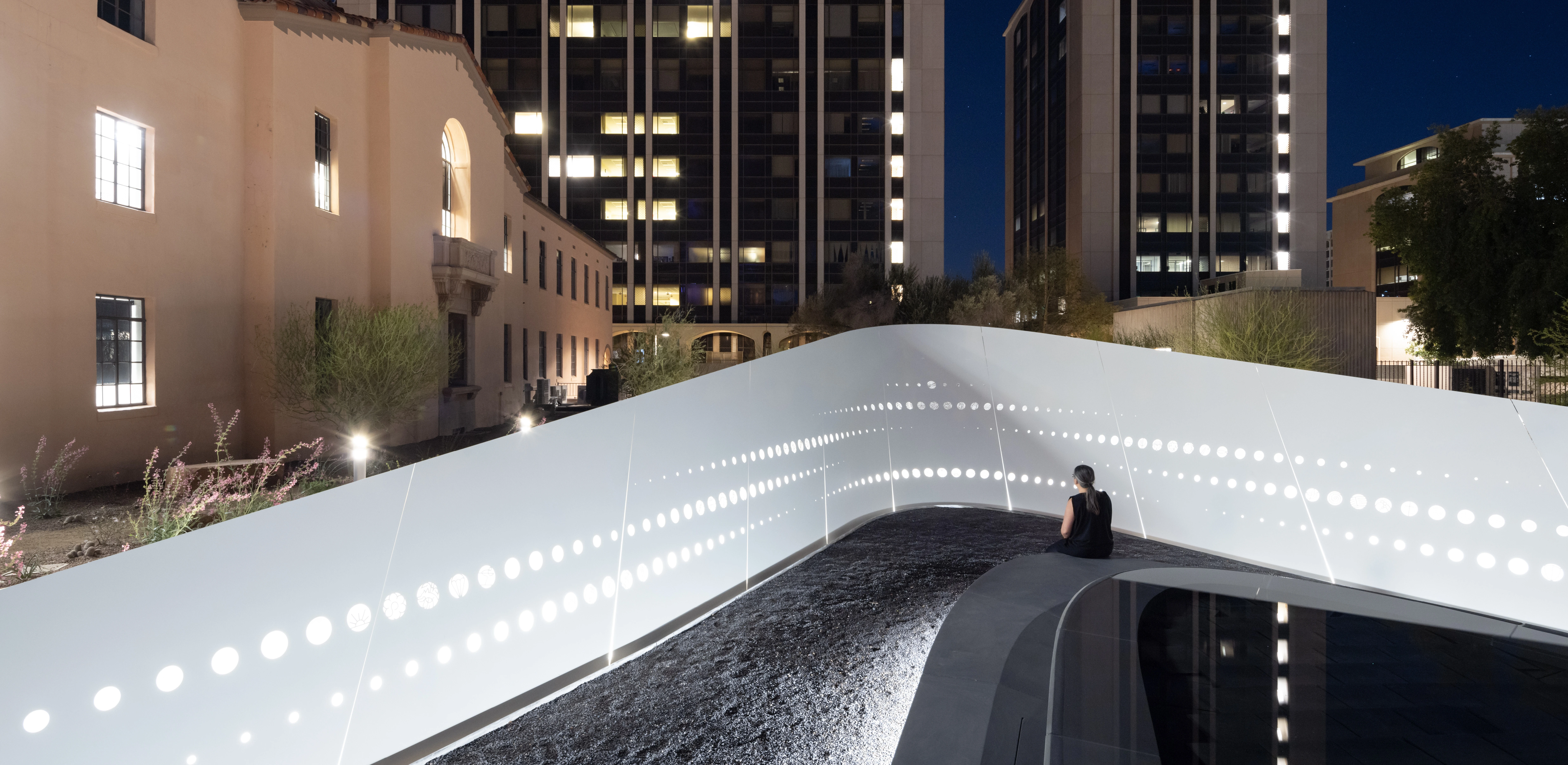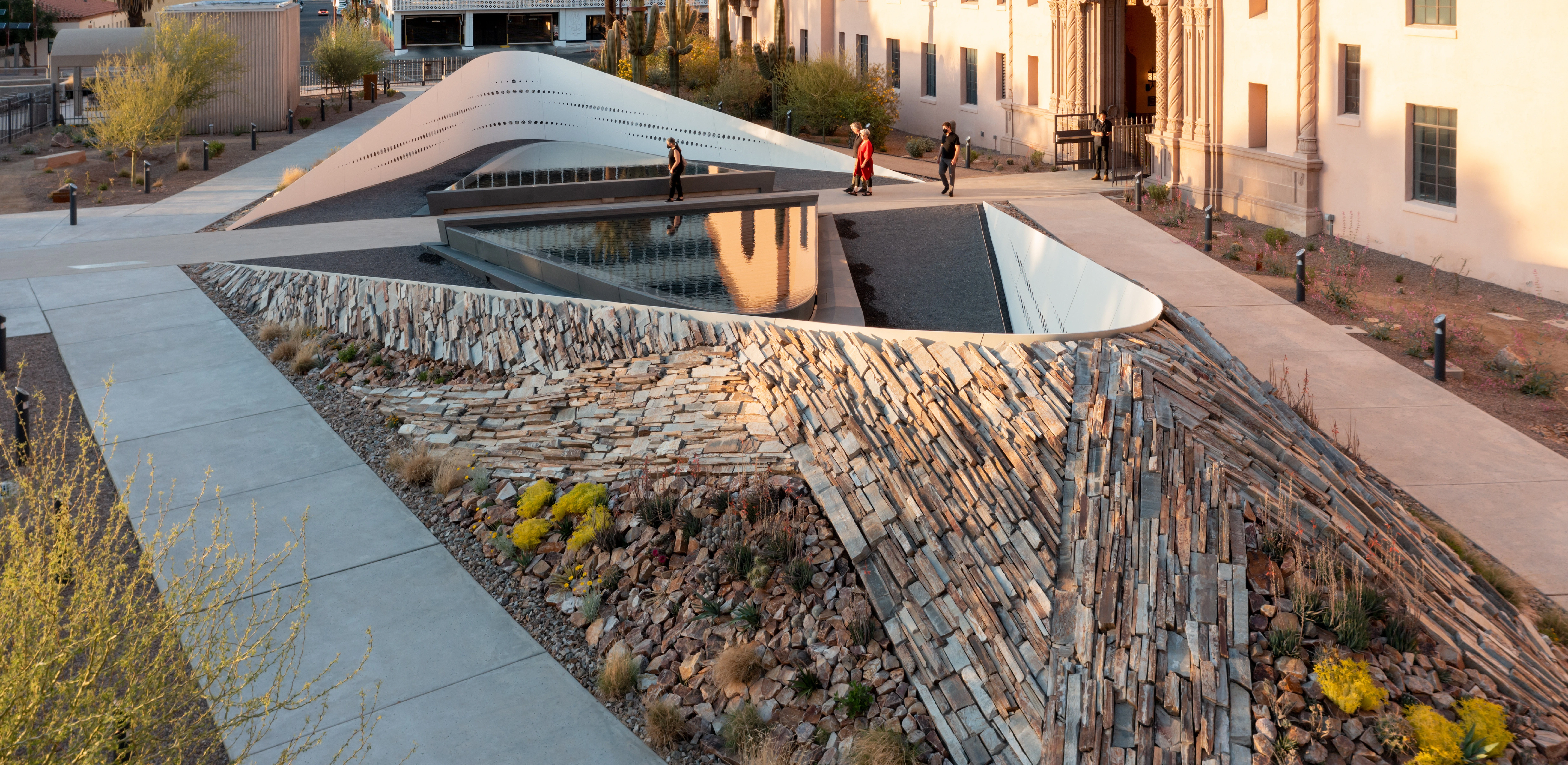 After an extensive planning process including four months of community input, a memorial was created with two large sharply curving forms “embracing,” symbolizing hope for the future. A Living Wall was constructed with a woven pattern of local quartzite stone and Sonoran plants. A 500-seat amphitheater, a café, and a Monument Sculpture Garden help activate the space. The jury praised the remarkable depth in layers of meaning across three overlapping spaces, each with distinctive geometries.