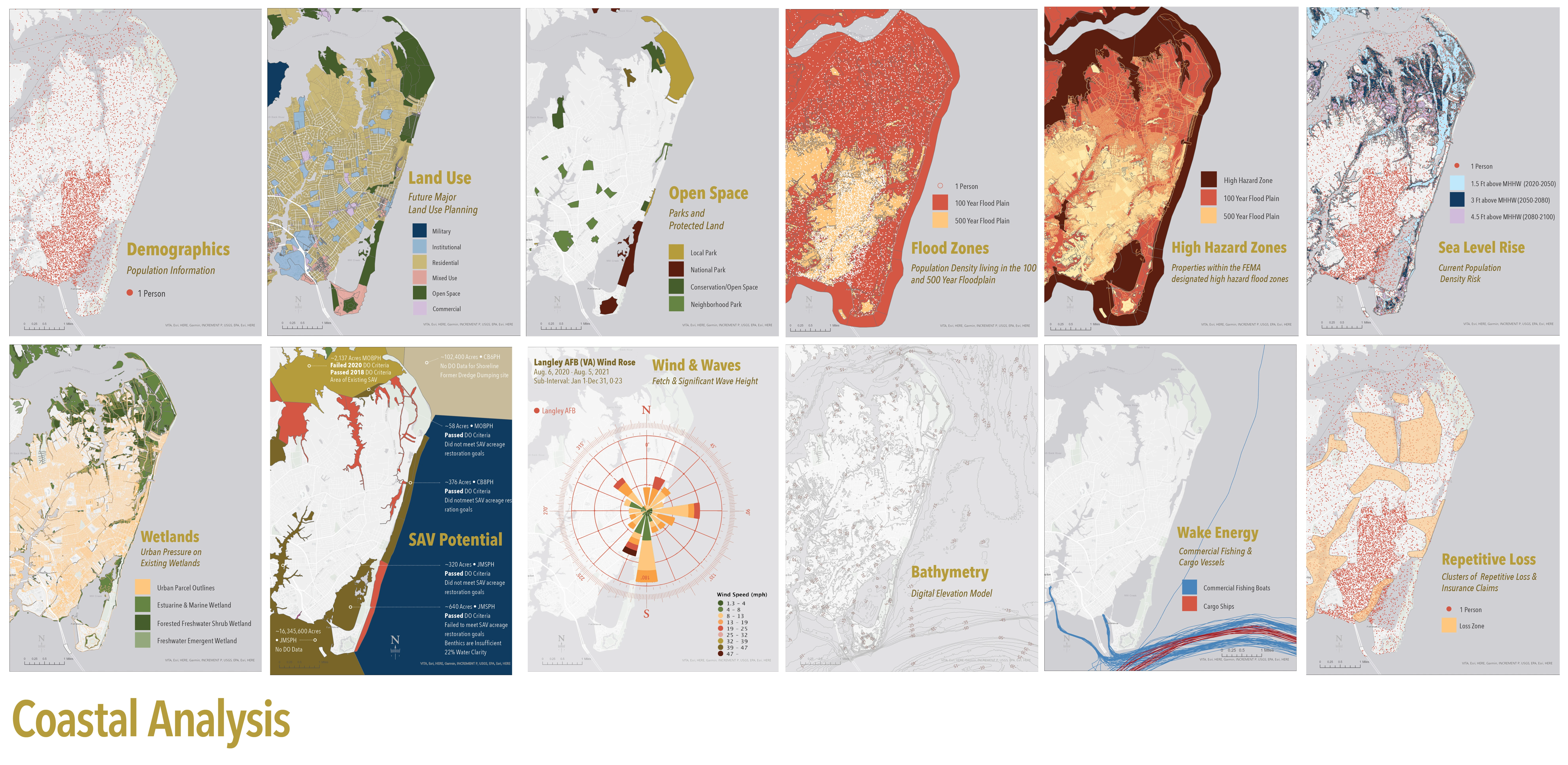 For this project, ecological and human risk was analyzed using data collected from the City of Hampton, the 2019 American Community Survey, FEMA, NOAA, the National Hurricane Center, Midwestern Regional Climate Center, National Wetlands Inventory, EPA, and the Virginia Department of Environmental Quality using ArcGIS. Coastal bathymetry was generated using a USGS digital elevation model. The team analyzed topography, sea level rise, existing and historic wetland cover, population density, urban density, land use, open space, flood zones, repetitive insurance loss areas, properties located in high hazard zones, flooding associated with hurricanes by intensity, shipping traffic counts, projected shoreline change, water quality data including submerged aquatic vegetation (SAV) supportive dissolved oxygen rates, tidal flow patterns, wind, and significant wave heights by storm severity.