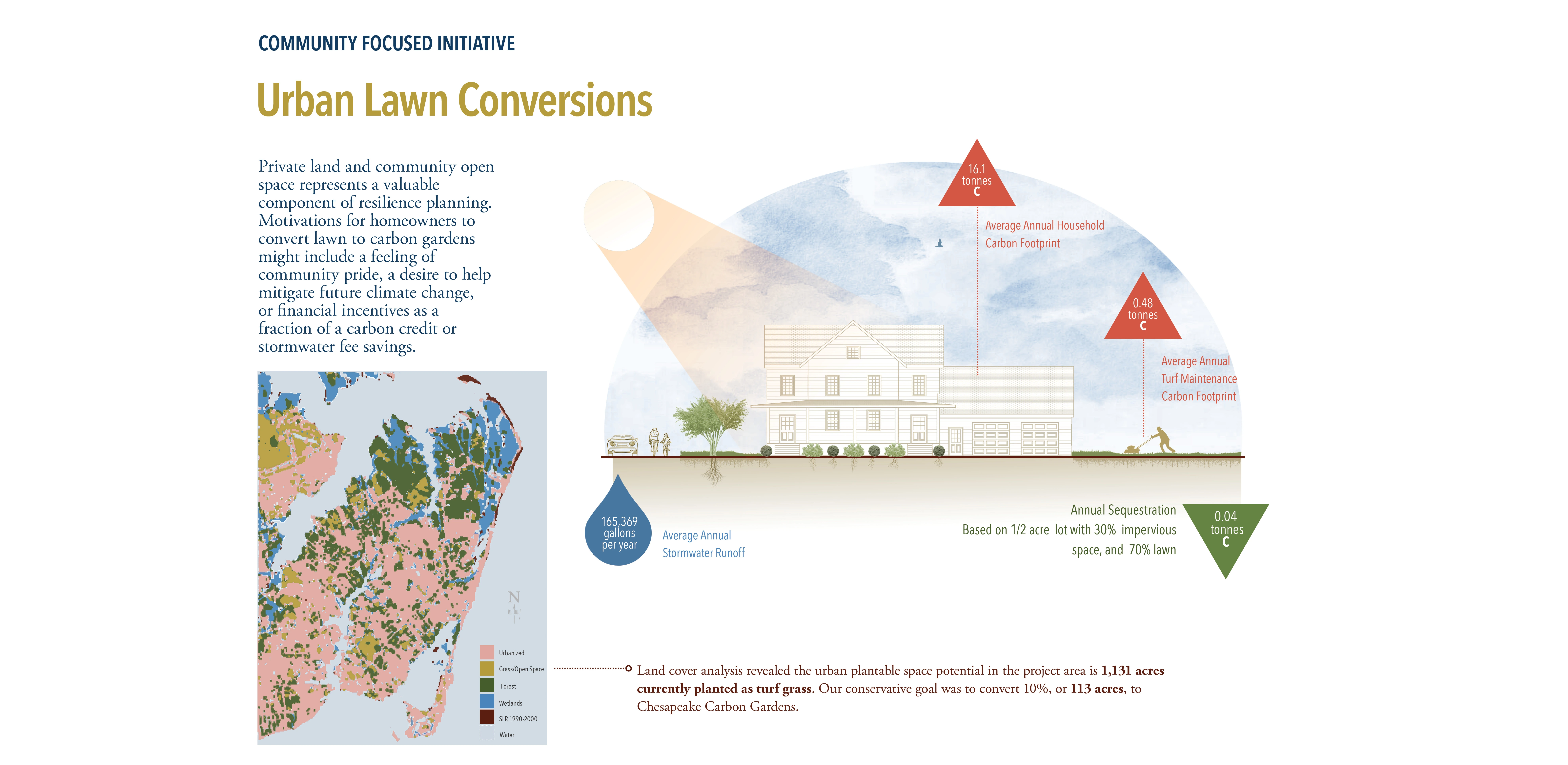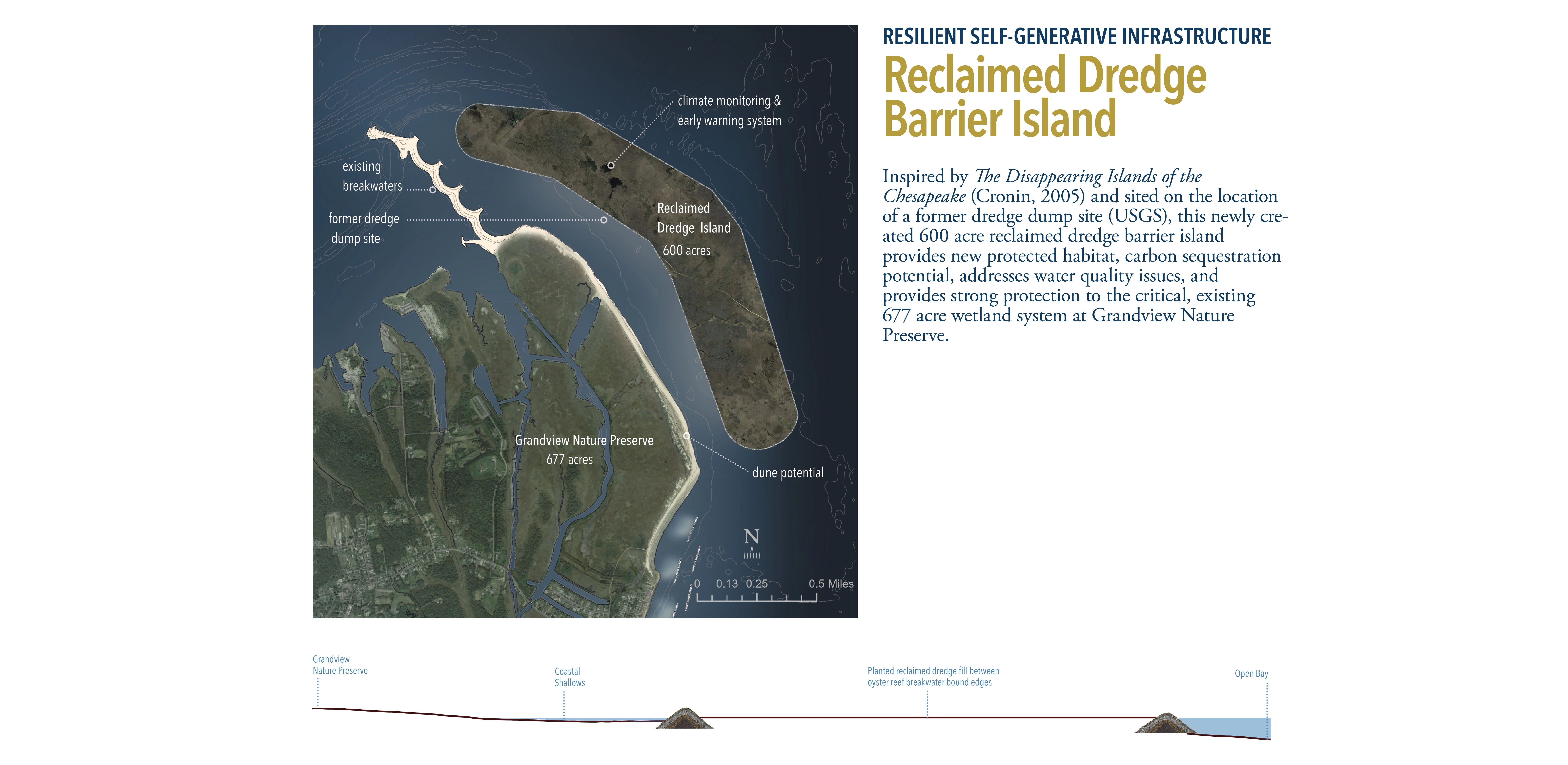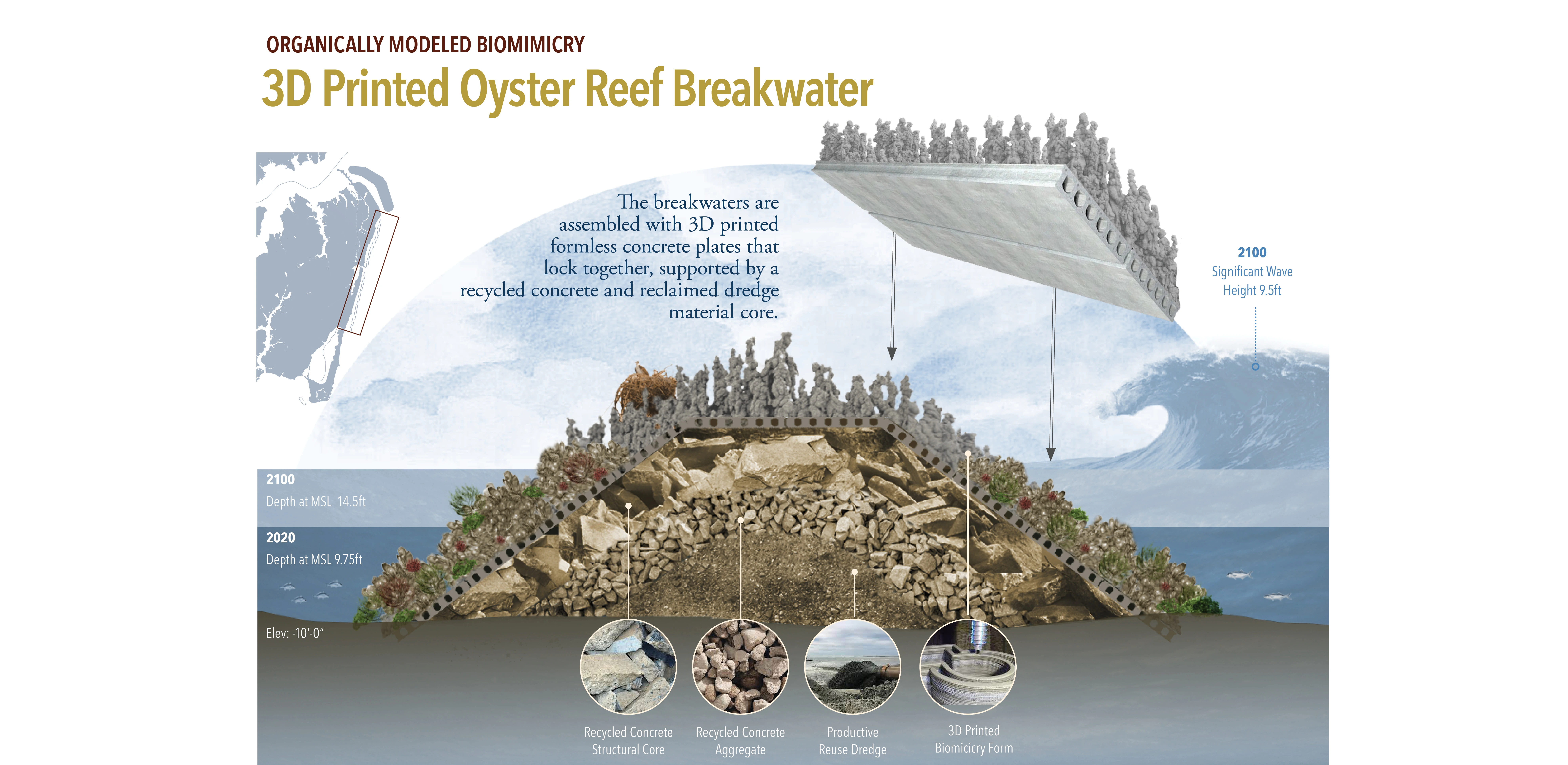 With a team made up of landscape architecture, engineering, environmental science, and political science students, this project proposes innovative solutions to growing coastal problems due to climate change. In addition to creating off-shore breakwaters made up of "3D printed formless concrete plates that lock together, supported by a recycled concrete and reclaimed dredge material core," proposals include converting residential lawns to carbon gardens that sequester carbon and help improve water quality in Tidewater, Virginia. The sophistication of the project is captured in the careful analysis and informative diagrams.