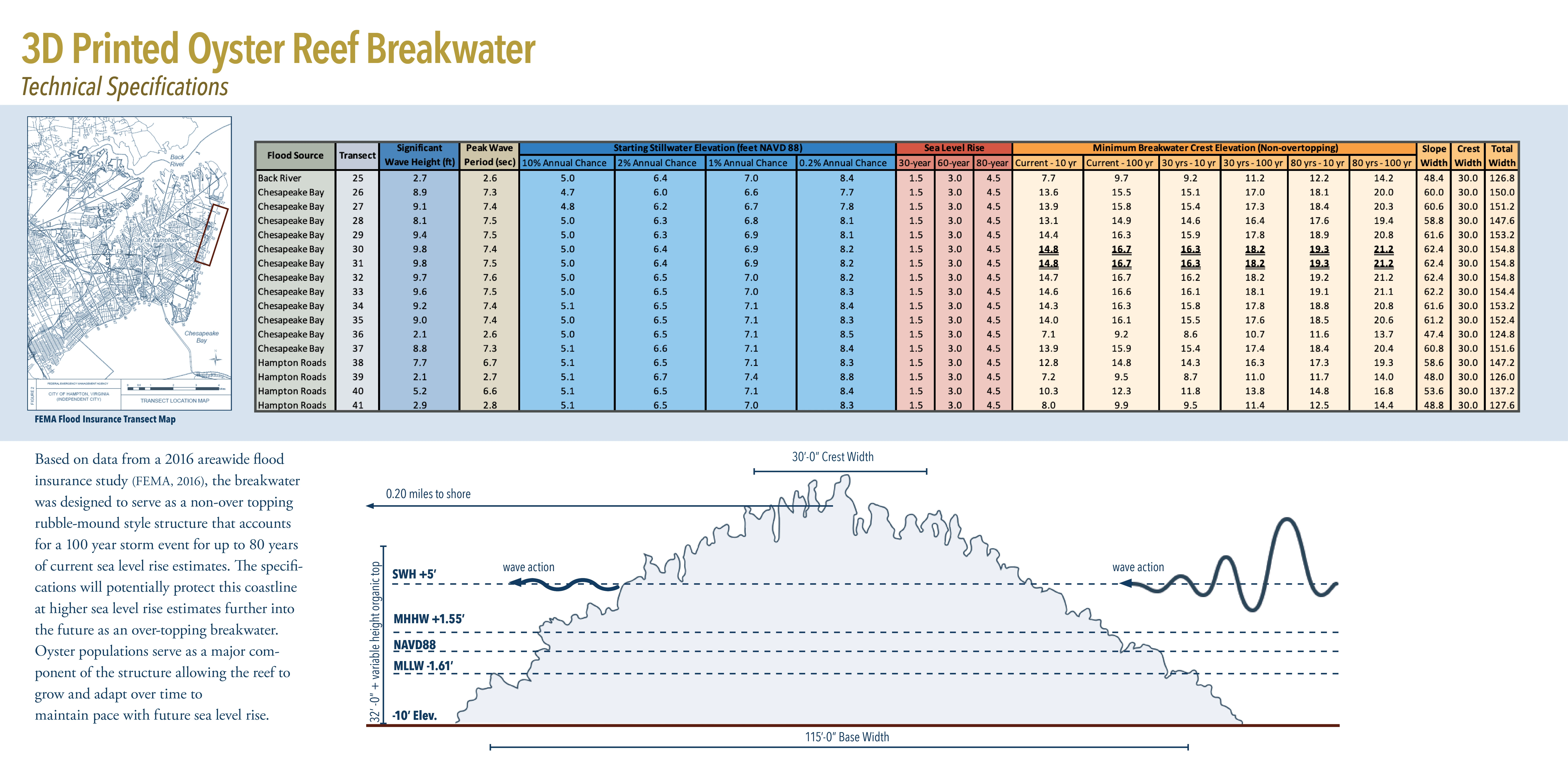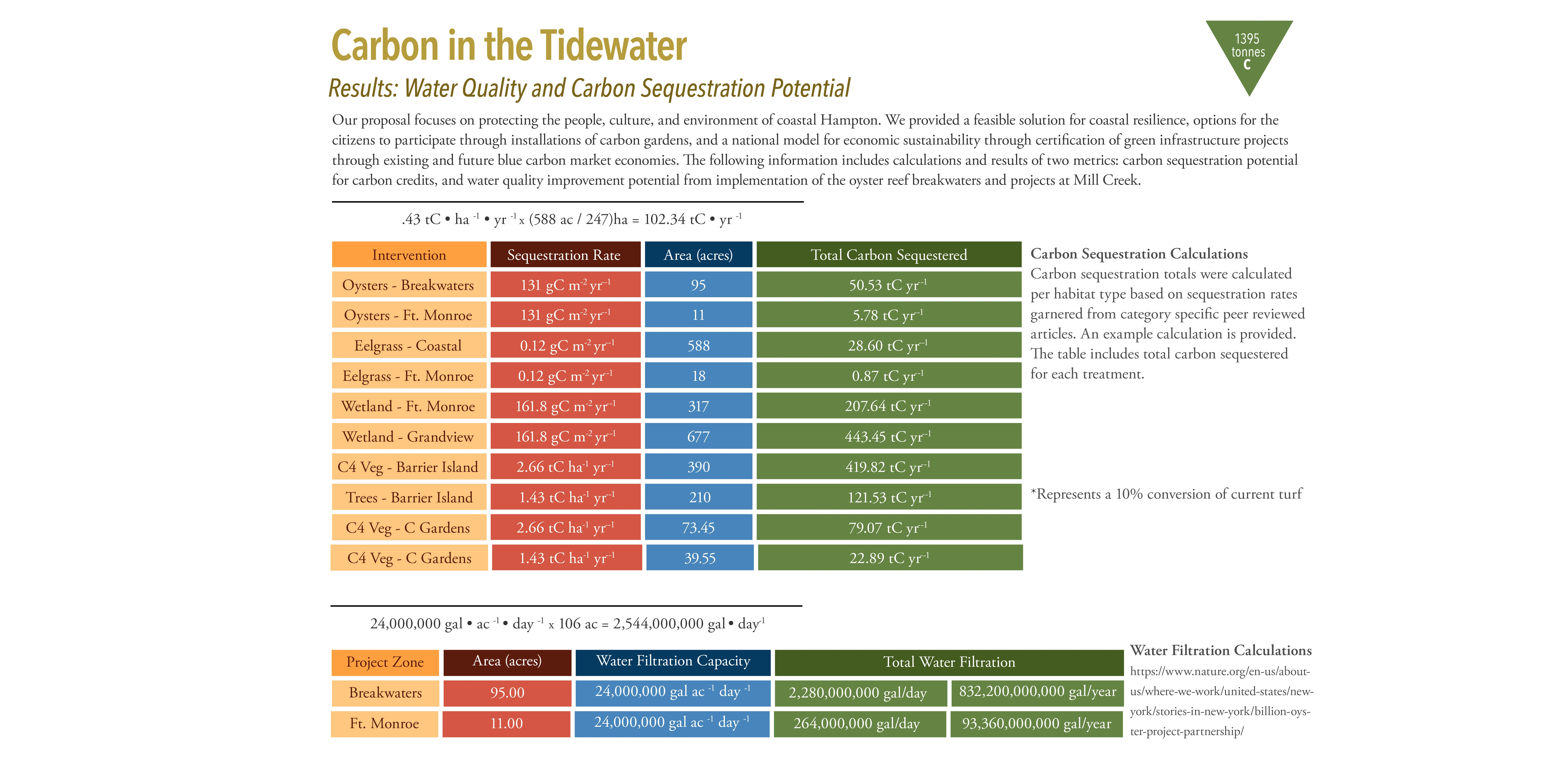 Carbon calculations were performed using the Climate Positive Design Carbon Calculator, the NC State Carbon Footprint Calculator and category-specific permanent carbon sequestration rates based on peer-reviewed published articles. Breakwaters are sized to be non-overtopping through the year 2100 using the 2016 FEMA Flood Insurance Transect Map and Report. The team visited Hampton, and met with community representatives, local business owners, and residents. We shared the Coastal Observer phone application that allowed citizens to document weather and water events and upload geo-located images. This tool allowed us to remain engaged with the community during a distanced process.