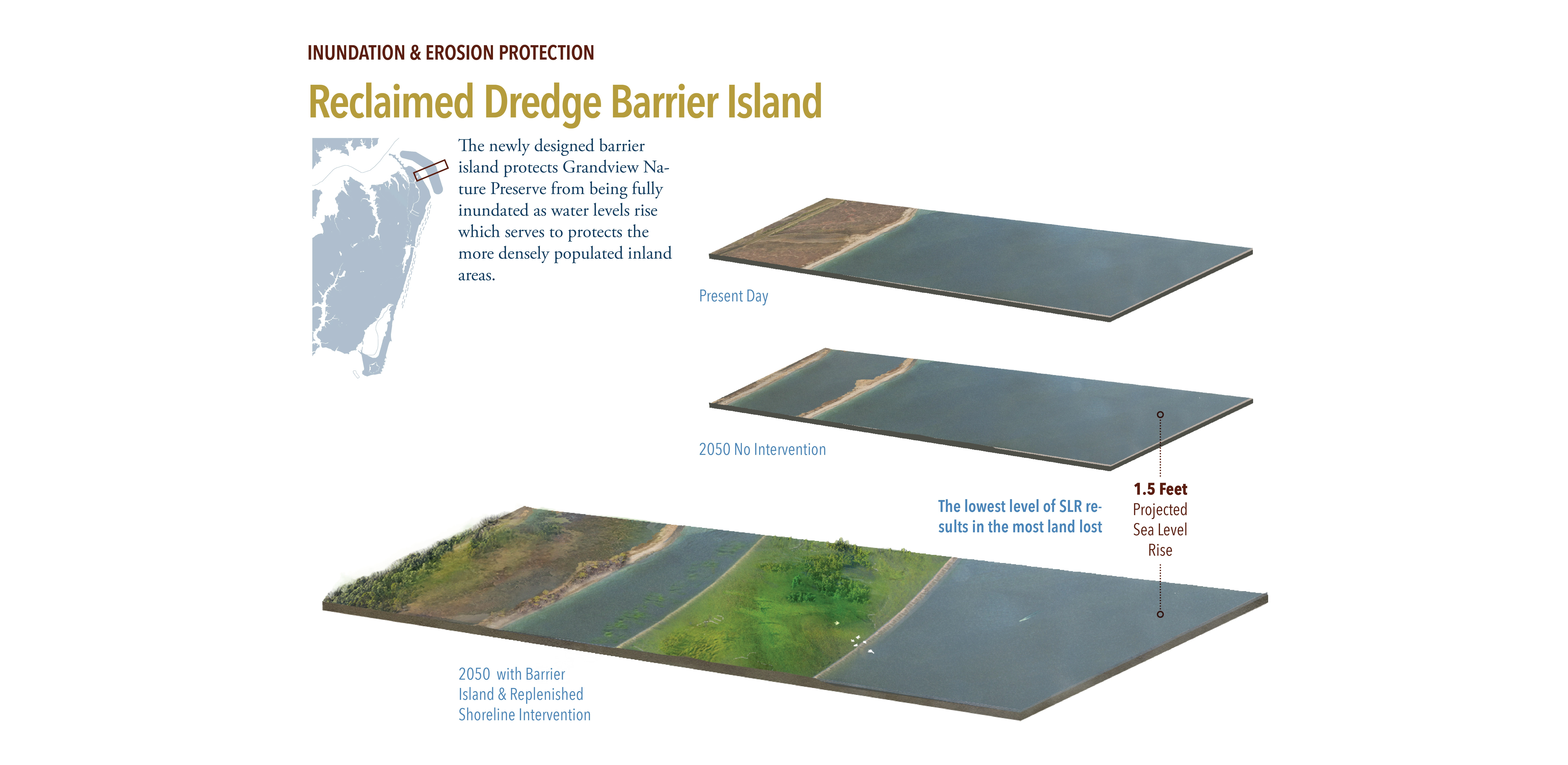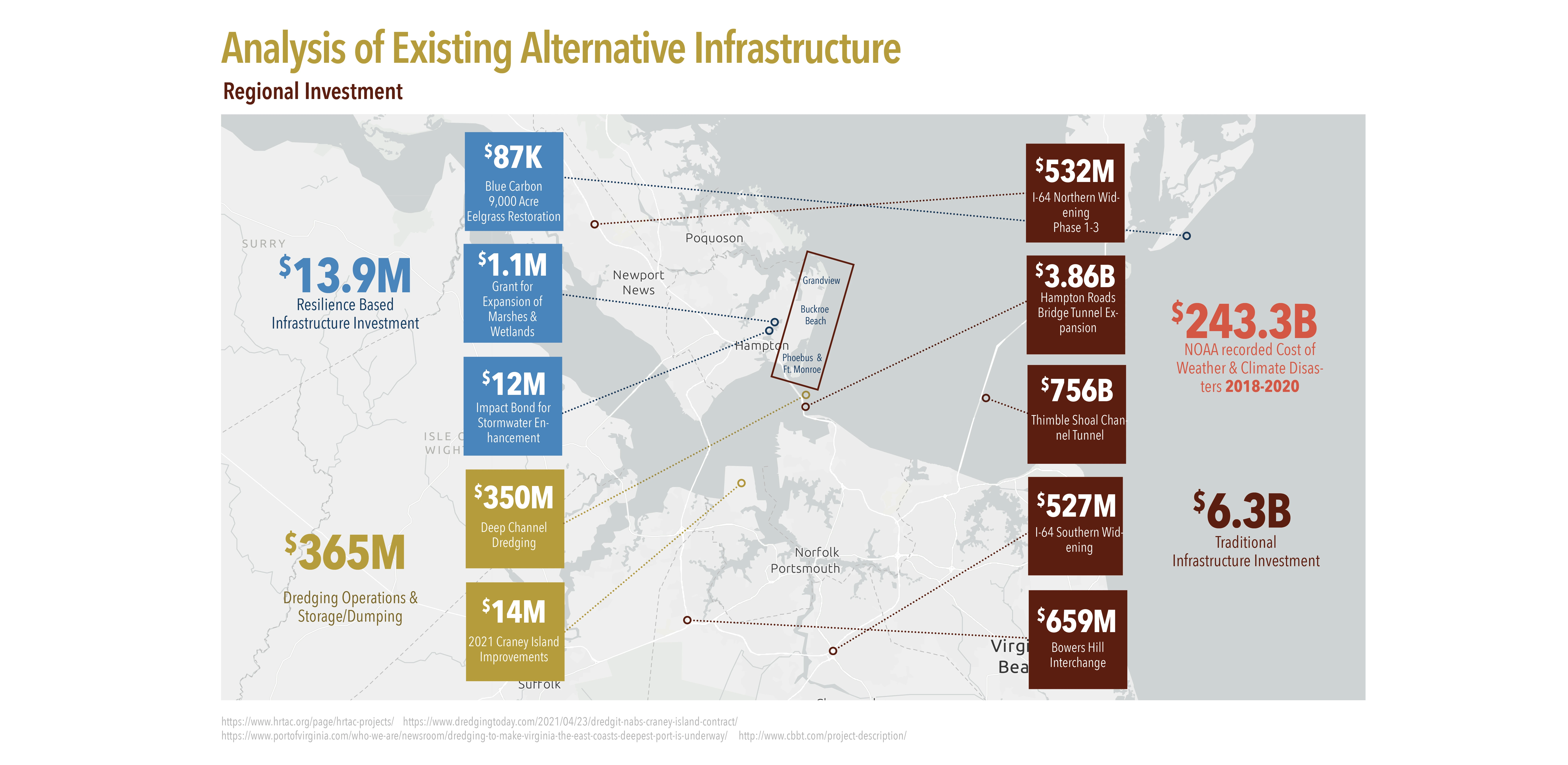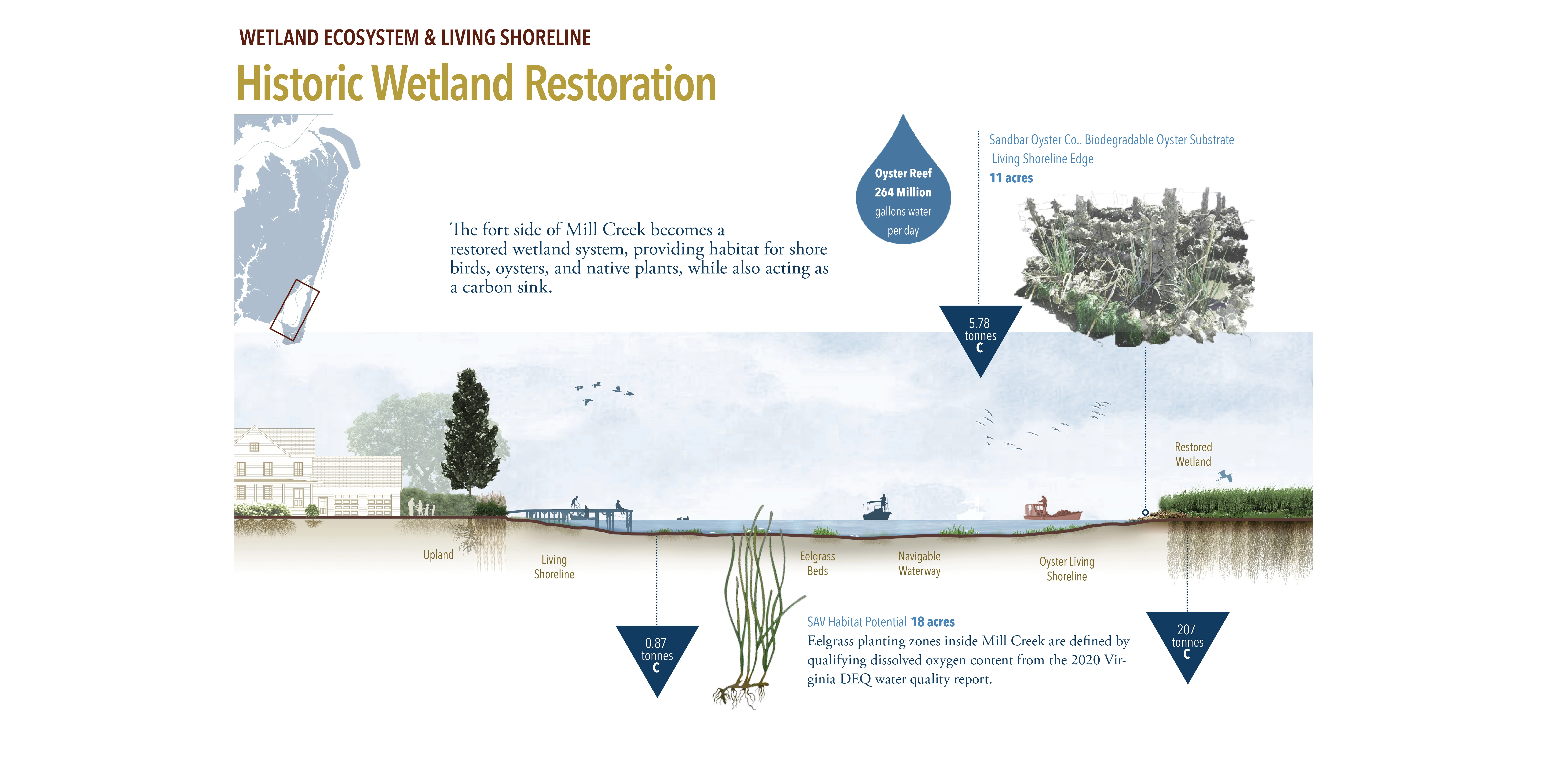 The goal of this project is to create innovative solutions for the city of Hampton, Virginia addressing human and ecological risks associated with climate change for the year 2050 and beyond while also addressing the economic challenges that come with property loss. While many inland flooding projects are currently underway in Hampton, the main objective of this project was to analyze coastal conditions, projections of sea level rise (SLR) and increasing storm surge energy to plan and design ecologically-based infrastructure that continually draws down carbon from the atmosphere. This work considers the economics of nature-based infrastructure funding, water quality concerns that could negatively impact living infrastructure design, and community initiatives to educate and engage homeowners and community leaders.