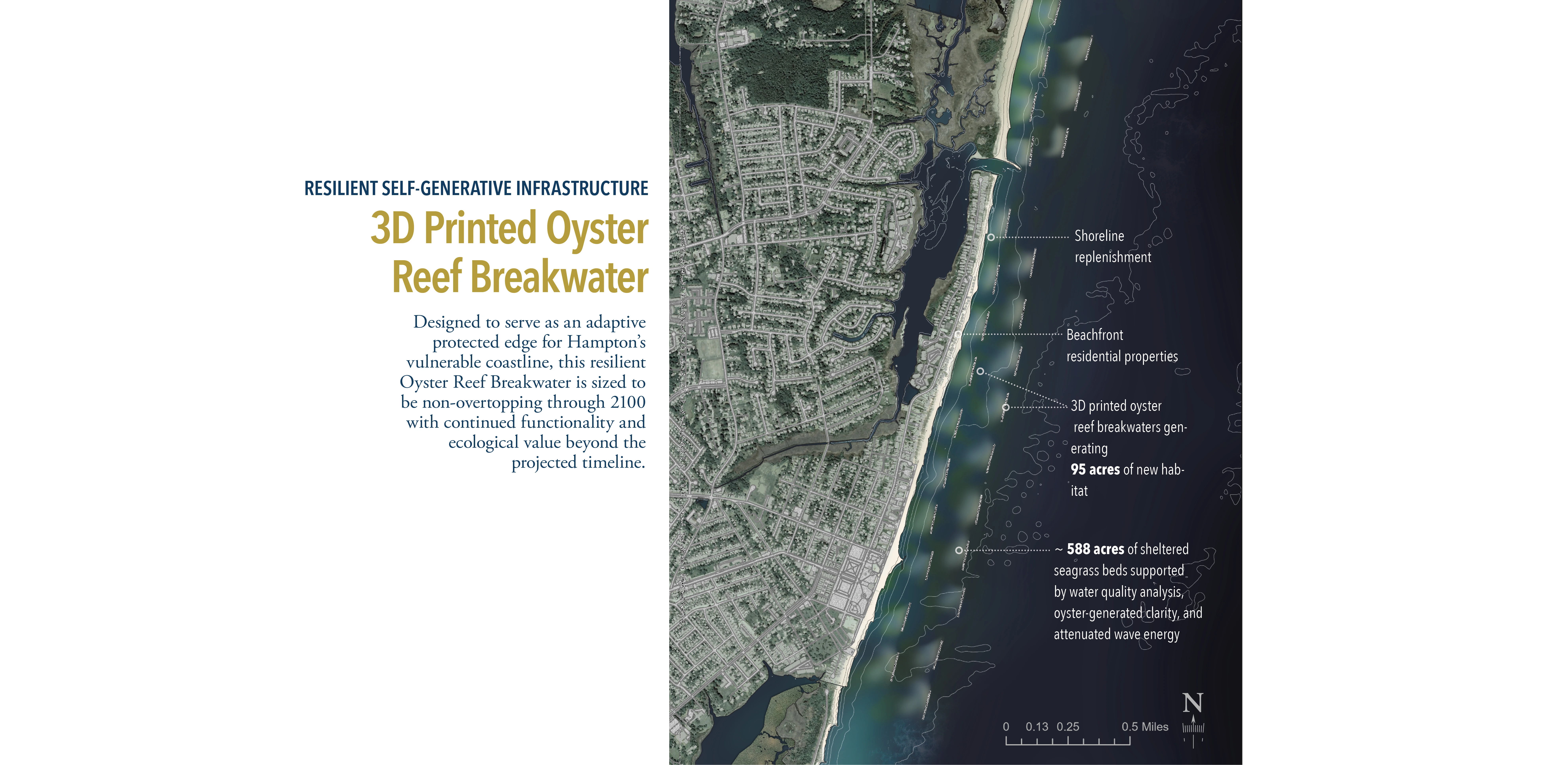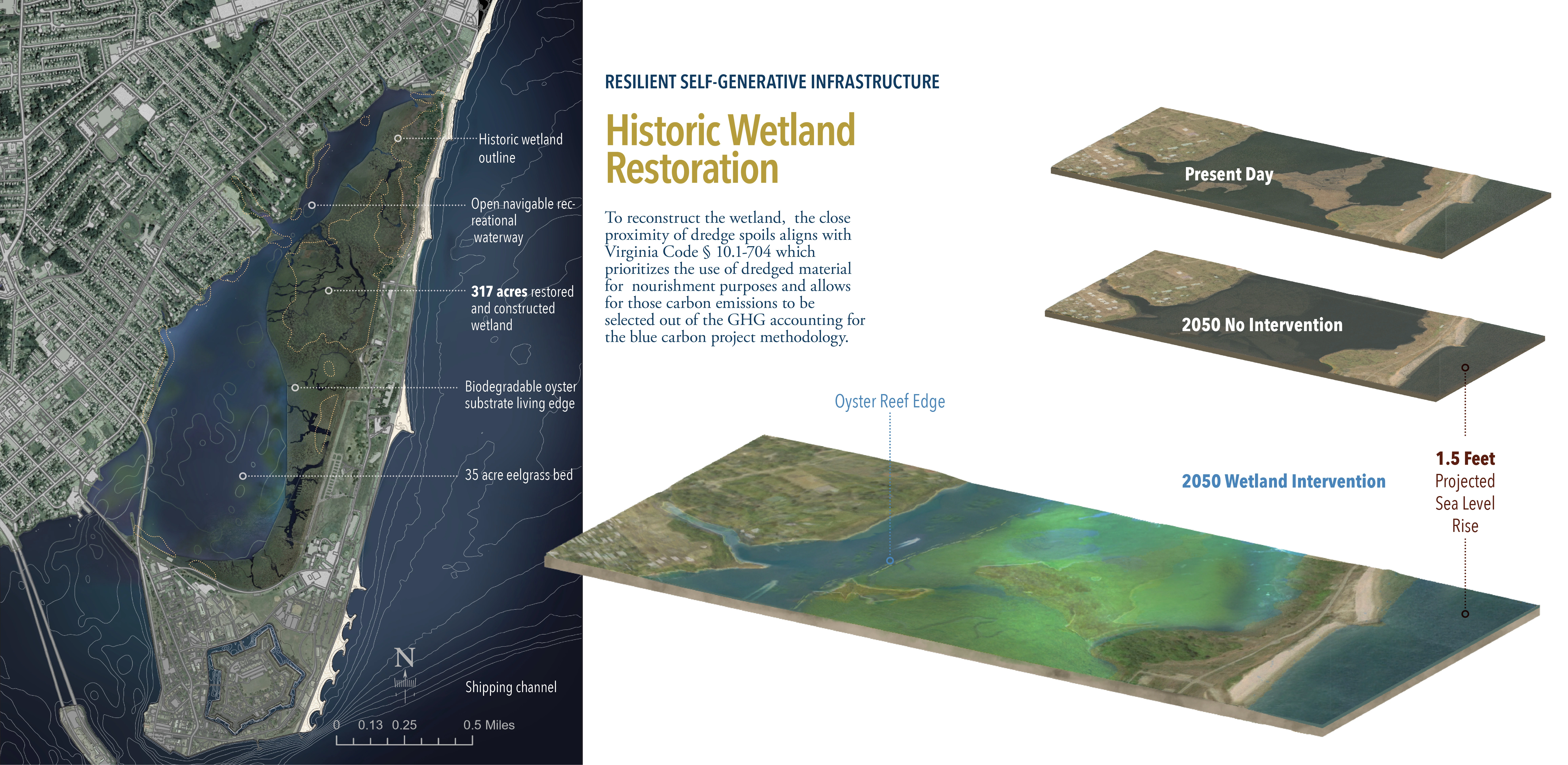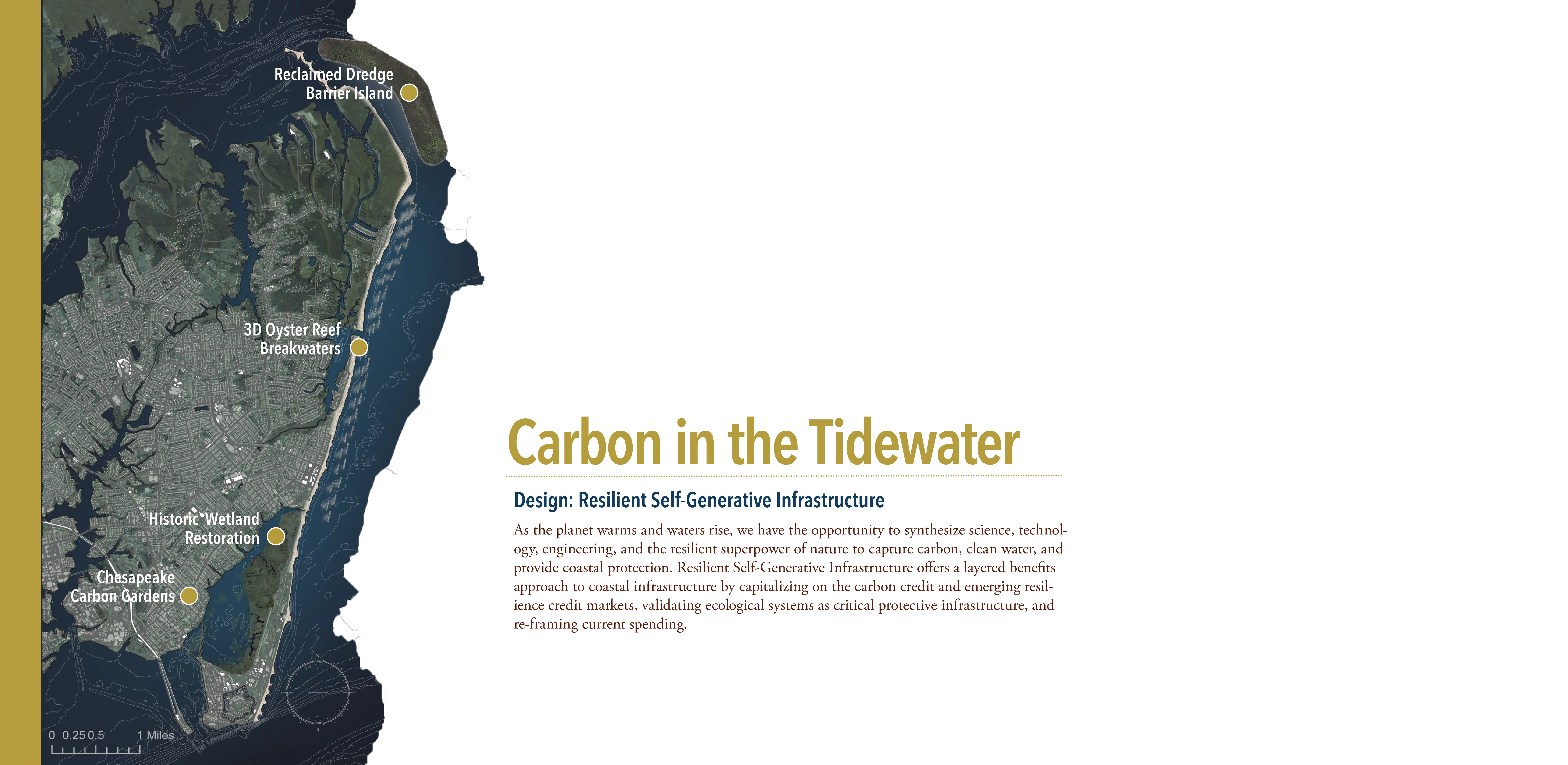 The proposed solutions are based largely on carbon offset and resilience credit project methodologies developed by The Nature Conservancy and Verra, a carbon offset project verifying agency. These methodologies helped to define the scale, scope, and environmental context of all the design solutions. Virginia joined the voluntary carbon market in 2020 and is nearing completion of a carbon offset project just off its eastern shore. Larger in scale, and including a resilience credit market that is currently in the development phase, Carbon in the Tidewater uses a multi-layered approach to address coastal issues in a holistic way by protecting, restoring, and creating new ecological communities and systems.The team projected technological advances in structural 3D printing allowing for organically-modeled, biomimicry-based oyster reef construction that has the potential to be structural, resilient, and self-regenerative. It is designed to mitigate intense wave energy during storm events but continue to be a source of ecological value if sea levels rise beyond projections. A shipping and military channel maintained at depths of roughly 90 feet offers a nearby source of productive dredge spoils that can be reused in barrier island creation and wetland restoration efforts. Additionally, productive reuse of dredge spoils eliminates storage and disposal costs while also protecting existing valuable natural resources. The team designed community carbon gardens to reframe native plant palettes as a tangible contribution to the climate crisis in both public and private space. Ultimately, this project works to reframe protective living infrastructure as an economic driver to encourage investment and continued maintenance.