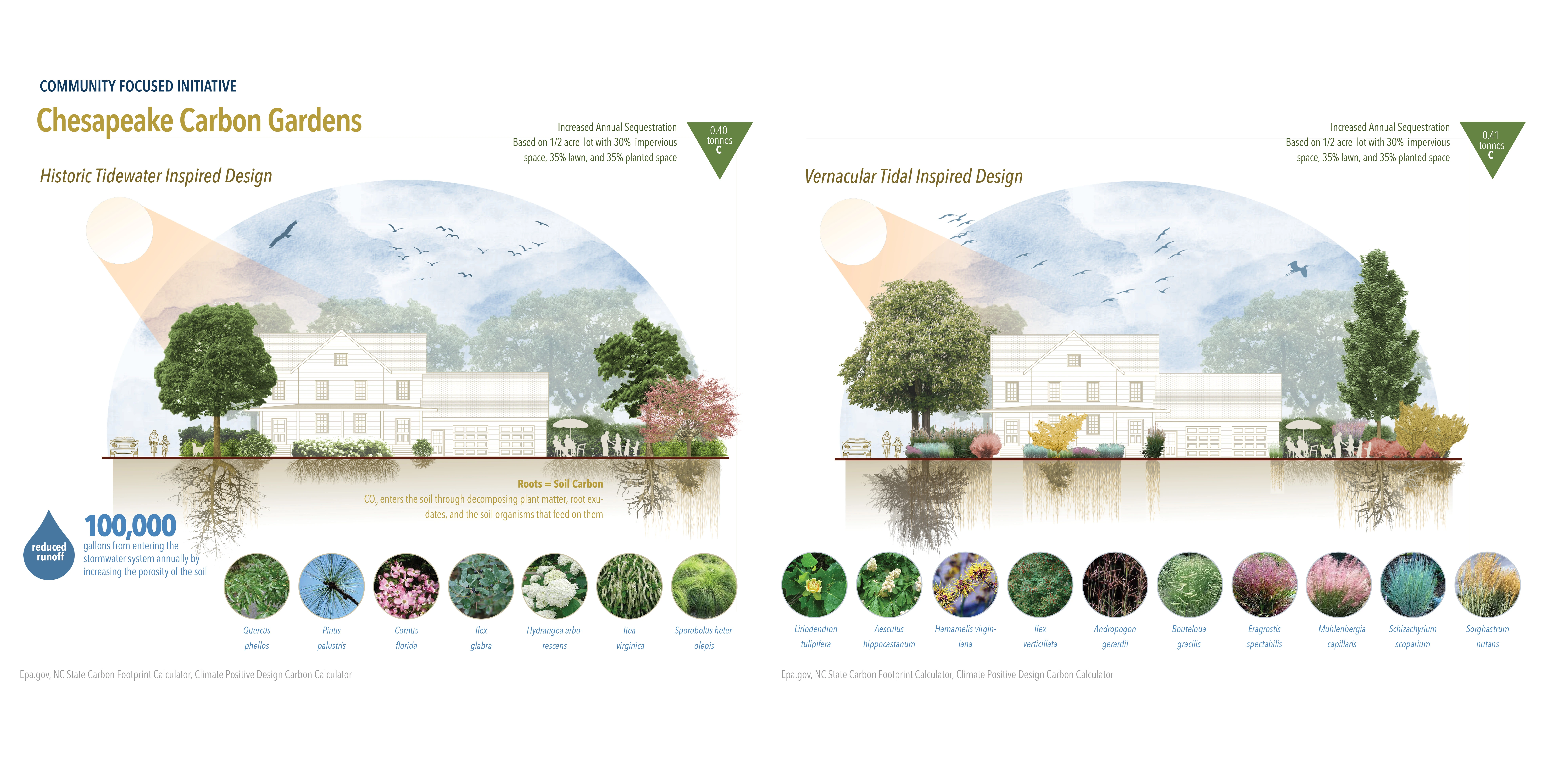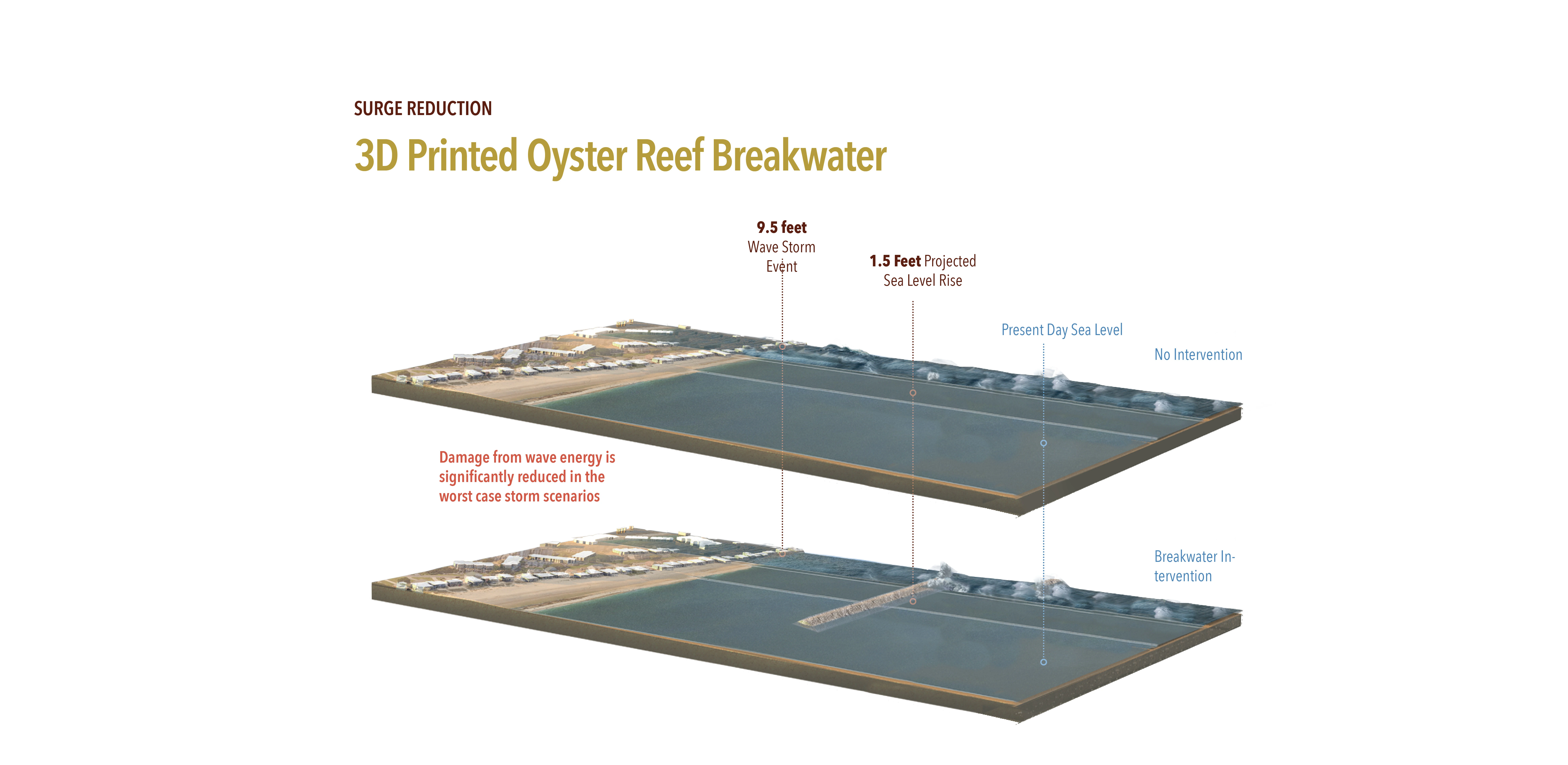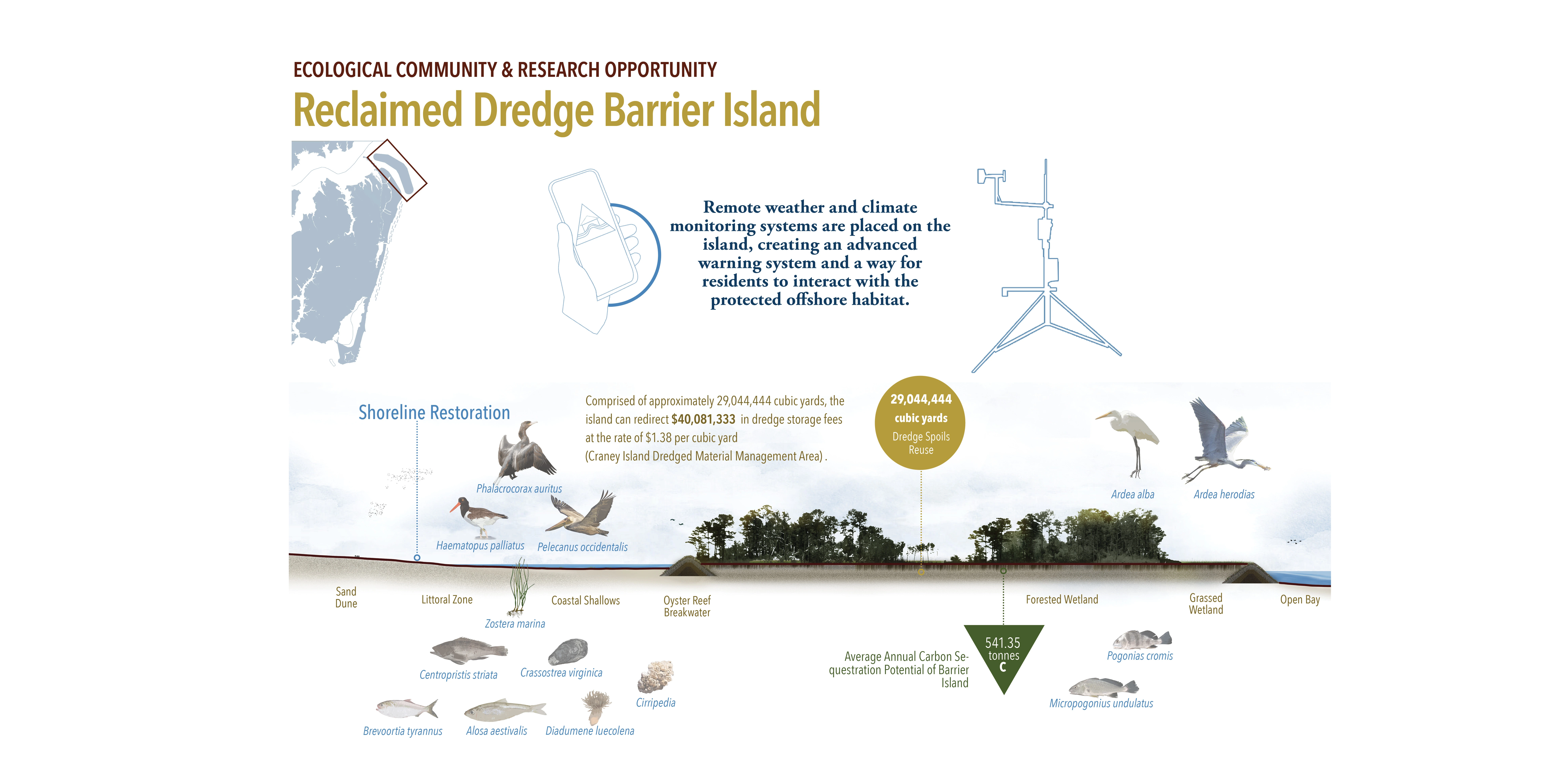 The proposed solutions are based largely on carbon offset and resilience credit project methodologies developed by The Nature Conservancy and Verra, a carbon offset project verifying agency. These methodologies helped to define the scale, scope, and environmental context of all the design solutions. Virginia joined the voluntary carbon market in 2020 and is nearing completion of a carbon offset project just off its eastern shore. Larger in scale, and including a resilience credit market that is currently in the development phase, Carbon in the Tidewater uses a multi-layered approach to address coastal issues in a holistic way by protecting, restoring, and creating new ecological communities and systems.The team projected technological advances in structural 3D printing allowing for organically-modeled, biomimicry-based oyster reef construction that has the potential to be structural, resilient, and self-regenerative. It is designed to mitigate intense wave energy during storm events but continue to be a source of ecological value if sea levels rise beyond projections. A shipping and military channel maintained at depths of roughly 90 feet offers a nearby source of productive dredge spoils that can be reused in barrier island creation and wetland restoration efforts. Additionally, productive reuse of dredge spoils eliminates storage and disposal costs while also protecting existing valuable natural resources. The team designed community carbon gardens to reframe native plant palettes as a tangible contribution to the climate crisis in both public and private space. Ultimately, this project works to reframe protective living infrastructure as an economic driver to encourage investment and continued maintenance.