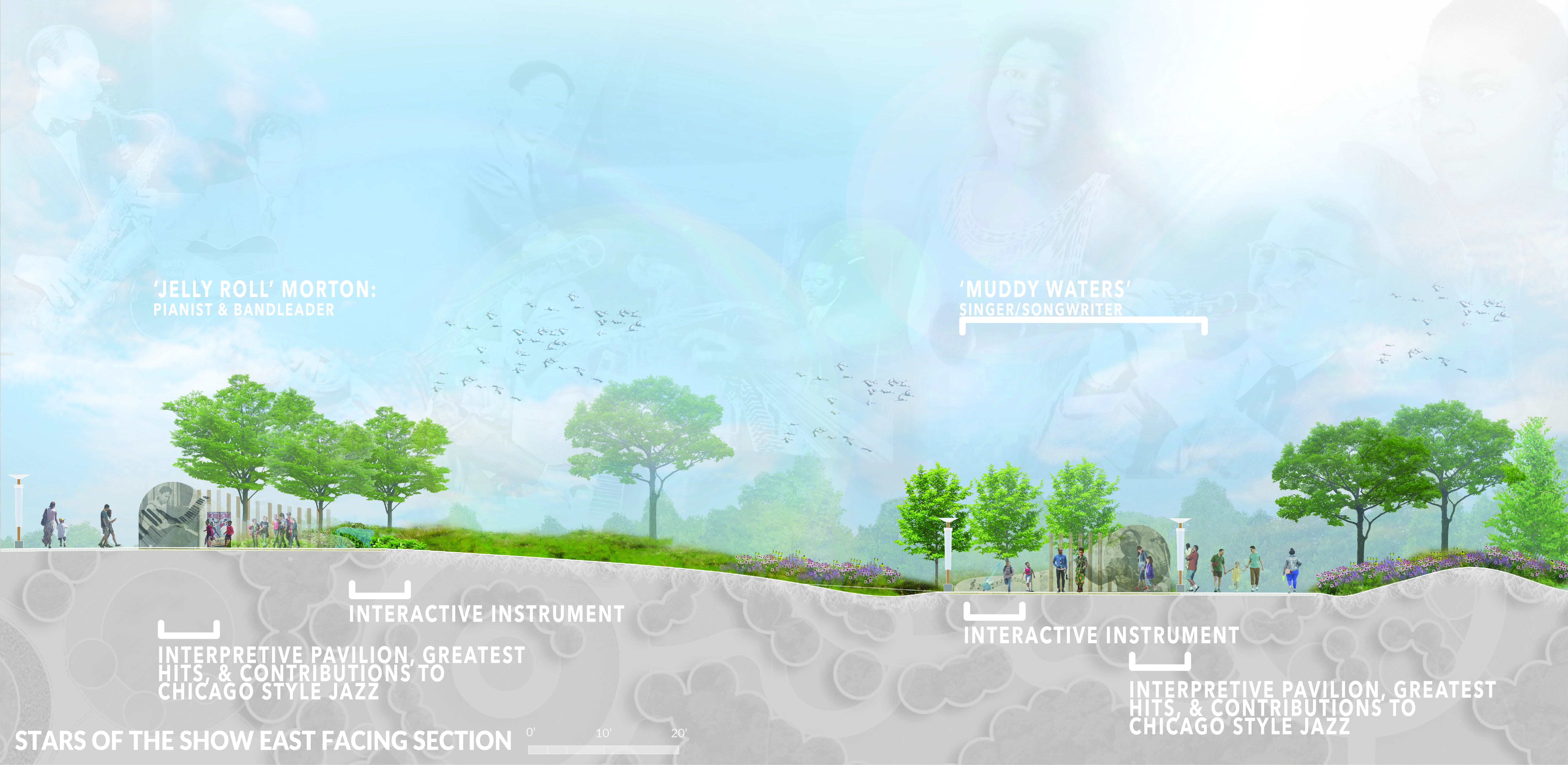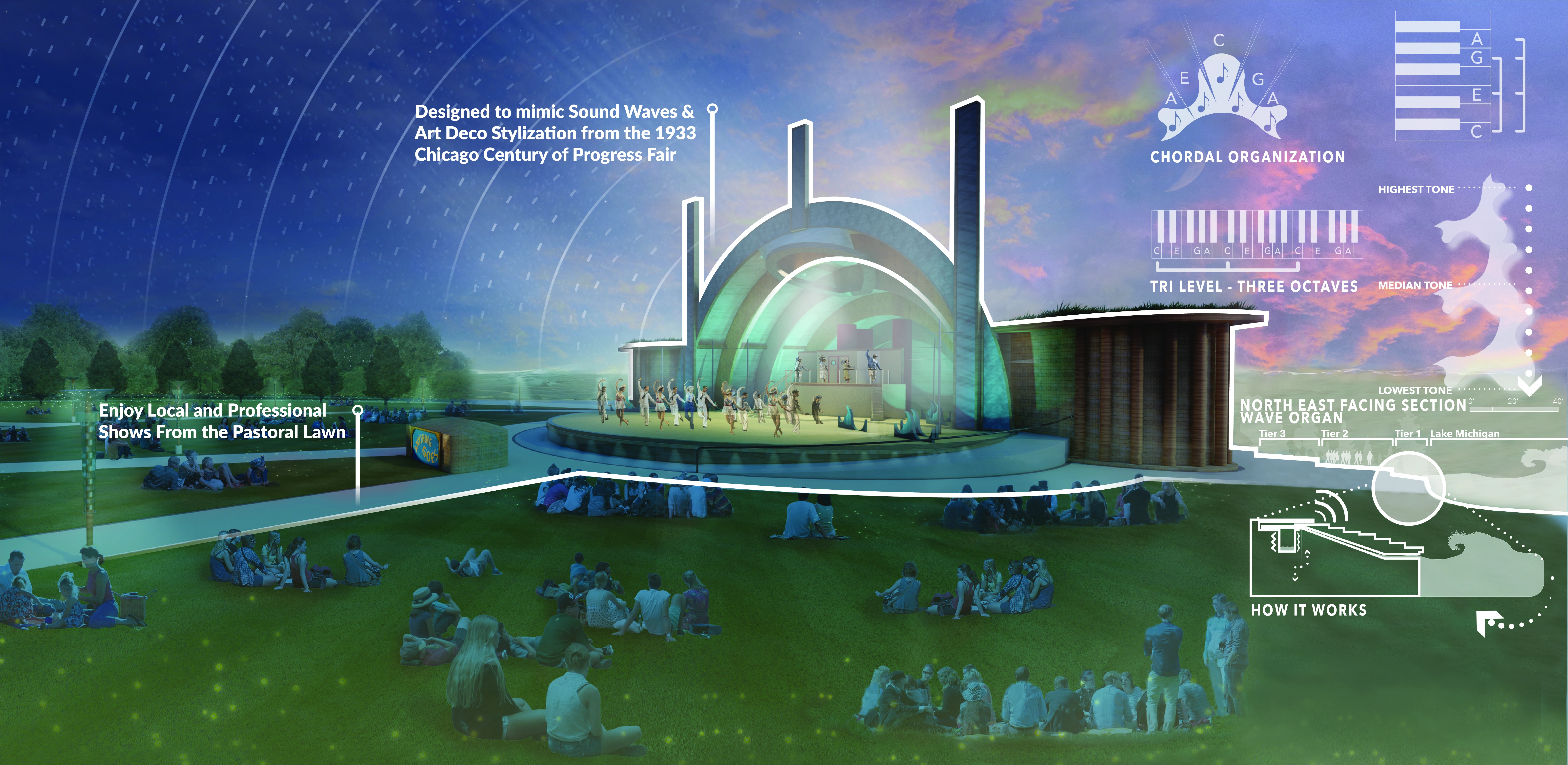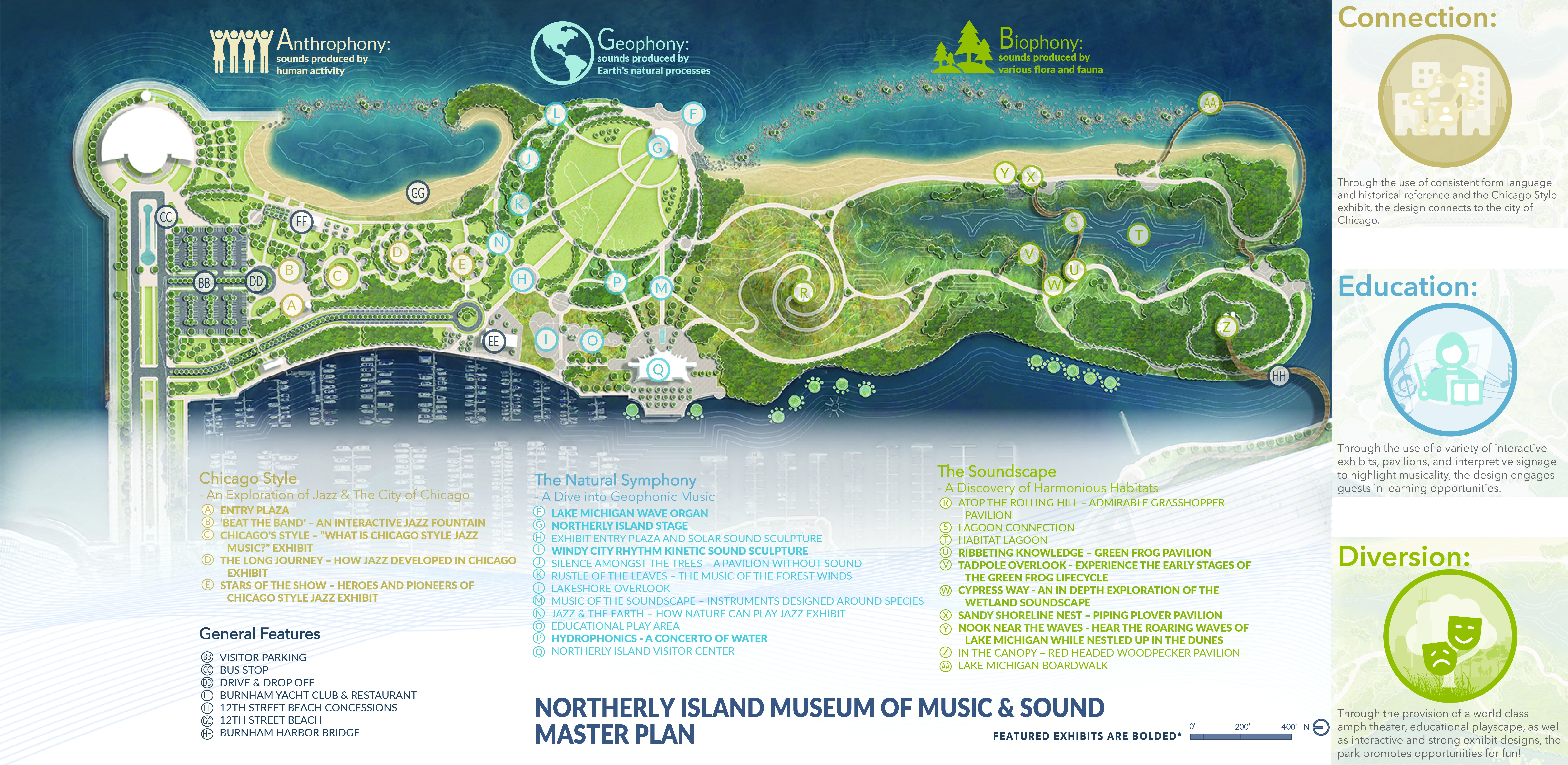 Chicago, Illinois lacked an educational and entertaining outdoor destination, one that could be utilized and capitalized upon by visitors as well as its residents. One that would provide a unique greenspace amenity to the city and surrounding community. By transforming Northerly Island Park into an Interactive Outdoor Music and Sound Museum, it solves the aforementioned problems while simultaneously highlighting how our planet is a musical force. The Earth has always been an inspiration for the arts, especially pertaining to music. Over the past few centuries many symphonies and musical pieces have been directly inspired by nature, such as the “Flight of the Bumblebee” by Nikolai Rimsky-Kirsakov, Ludiwg van Beethoven’s “Pastoral Symphony,” and many others. Nature inspires music, simply because nature is a musical force. This proposal demonstrates the connection nature has to music, using soundscapes, sound sculptures, and interactive exhibits, that highlight the importance of maintaining and appreciating our planet in the process.