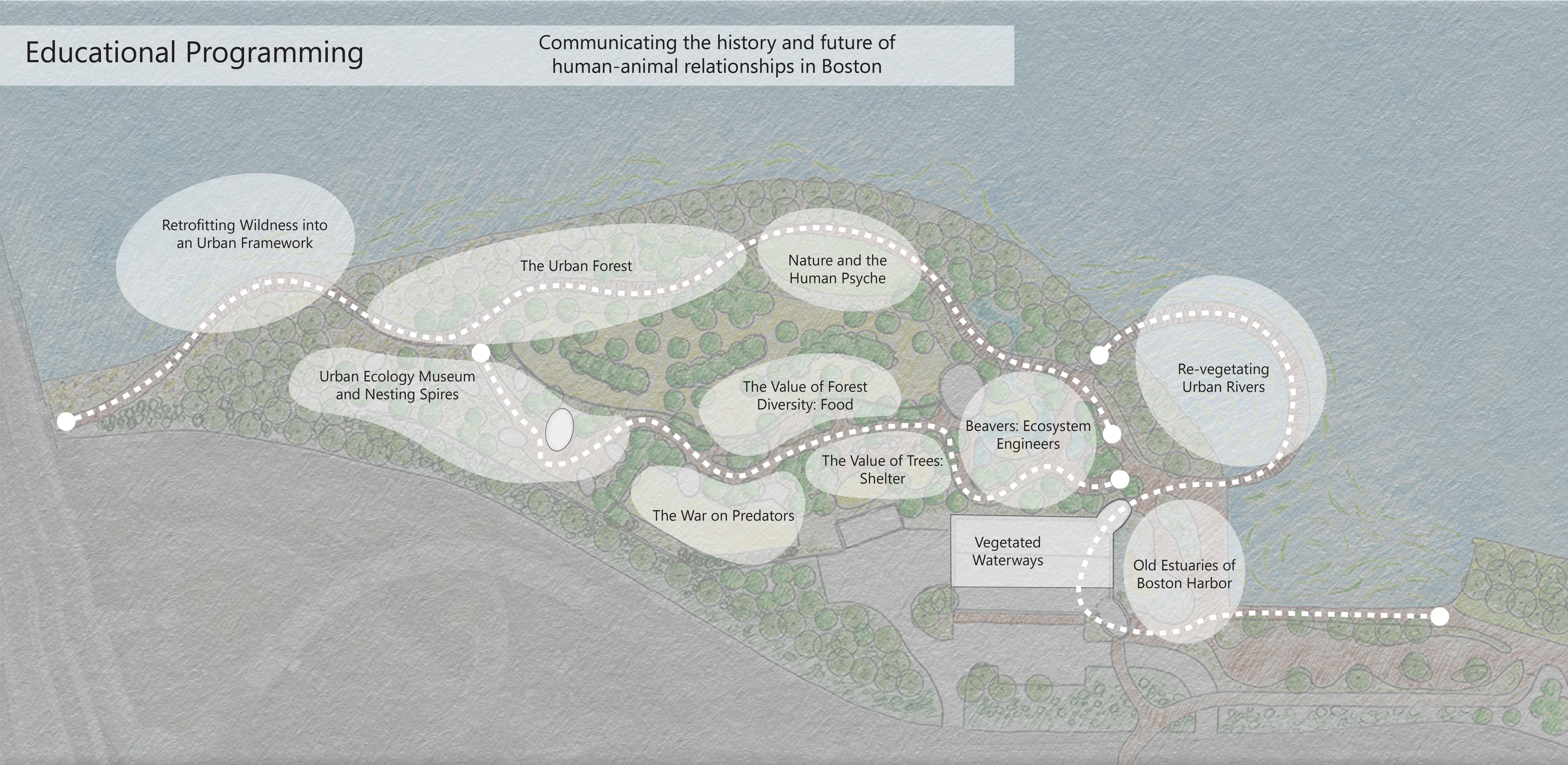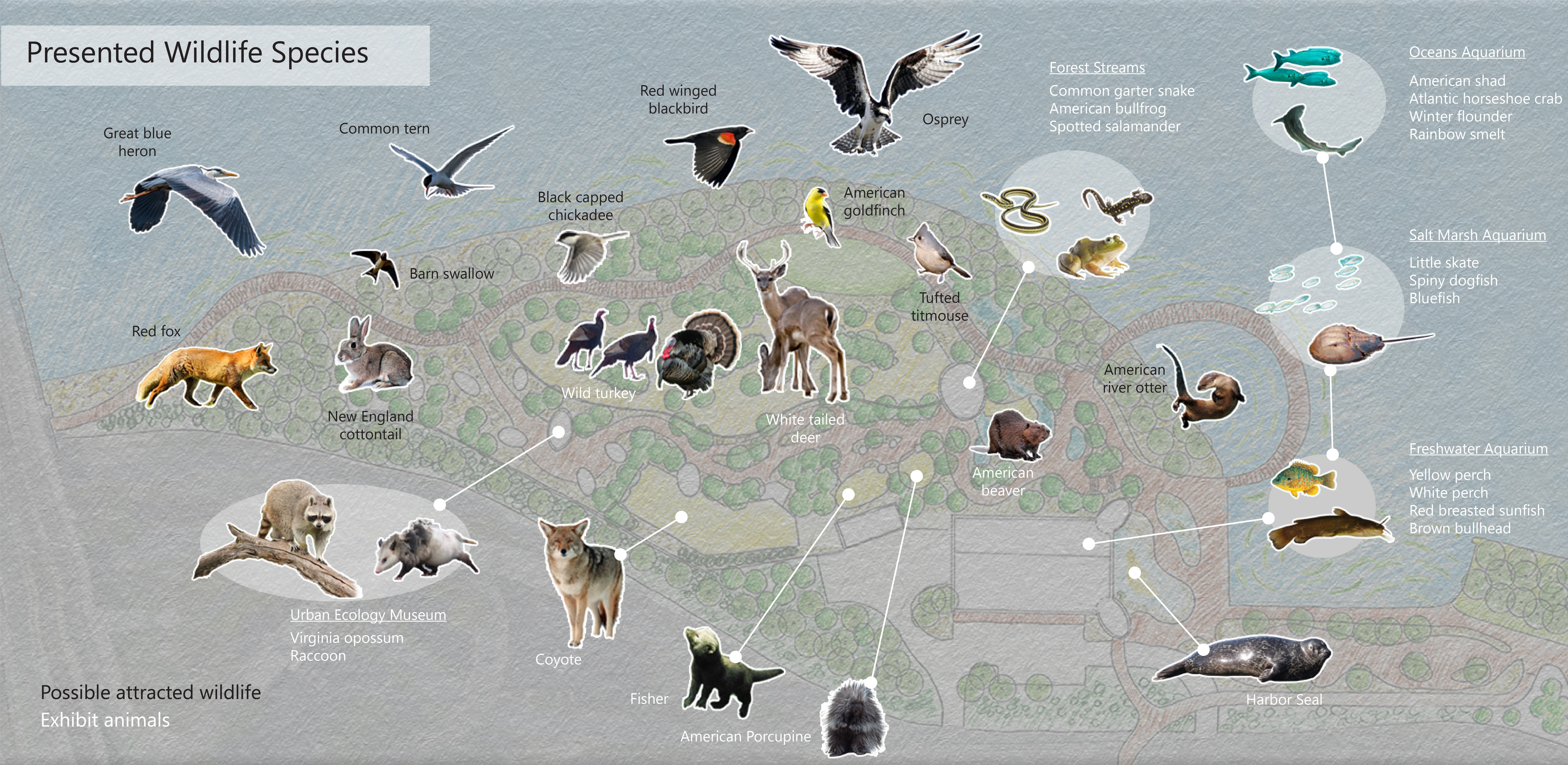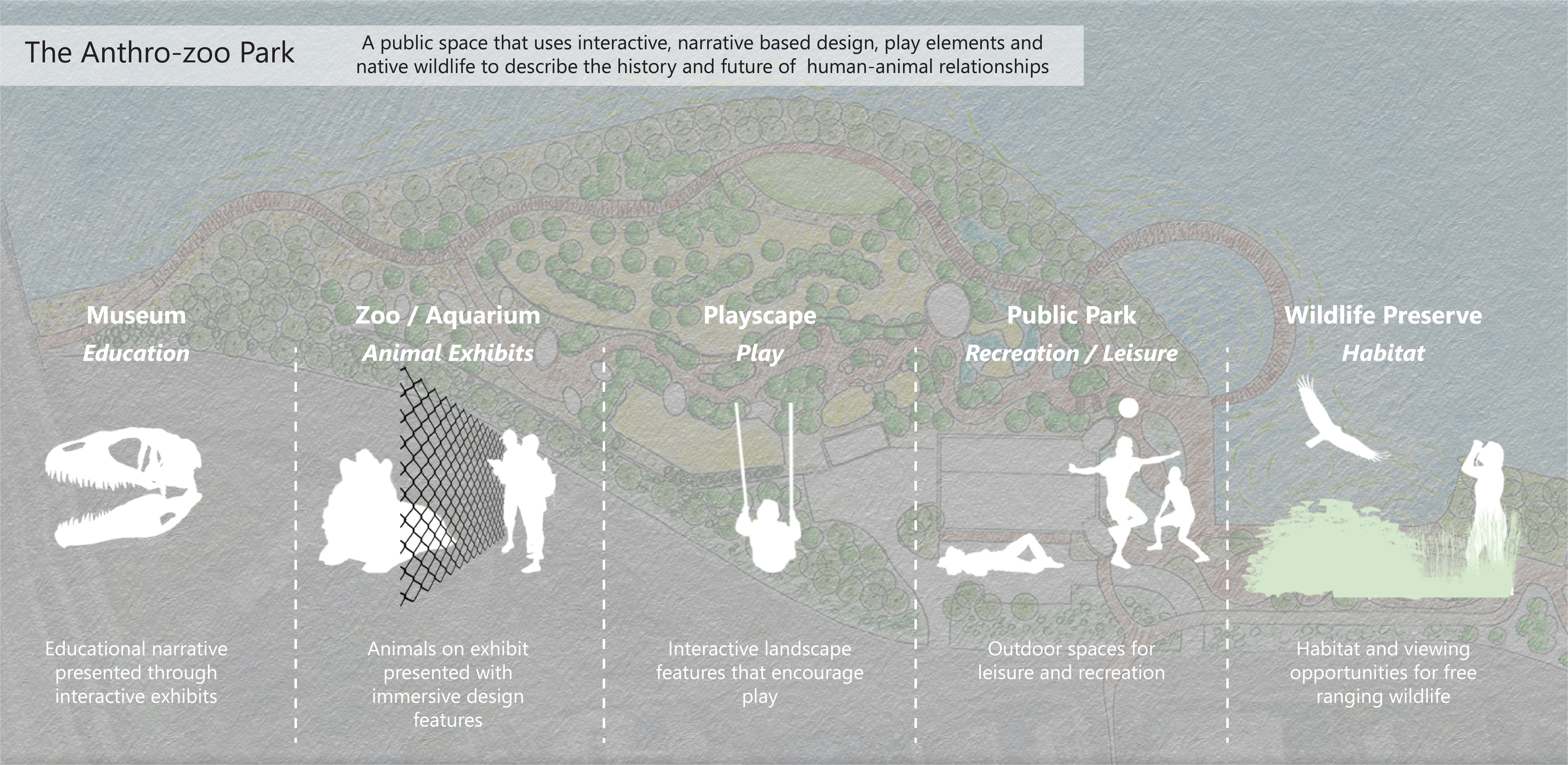 Boston Anthro-zoo Park (BAZP) is designed to reconnect urban people with the ecosystems that previously existed and currently exist in and around Boston. This project integrates functional wildlife habitat, public leisure space, interactive playscapes and interpretive displays into the conventional zoo exhibit model. Using the site and its context for inspiration, a narrative is built and conveyed showing the human-animal interactions throughout Boston's development. By presenting wildlife through different stages of Boston’s development, users are taught how specific alterations to the environment have affected ecosystems. This form of presentation exposes users to topics in ecology using a familiar environment to enhance understanding of the ideas presented. The goal of this narrative is to teach users how humans have altered specific environments, how those changes have affected ecosystems and how we can continue to alter our environment in a way that benefits wildlife.