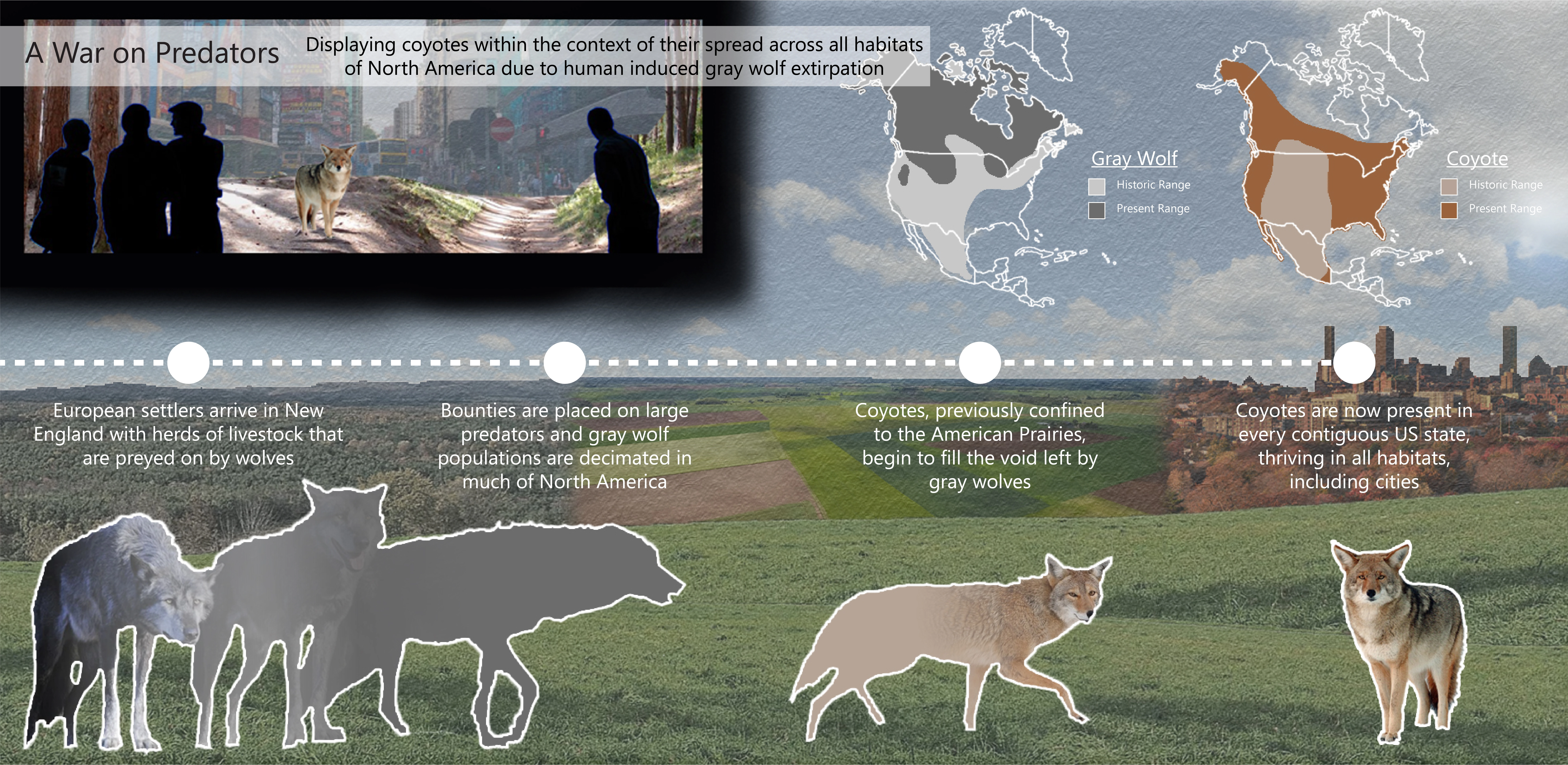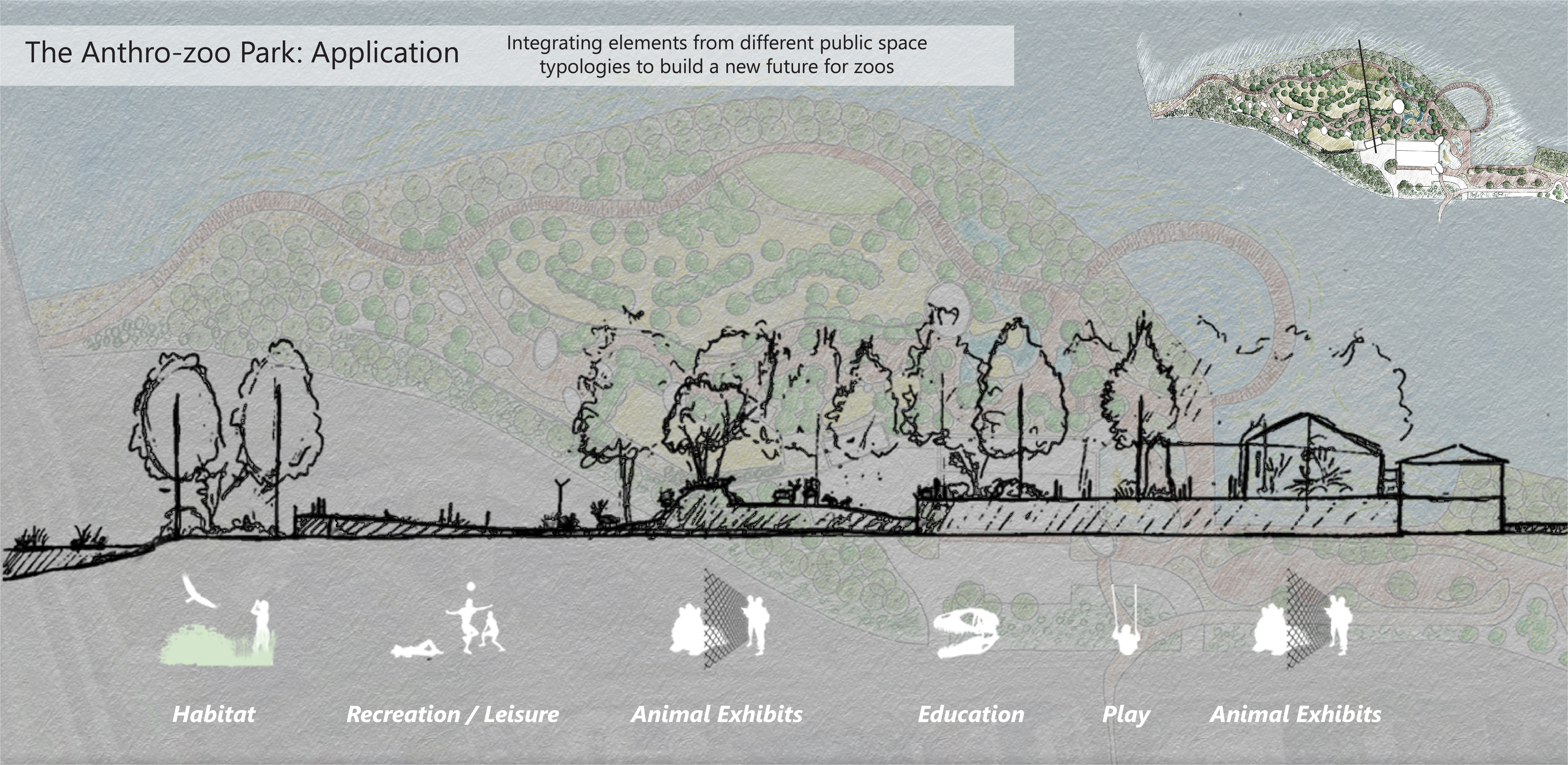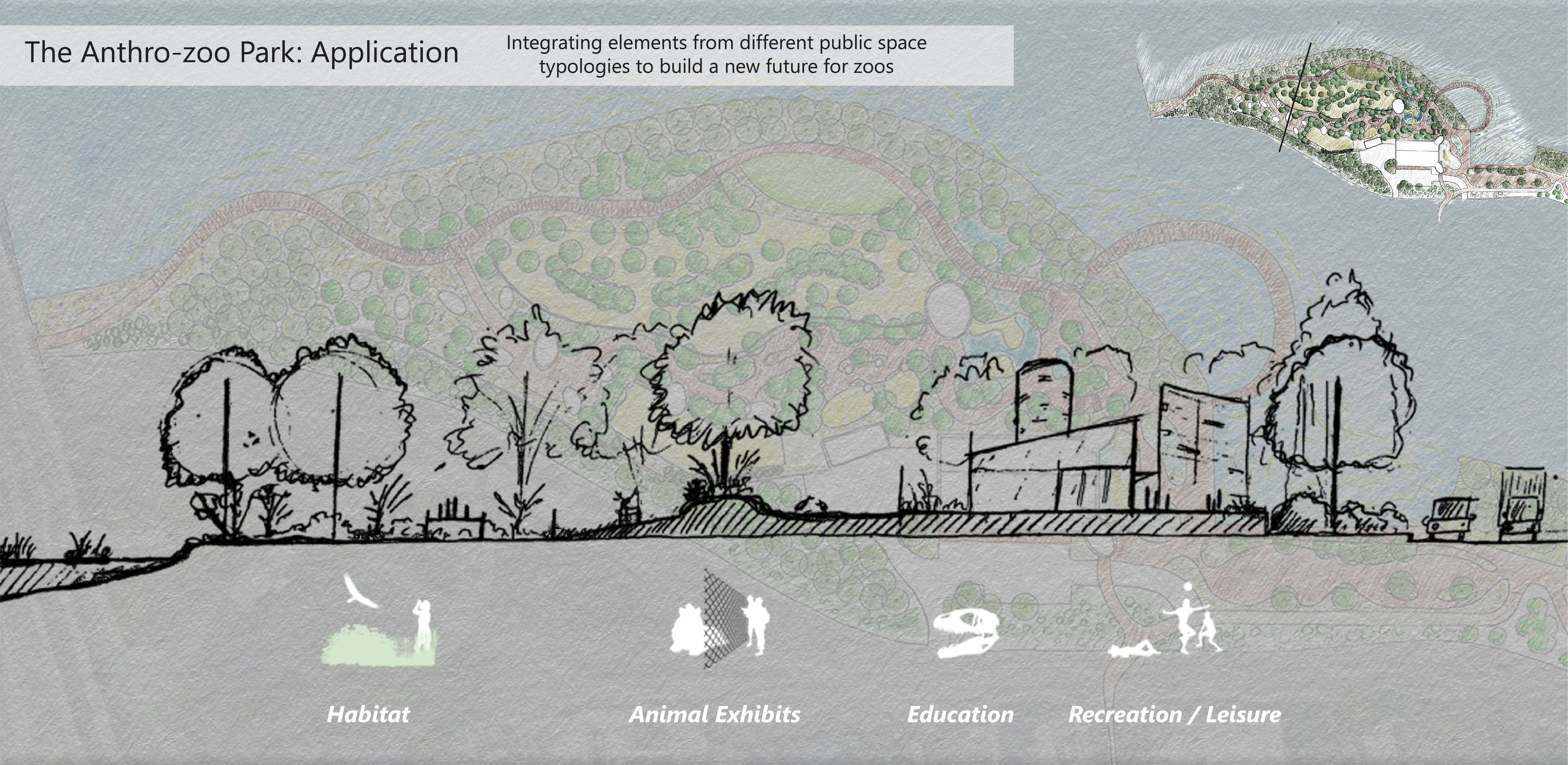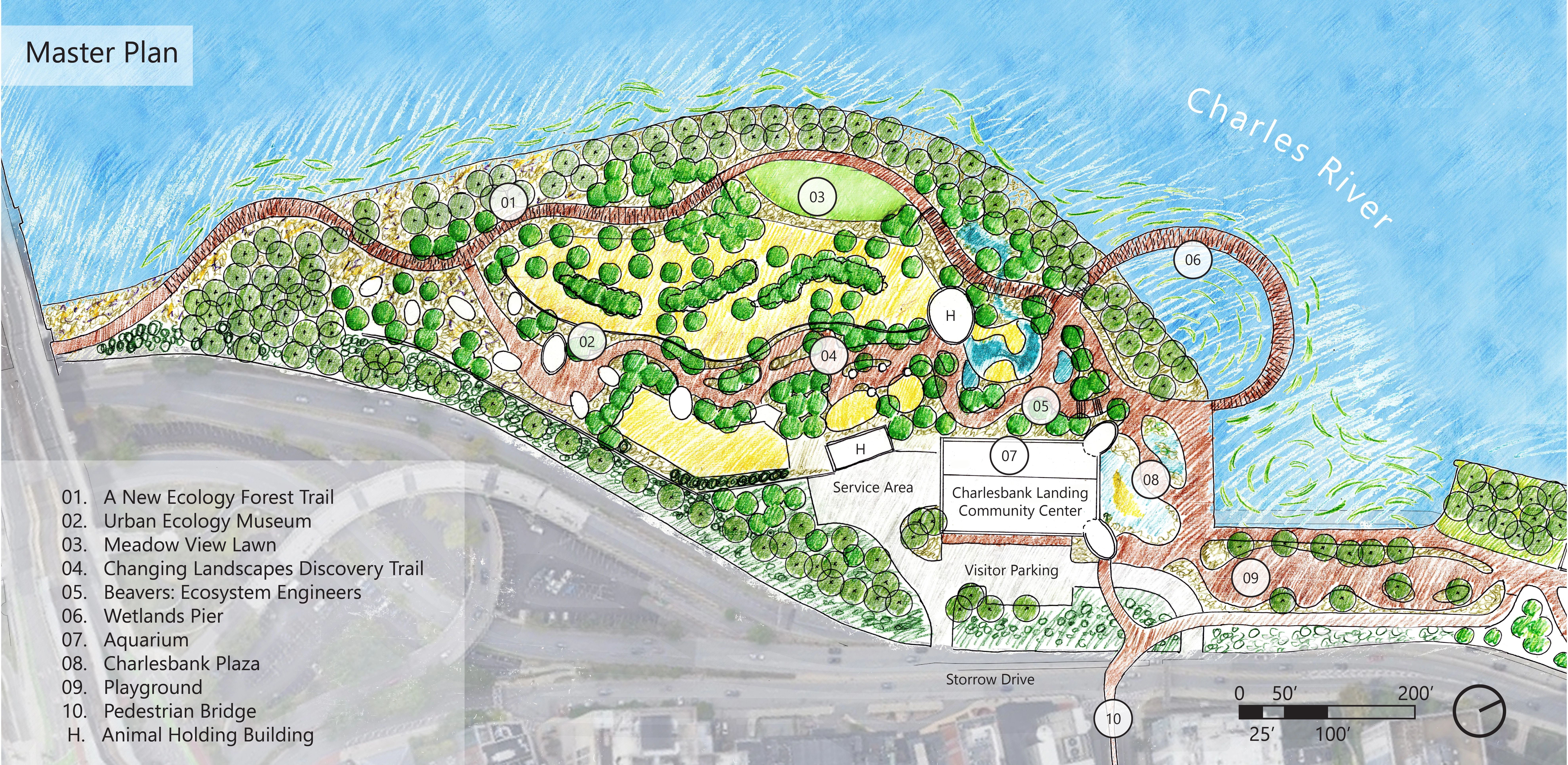 Boston Anthro-zoo Park (BAZP) is designed to reconnect urban people with the ecosystems that previously existed and currently exist in and around Boston. This project integrates functional wildlife habitat, public leisure space, interactive playscapes and interpretive displays into the conventional zoo exhibit model. Using the site and its context for inspiration, a narrative is built and conveyed showing the human-animal interactions throughout Boston's development. By presenting wildlife through different stages of Boston’s development, users are taught how specific alterations to the environment have affected ecosystems. This form of presentation exposes users to topics in ecology using a familiar environment to enhance understanding of the ideas presented. The goal of this narrative is to teach users how humans have altered specific environments, how those changes have affected ecosystems and how we can continue to alter our environment in a way that benefits wildlife.