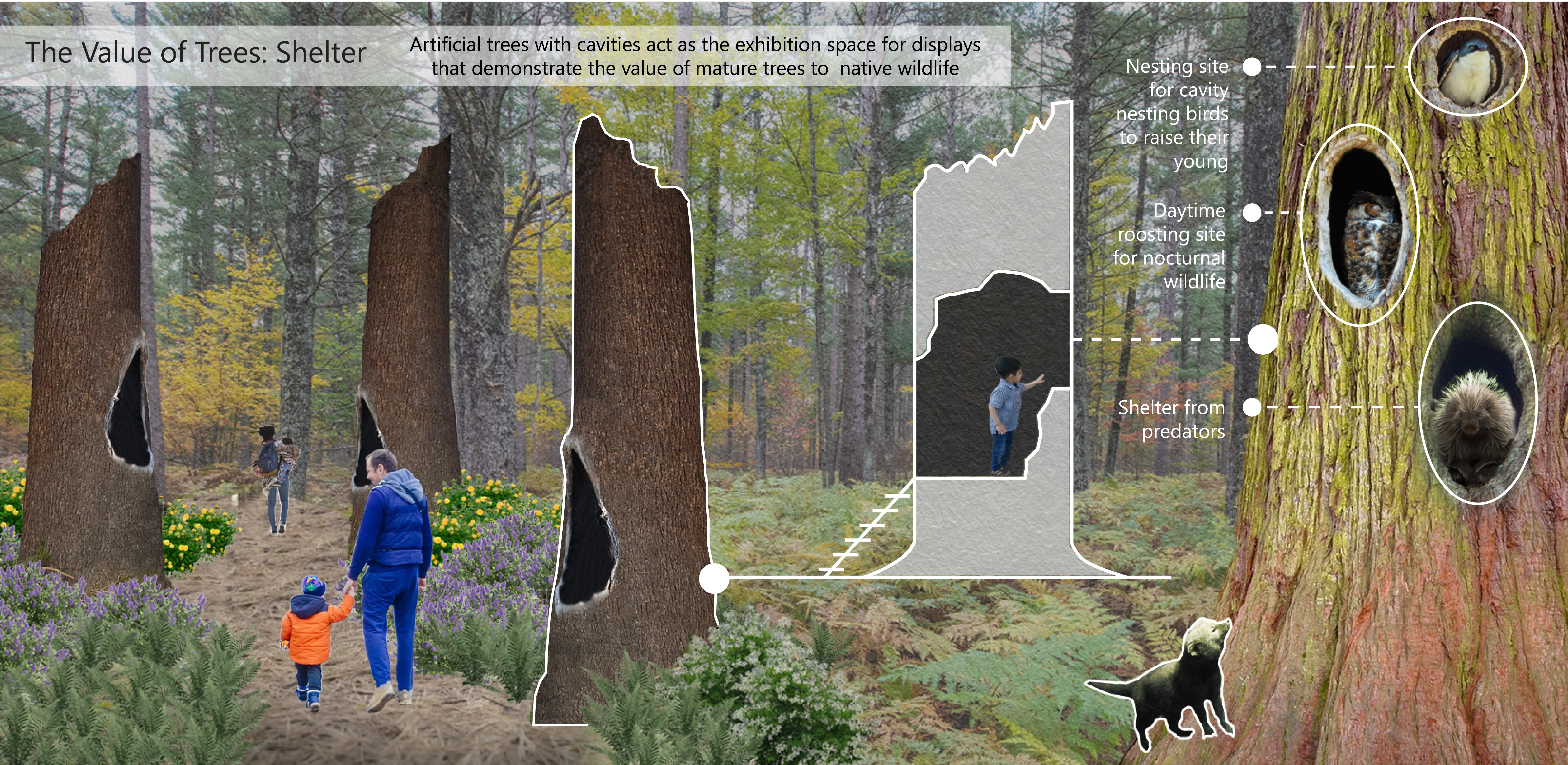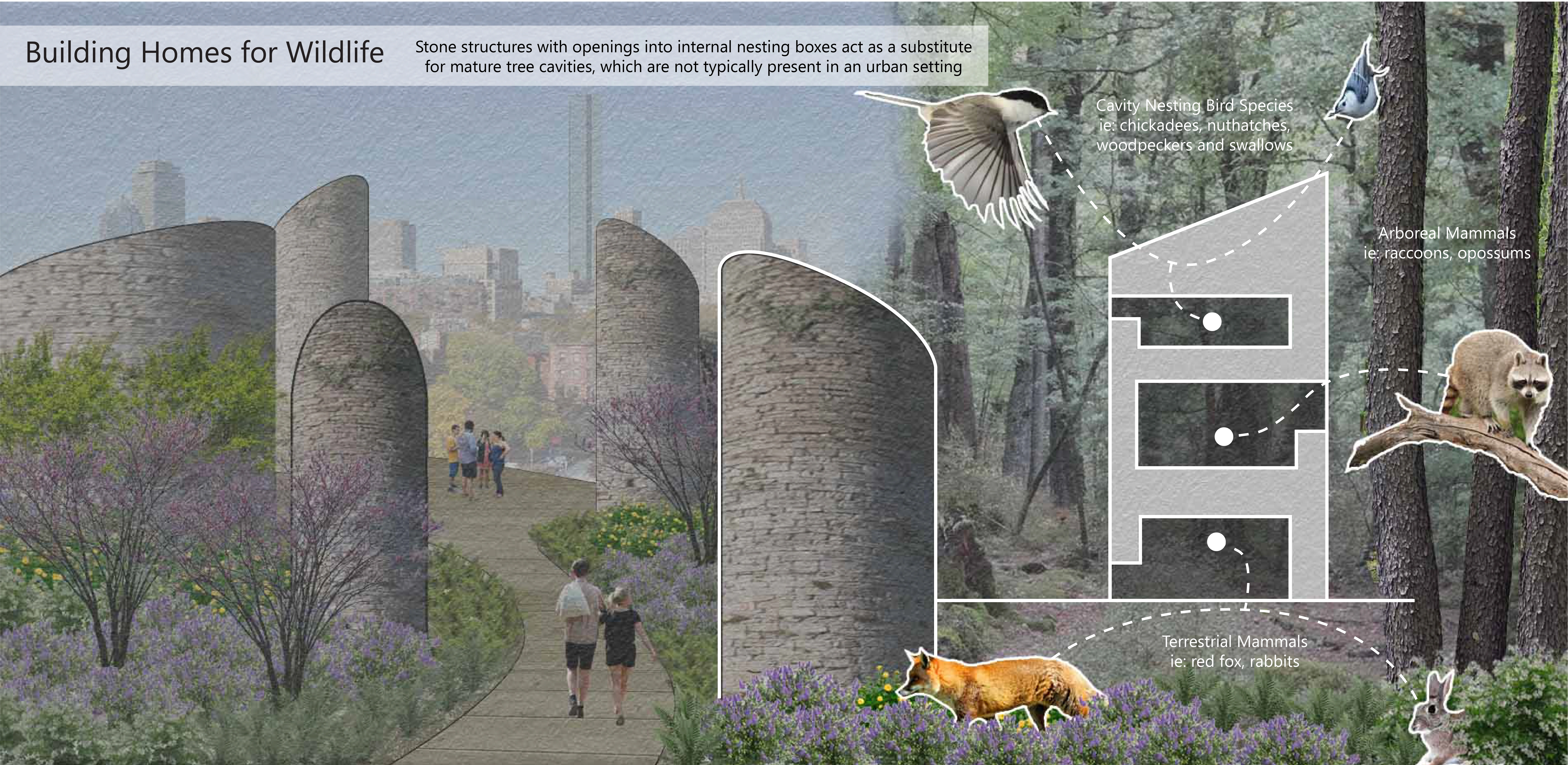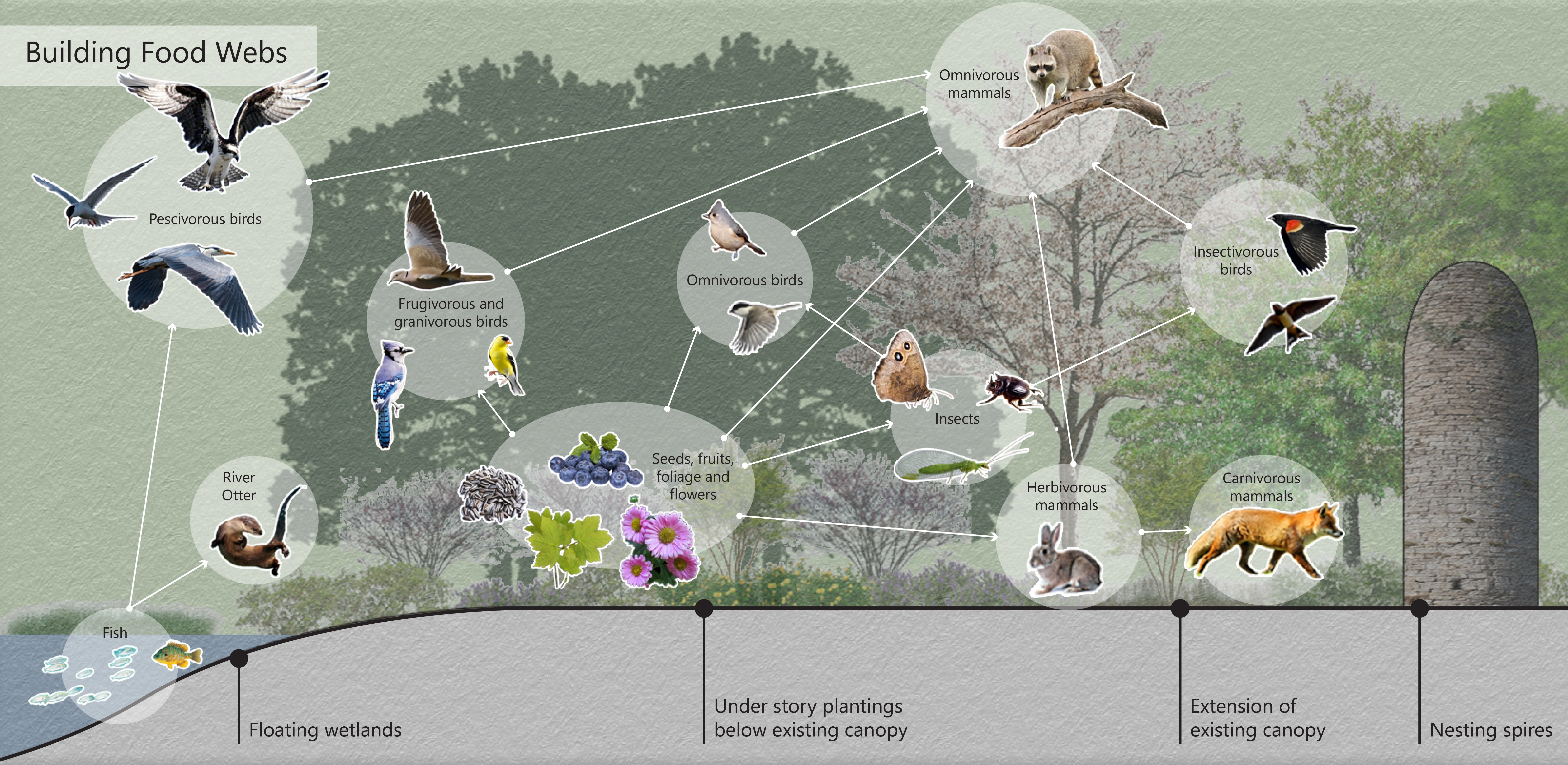 BAZP utilizes urban rewilding methods to immerse users in nature and demonstrate real world solutions that can be applied to urban open space to bolster native biodiversity. Ecological restoration of the site’s existing features aims to enhance the habitat quality for native species. Floating wetlands placed along the river’s edge improve water quality and provide cover for aquatic wildlife and food sources for birds and American river otters. Existing canopy is extended and filled in with a diverse understory of flowering and fruiting plant species to provide food sources and cover for native bird species in all seasons. Nesting spires provide denning and nesting space for wildlife seeking cover, acting as a substitute for cavities found in old growth trees that are not typical of urban environments.