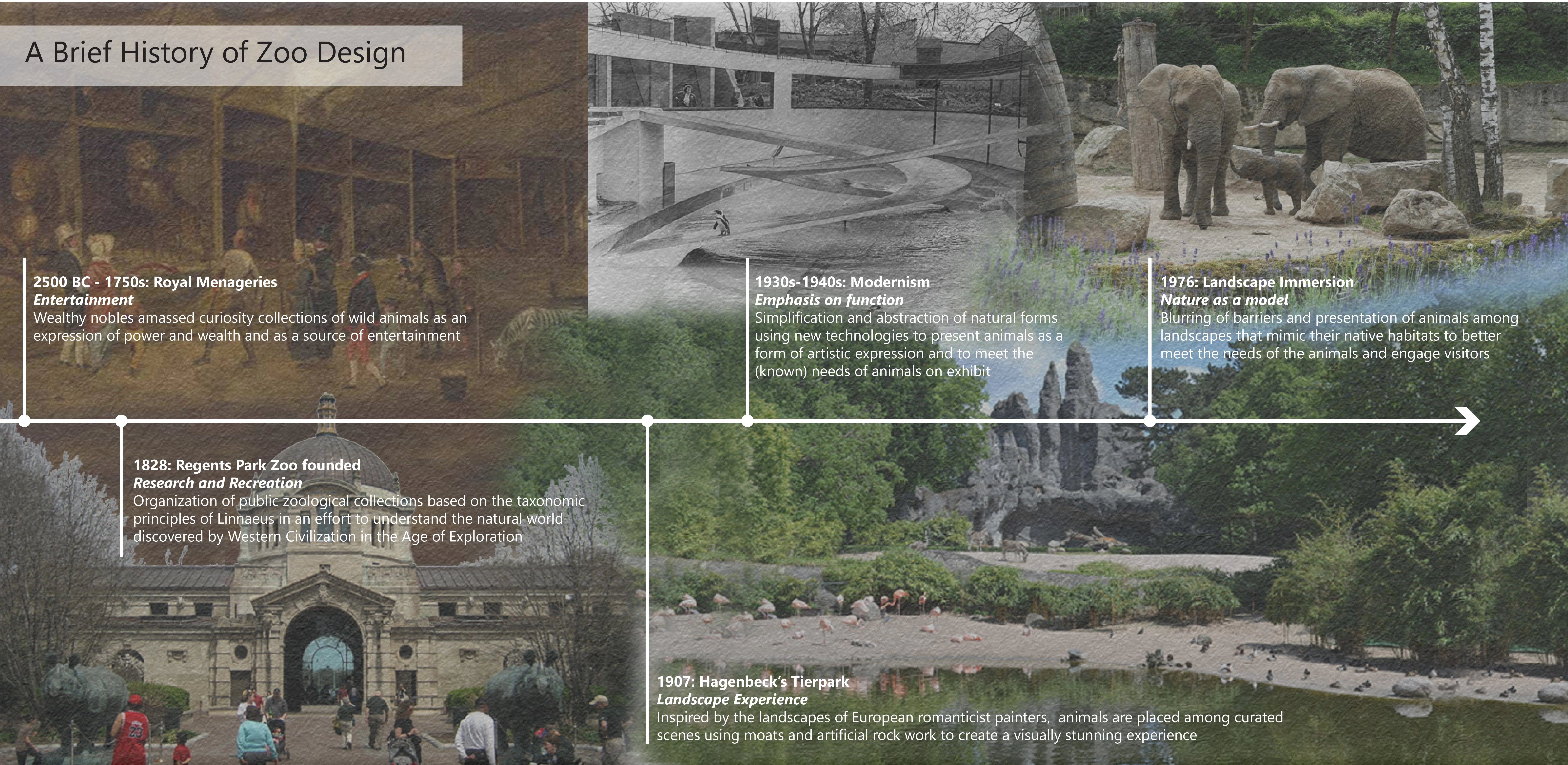 The function of zoos has drastically evolved since their conception based on cultural trends. Zoos began as early as 2500 BC as royal menageries: decorative gardens filled with exotic animals, kept for their aesthetic value and expression of wealth. Some examples are the zoological collections of the 1700s at the palaces of Versailles and Schonbrunn. Zoos soon evolved into public, research oriented institutions. The Regents Park Zoo opened to the public in 1828, showcasing exotic animals organized in taxonomic groupings to facilitate research in the latest trend in natural science, classification through comparative physiology. Romanticism was a driving force in the evolution of zoos into experiential landscapes. In 1907, Carl Hagenebck built Tierpark, a zoo that placed animals among a curated landscape using artificial rockwork and moated exhibits to control sight lines and create grand visual scenes. The influence of modernism in the 1930s and 1940s is marked by the simplification and abstraction of natural forms to streamline zoo exhibits into functional, sculptural pieces. The Penguin Pool at the London Zoo was designed to meet the needs of its inhabitants using the simplest possible forms, but was ultimately a failure as the needs of penguins were assumed rather than known. The environmentalist movement of the 1970s inspired a movement in zoo design towards using nature as a model, dubbed landscape immersion. A forerunner of landscape immersion is CLR’s “Long Range Physical Development Plan” for the Woodland Park Zoo in 1976. This plan curates the visitor experience by visually softening barriers between people and animals and uses natural ecosystems as a model for animal habitat design. This design approach is based on the idea that emotional responses to an experience enhance retention of presented ideas and that presenting animals in their natural context is best for animal welfare and imbues a greater respect and appreciation for the animals. The modern zoo focuses on animal welfare, education and conservation, showcasing exotic animals in immersive recreations of their natural habitats. BAZP aims to serve as a new model for the function of zoos in society; as a place to be with nature and understand the environment that one experiences daily.