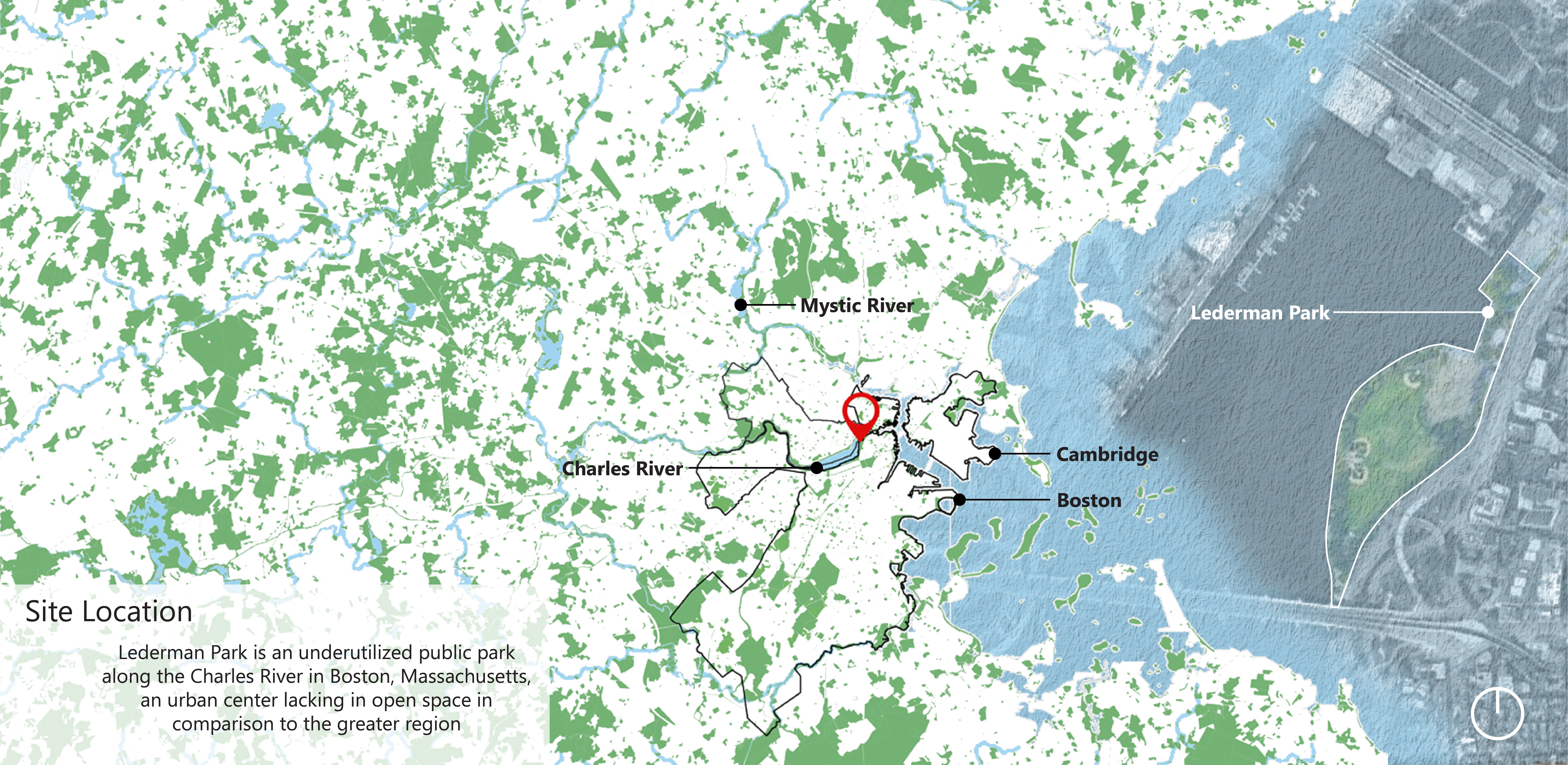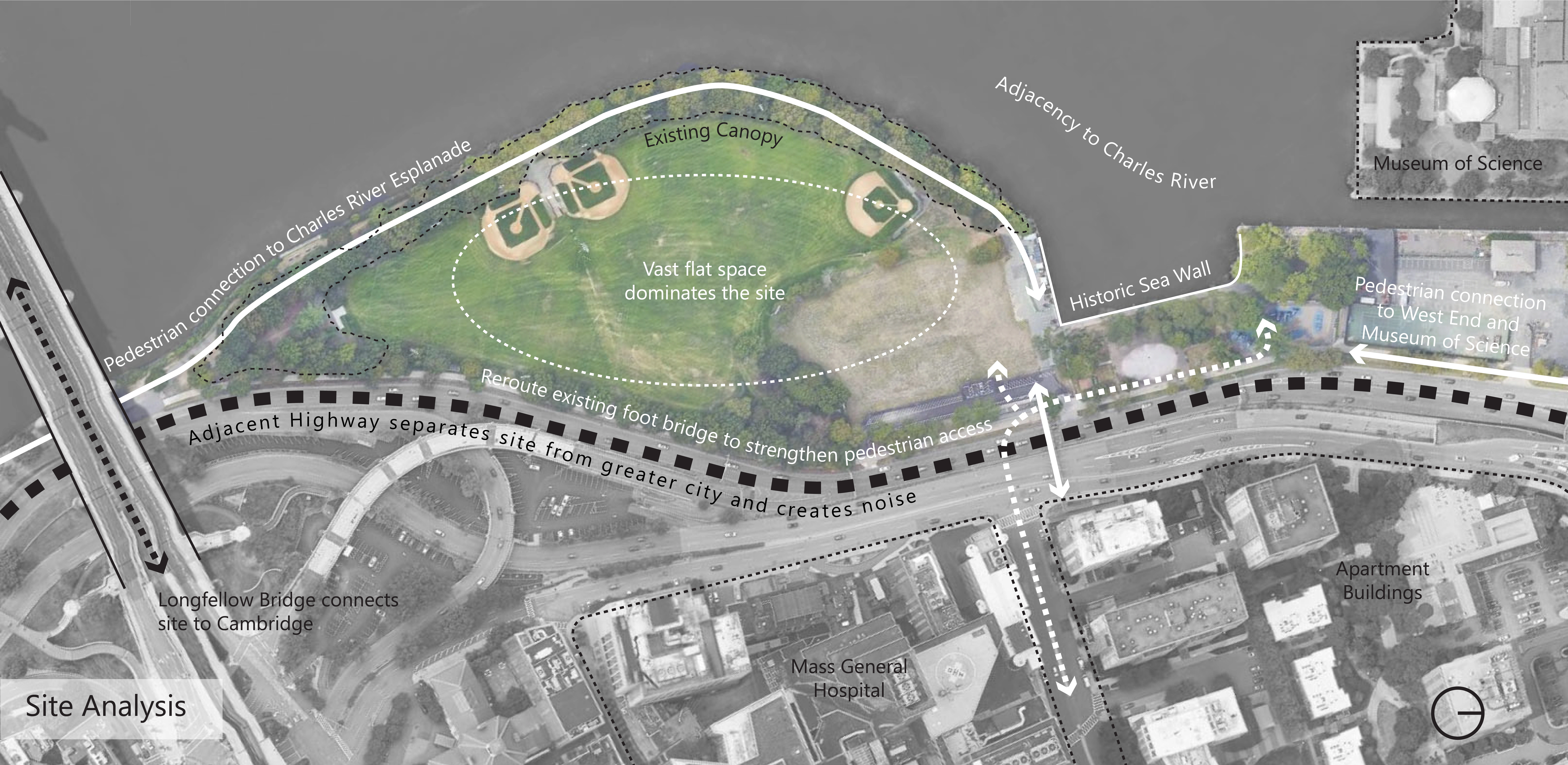 Lederman Park is a 13.6 acre public park situated at the north end of the Charles River esplanade. Currently serving as an athletic field complex, the site’s substrate consists wholly of turf grass and pavement. Its adjacency to the Charles River provides an opportunity to revegetate the urban waterway using floating wetlands. A formal alley and grove of primarily healthy, native trees lines the river’s edge. An adjacent series of major roadways largely separate the site from pedestrian circulation in the city and create constant noise that travels across the flat site.
