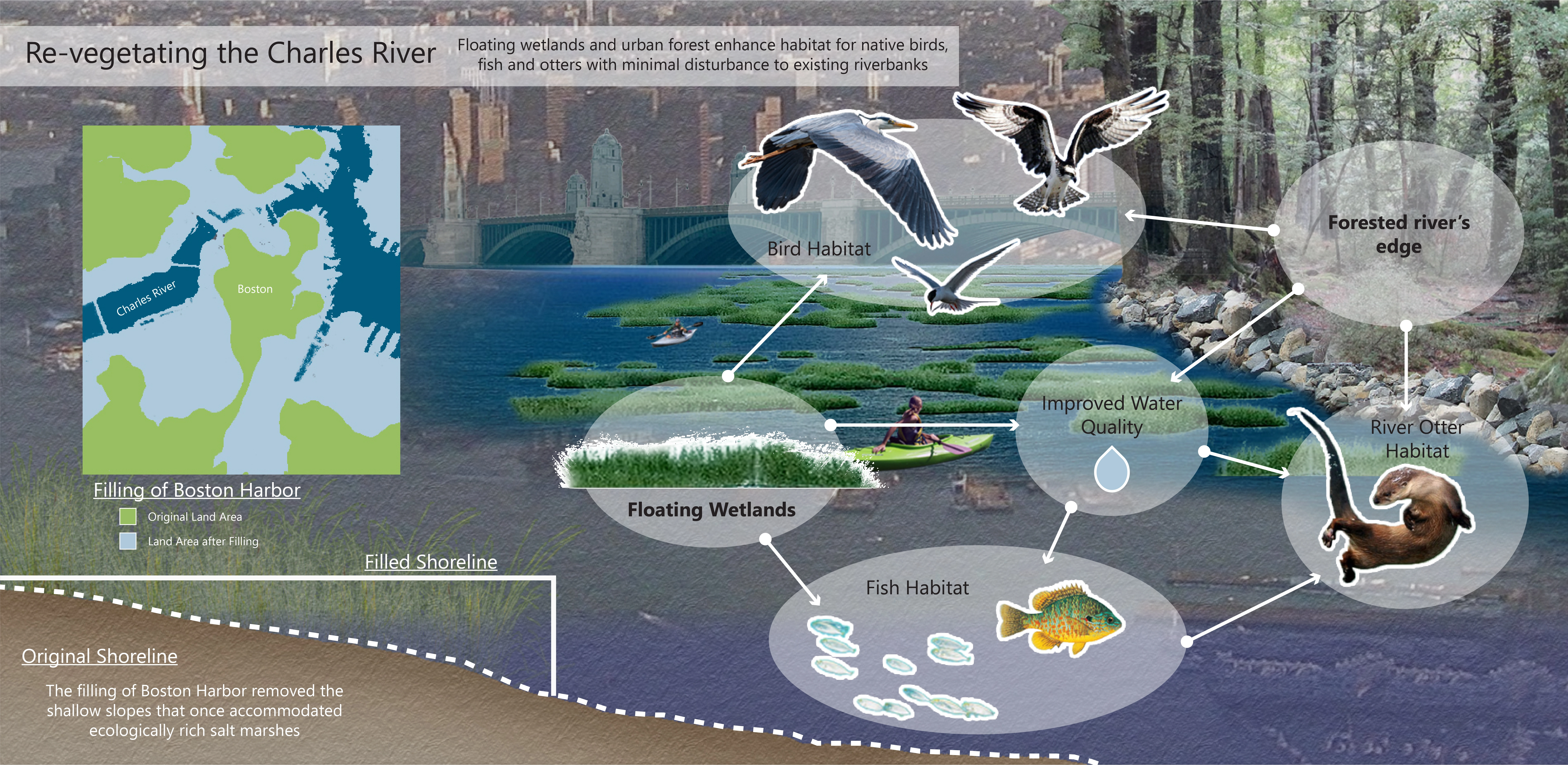 Urban waterways, such as Boston Harbor and its associated rivers, are not beyond saving. The use of floating wetlands and forested shorelines along the banks of the Charles River can contribute to re-building a productive aquatic ecosystem.