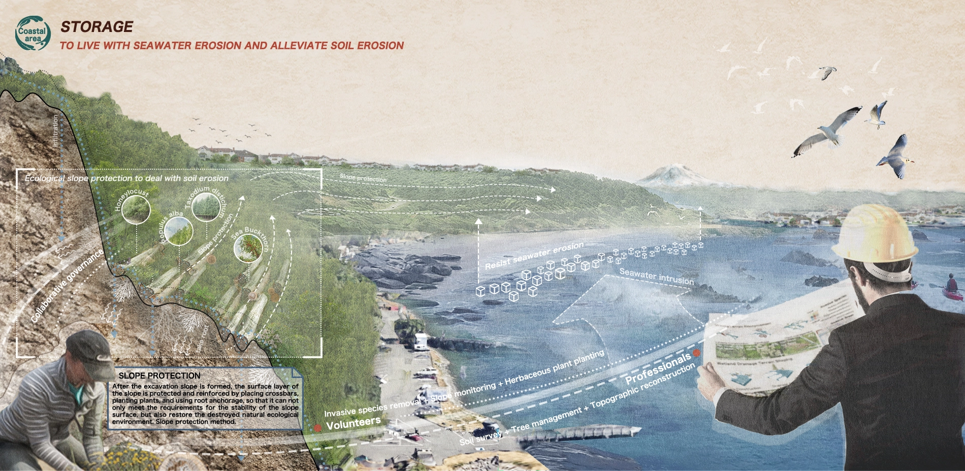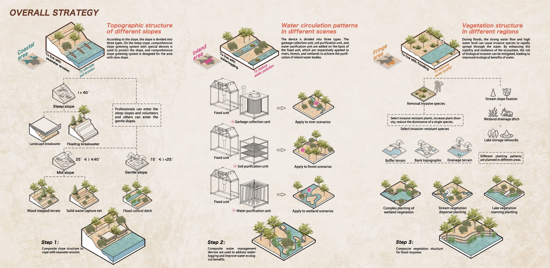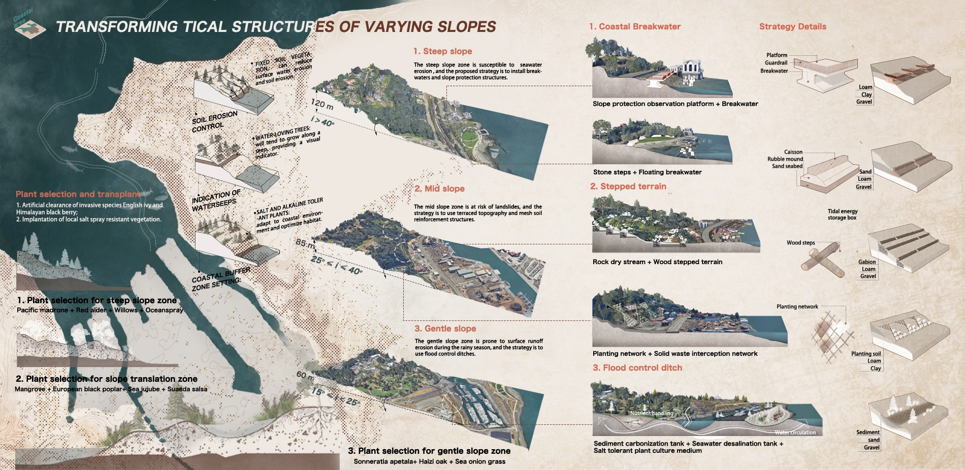 The coastal area faces steep terrain slopes, seawater erosion, and soil erosion. We set up slope protection observation platforms, stone steps, and breakwaters in steep slope areas. We set up log step slope protection, soil protection nets and plant soil fixing plants in medium slope areas. We set up multi-level flood control ditches in low slope areas, which combine functions of seawater desalination. Based on the terrain transformation strategy, vegetation selection is carried out in the three slope areas, which we hope to address issues such as seawater erosion.