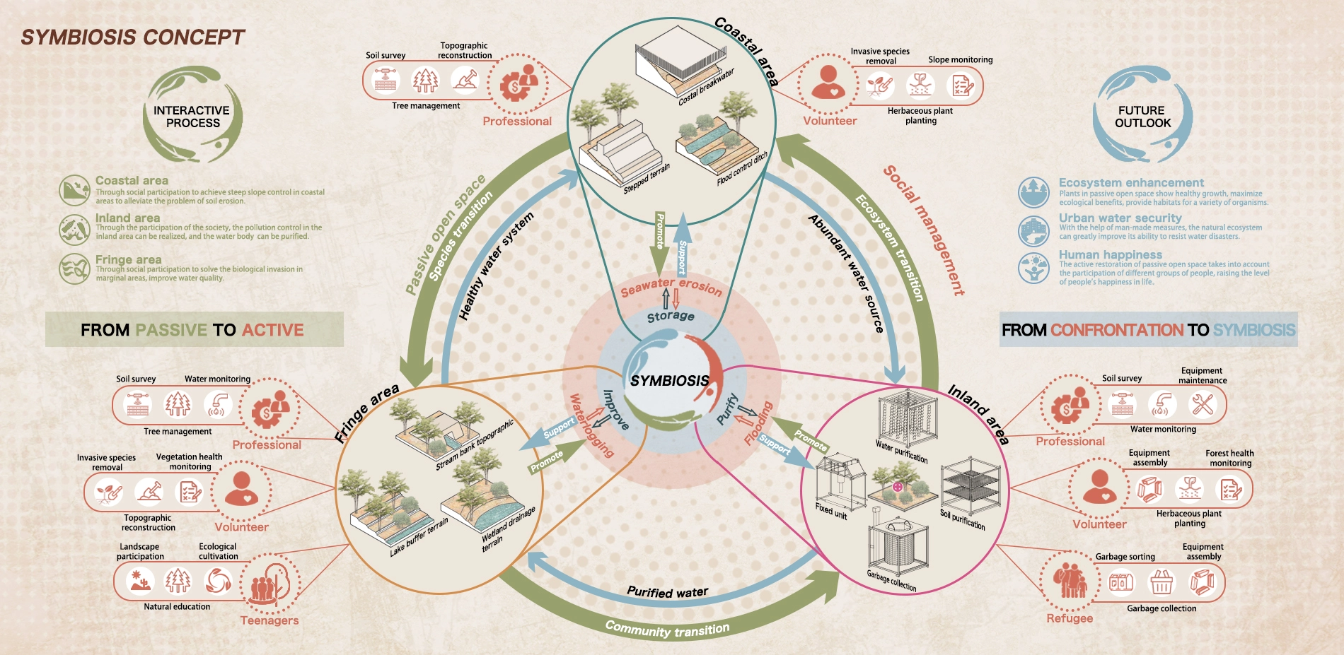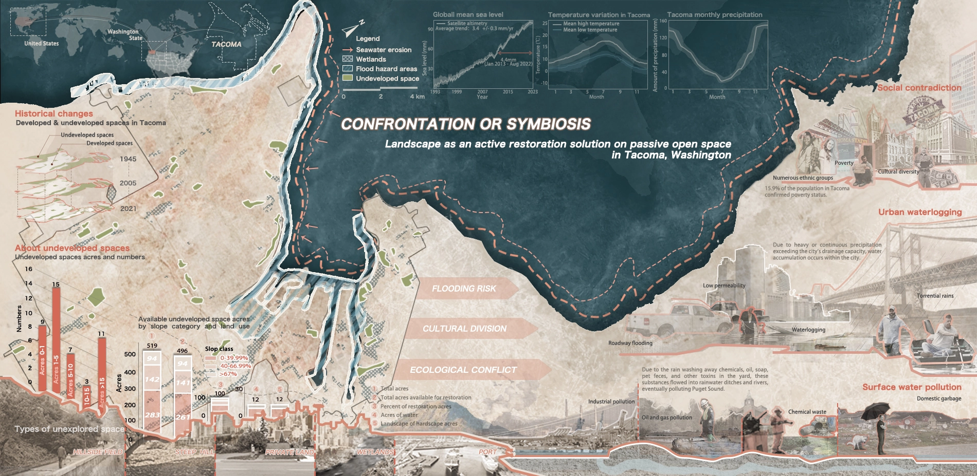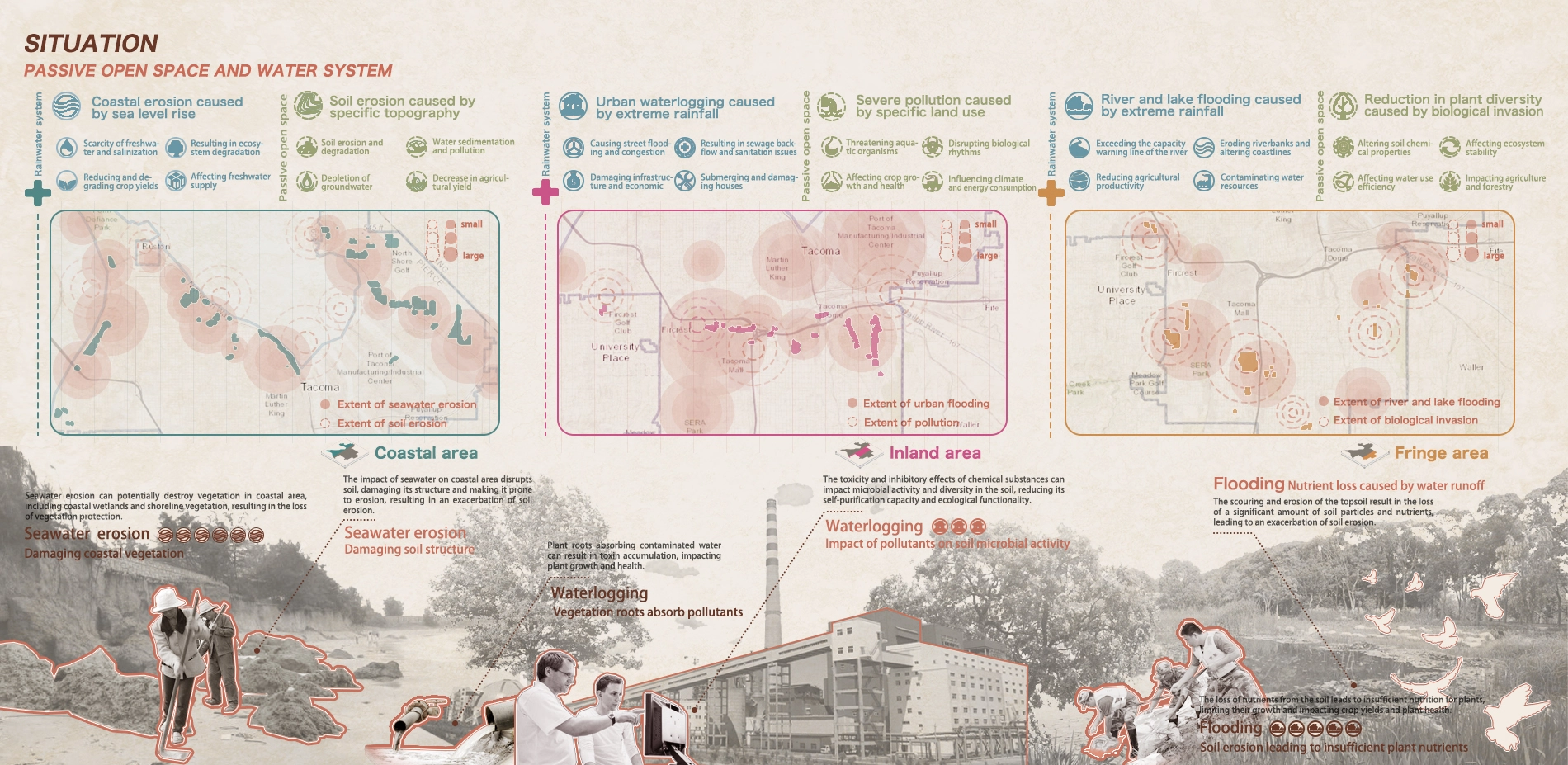 Tacoma has a direct confrontation in flooding risk, cultural division and ecological conflict. Passive open space with rich vegetation coverage offers a sustainable solution to deal with the contradiction. However, 47% of the space acreage is considered a steep slope and another critical factor is invasive plants. With the purpose of mitigating soil erosion caused by coastal seawater erosion, alleviating pollution by waterlogging in inland area, and addressing ecological degradation resulting from intensified river and lake flooding in fringe area, we promote an active restoration of it through the establishment of a symbiosis system. It'll facilitate the self-circulation of water system and impact diverse habitat self-recovery in Tacoma.