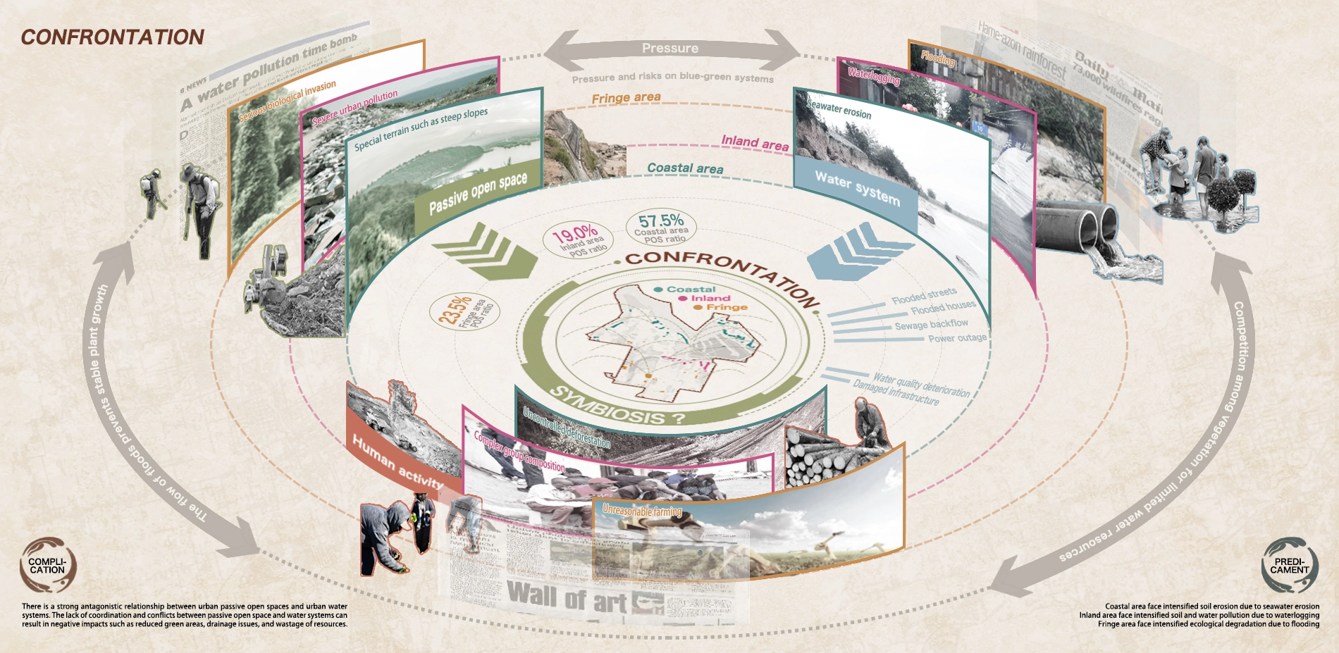 This project conducts a comprehensive study of the passive open space, surface water and human activity in the Coastal area, Inland area and Fringe area, dis-establish the confrontational and to re-establish a symbiosis system in them.