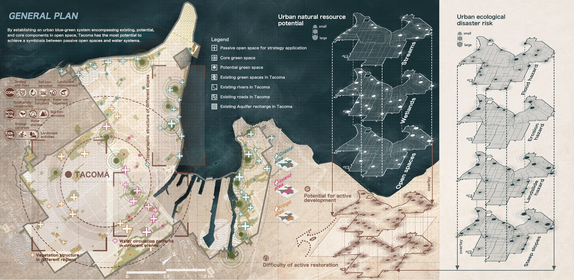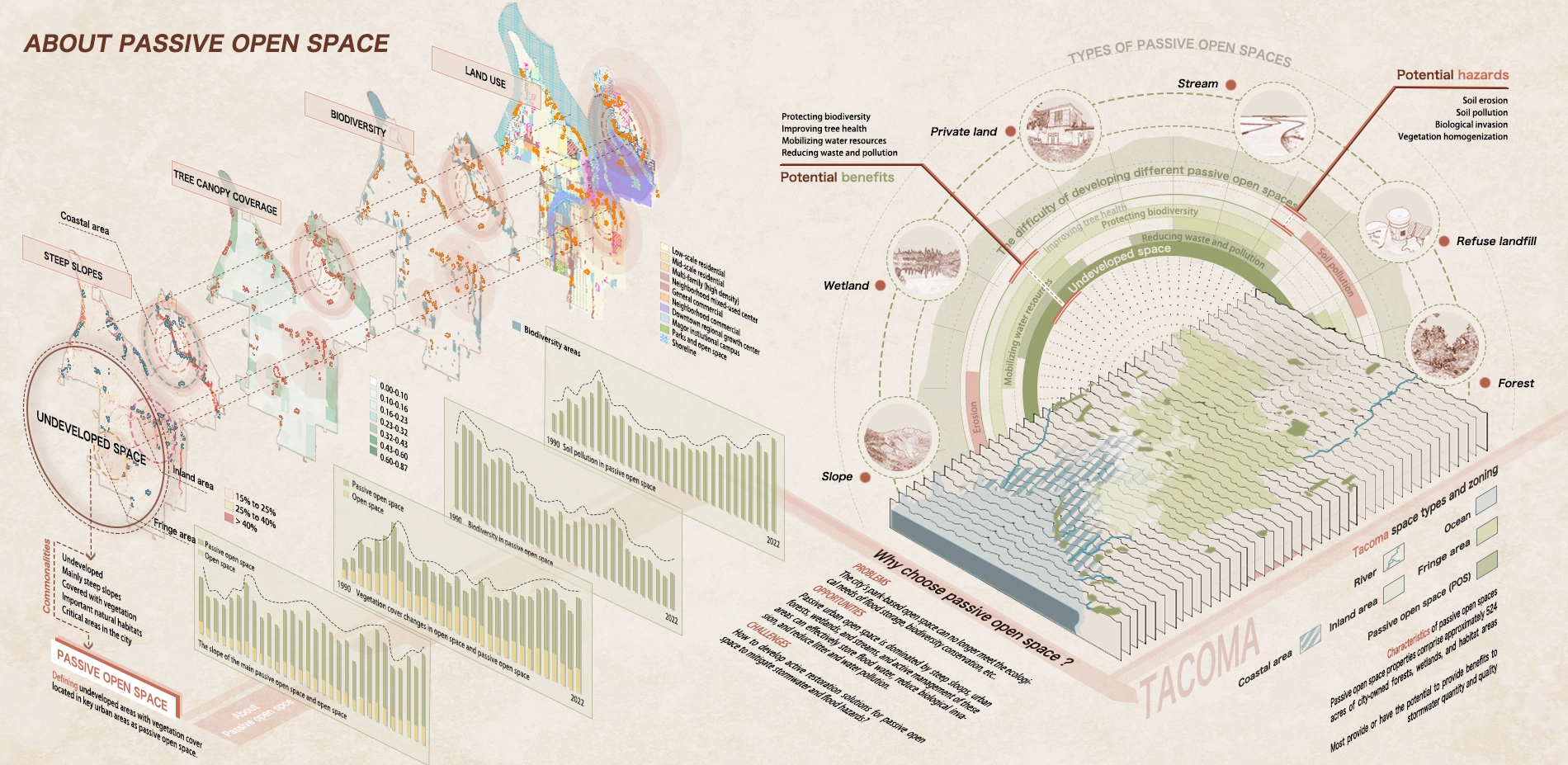 We design and implement a management framework that aims to establish a symbiosis system among the city, water system, and passive open spaces for Tacoma. Ultimately, it will foster a sustainable urban development model that integrates social life, economic productivity, and distinctive culture. Taking Tacoma for example, the goal of our project is to develop and promote the application of resilient planning for passive open spaces worldwide in response to the climate crisis.