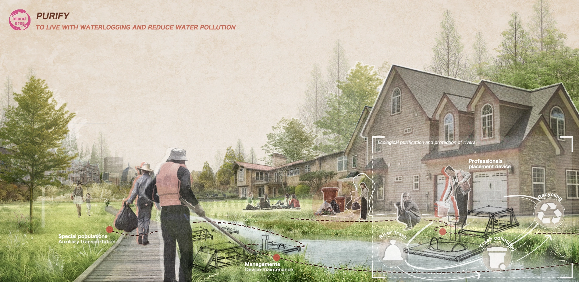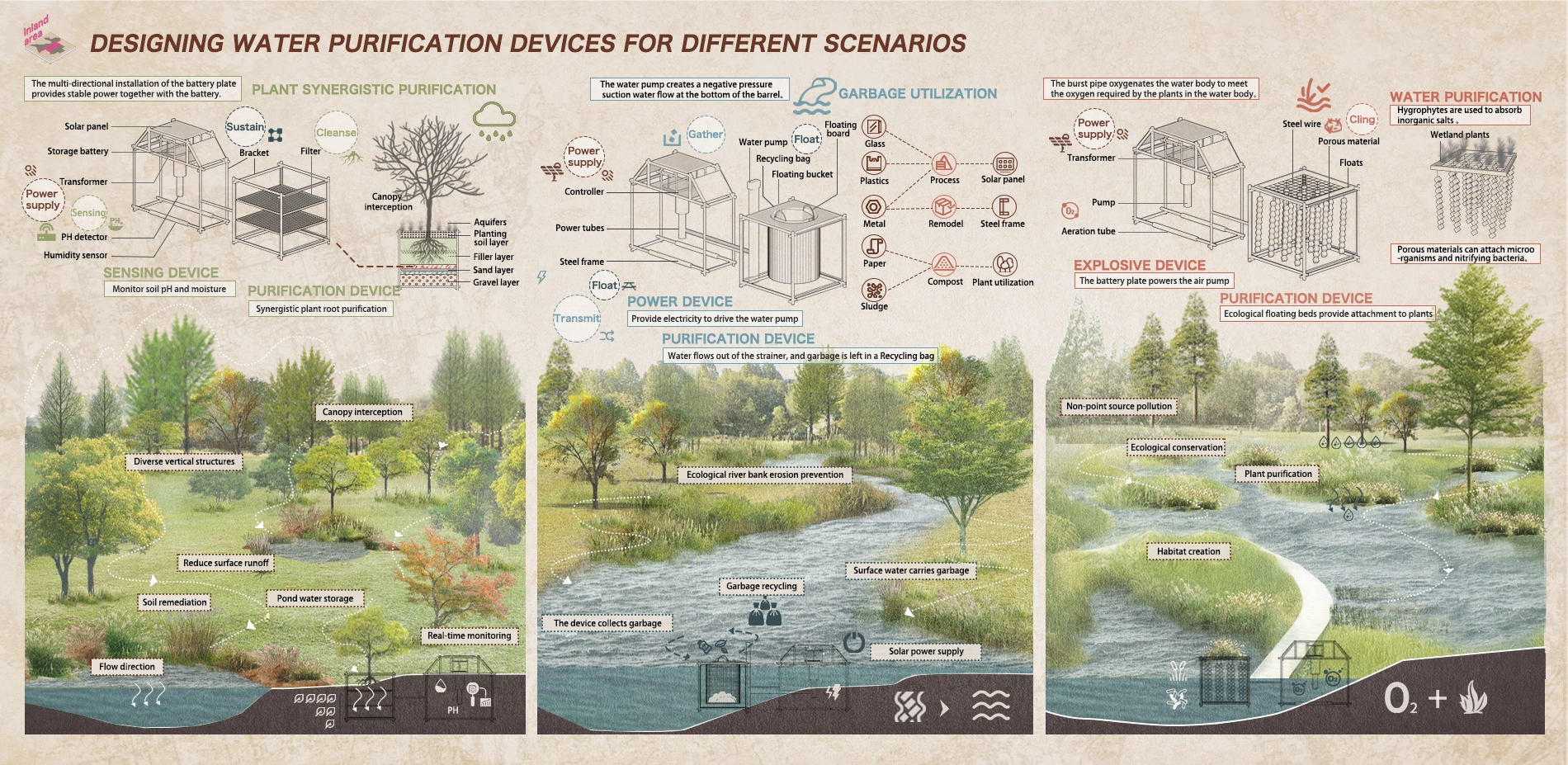 The inland area faces severe water and soil pollution issues. We design devices that can integrate or interact with passive open space vegetation. The form and function of these devices are tailored to the specific characteristics of the three key areas of the urban forest, wetlands and rivers in which they are applied. Additionally, the active involvement of four stakeholder groups will be encouraged throughout the device's utilization process. The solution aims to establish a management system encompassing river garbage collection, wetland water purification, and forest soil purification.