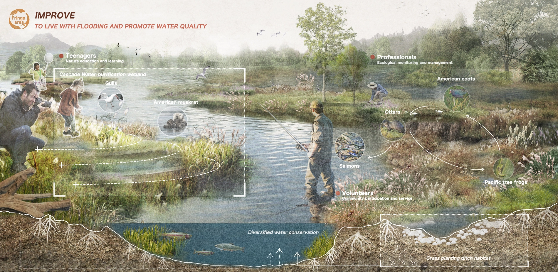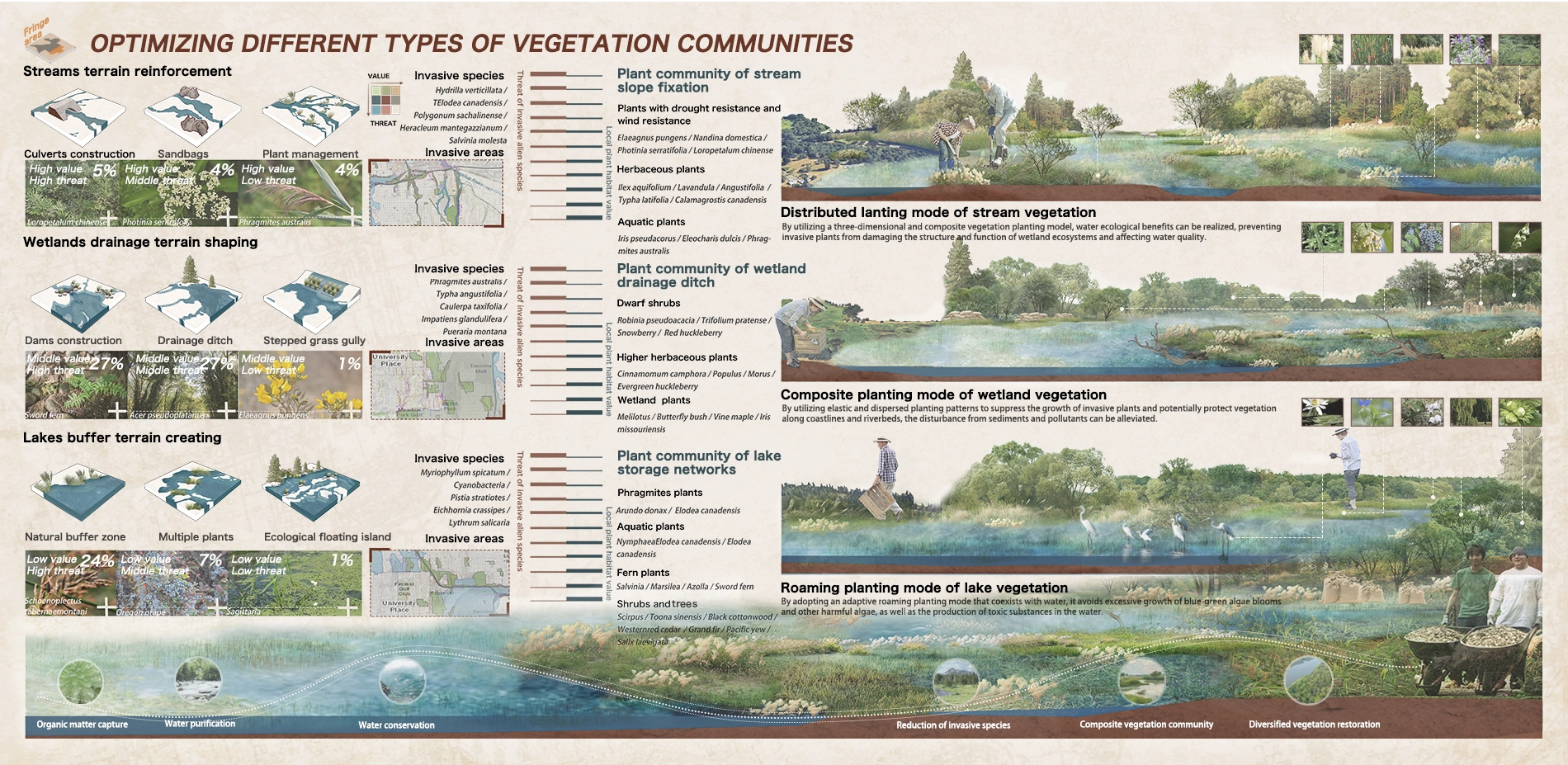 The fringe area faces biological invasion, habitat quality degradation and flood disasters. In streams zone, we slow down water flow and purify water by strengthening river banks and planting slope protection plant. In wetlands zone, we purify water by constructing drainage terrain structure and setting wetland drainage ditch. In lakes zone, we use vegetation, tidal flats and other buffers to reduce the effects of flooding to support water conservation and ecological management of multiple habitats in fringe area.
