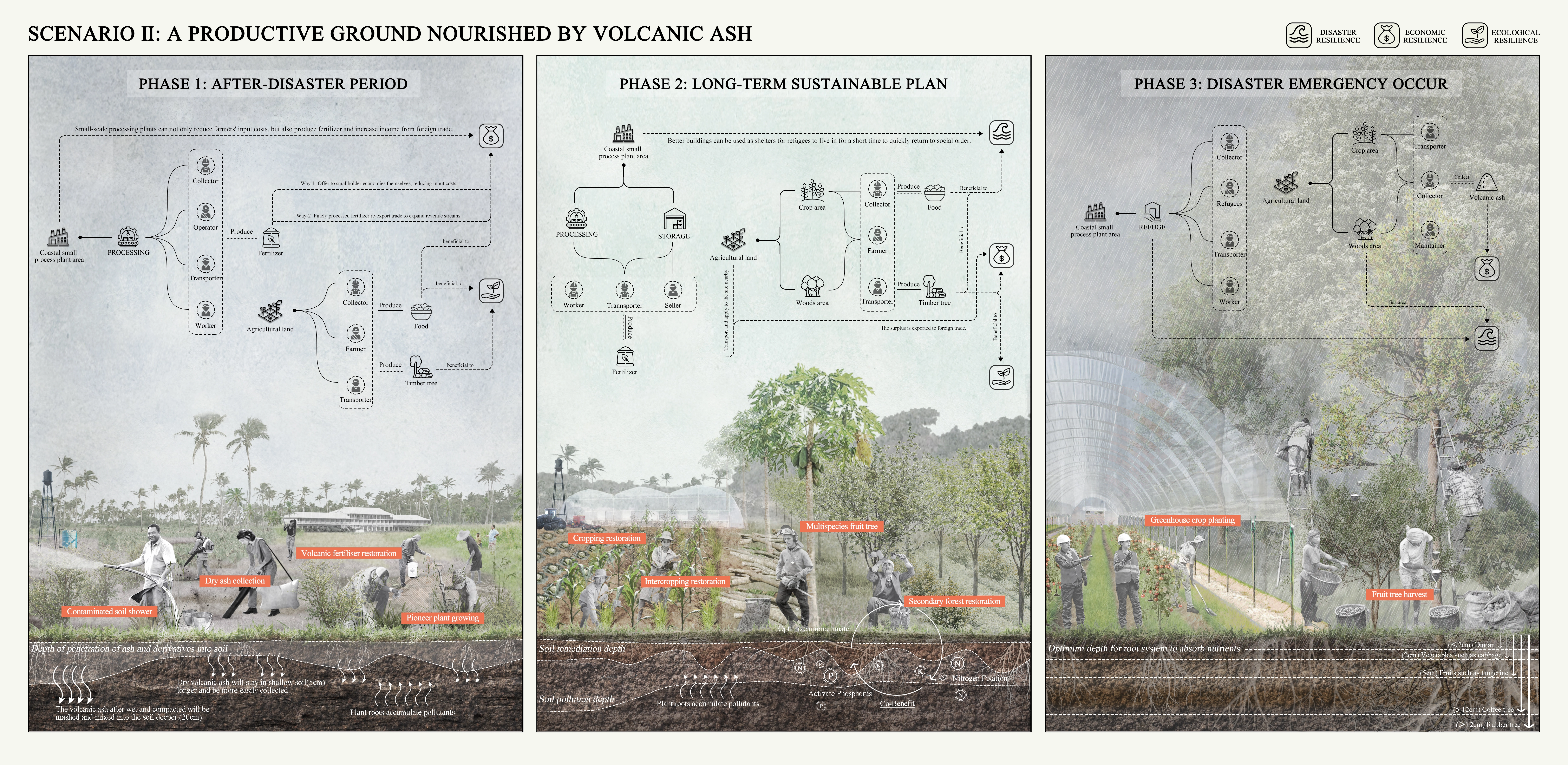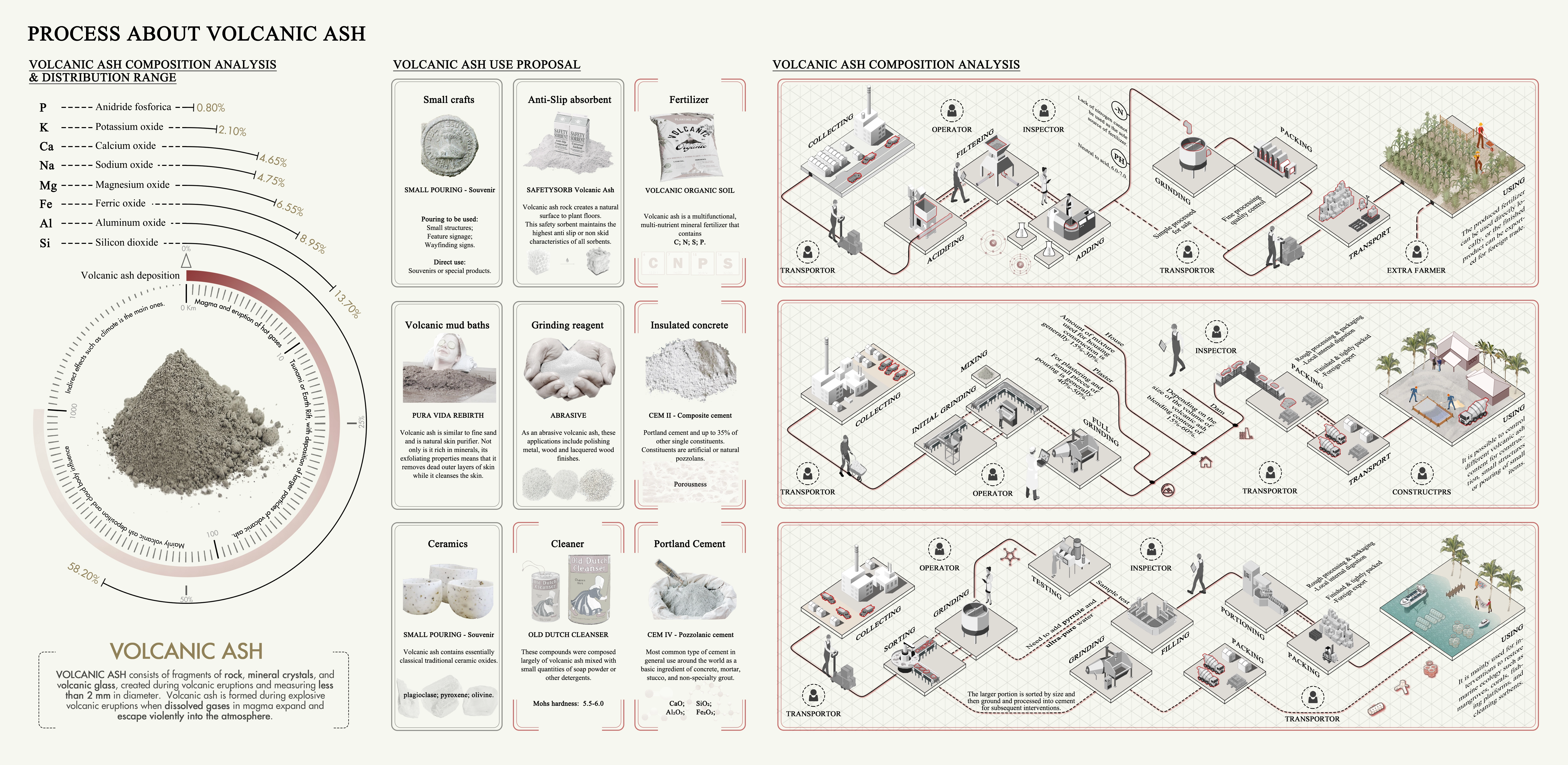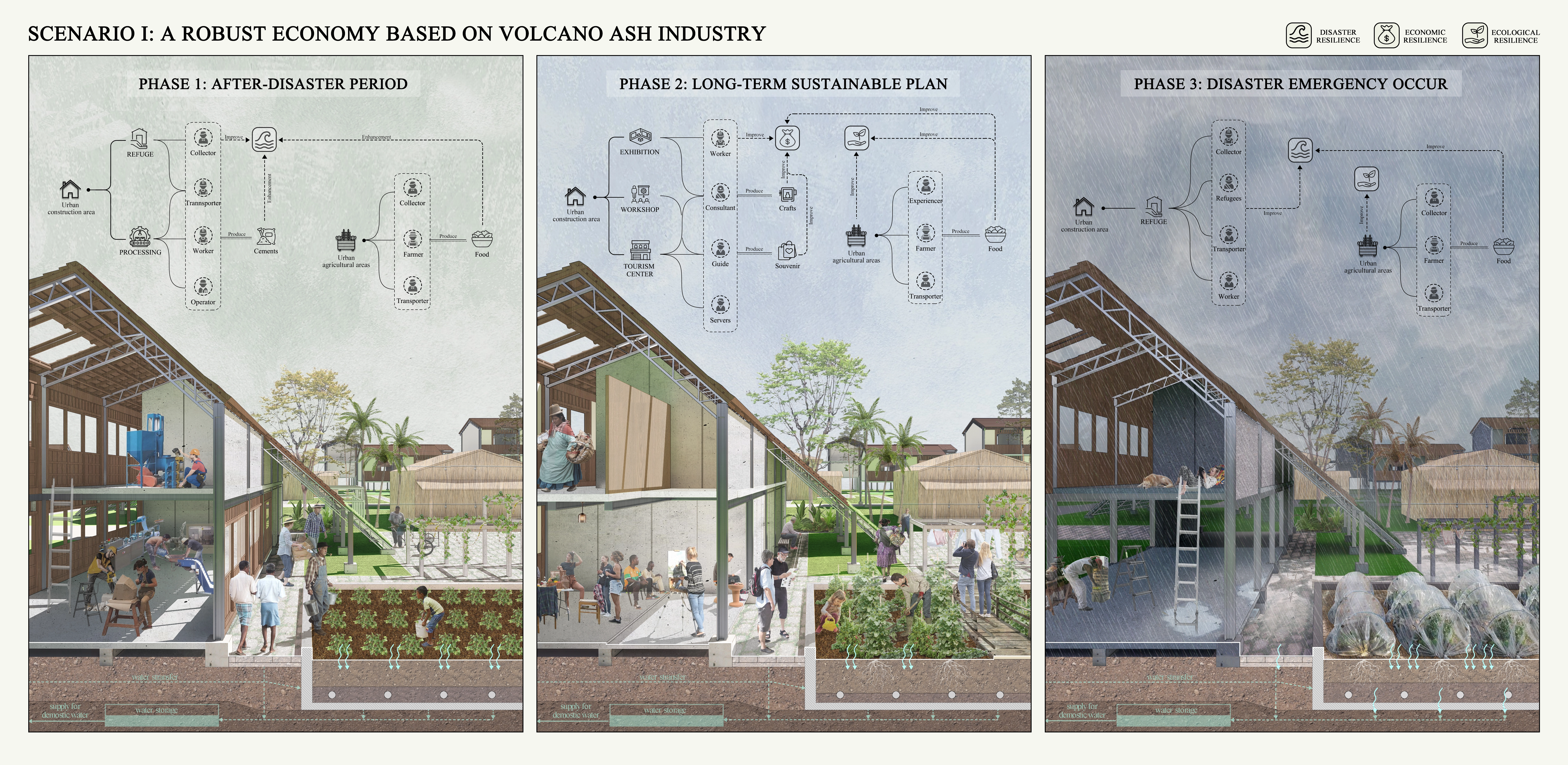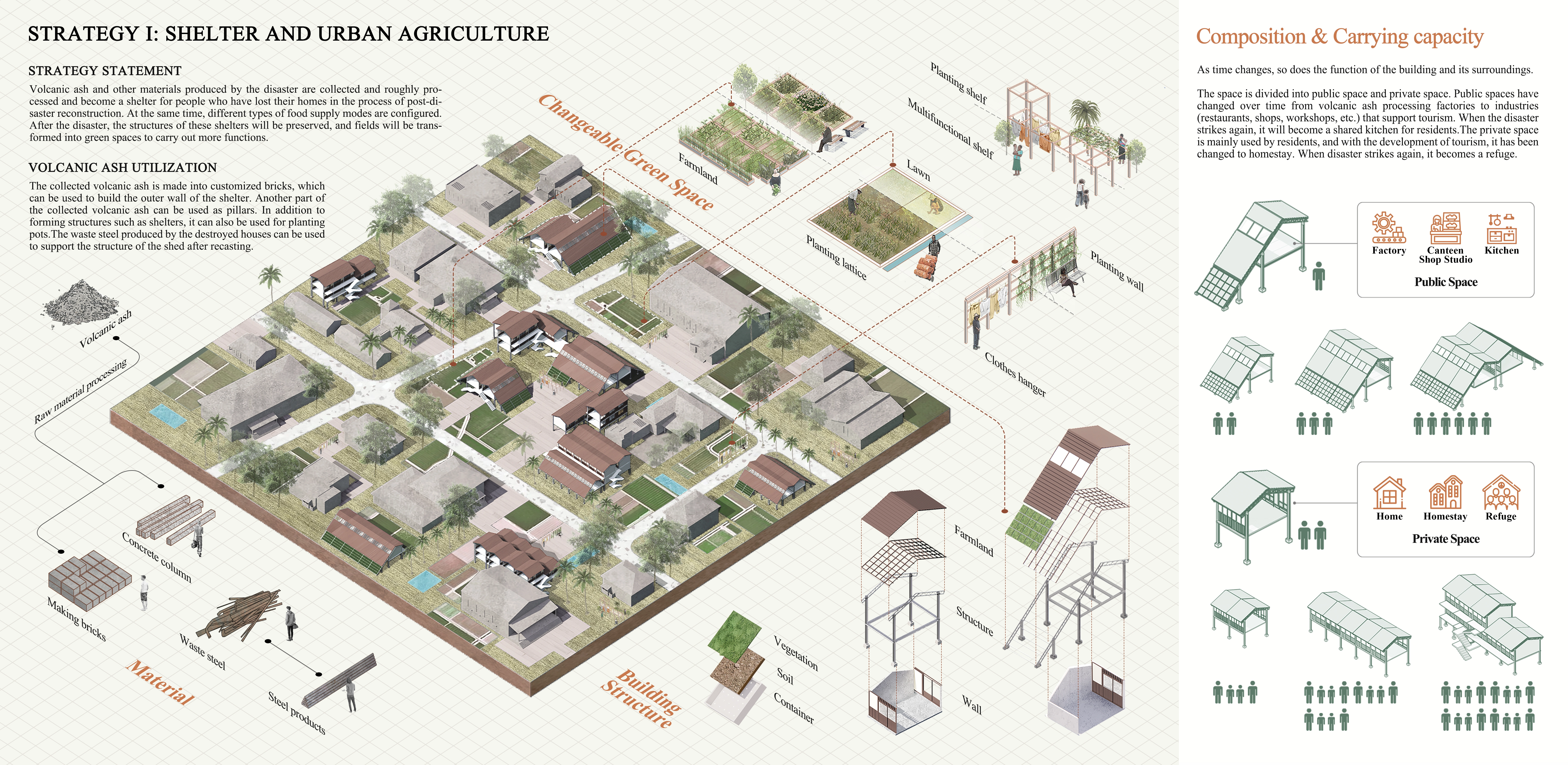 Raw volcanic ash is collected and used to repair damaged buildings, and create mixed-use modules for temporary habitat and food sources during disasters, promoting community sustainability. Later, these modules become community factories that process volcanic ash, agriculture, and fisheries. Eventually, they transform into places of volcanic memory, offering participatory workshops and shared farms, attracting visitors. This increases the city's resilience by creating new industries, jobs, and public spaces, addressing MIRAB challenges.