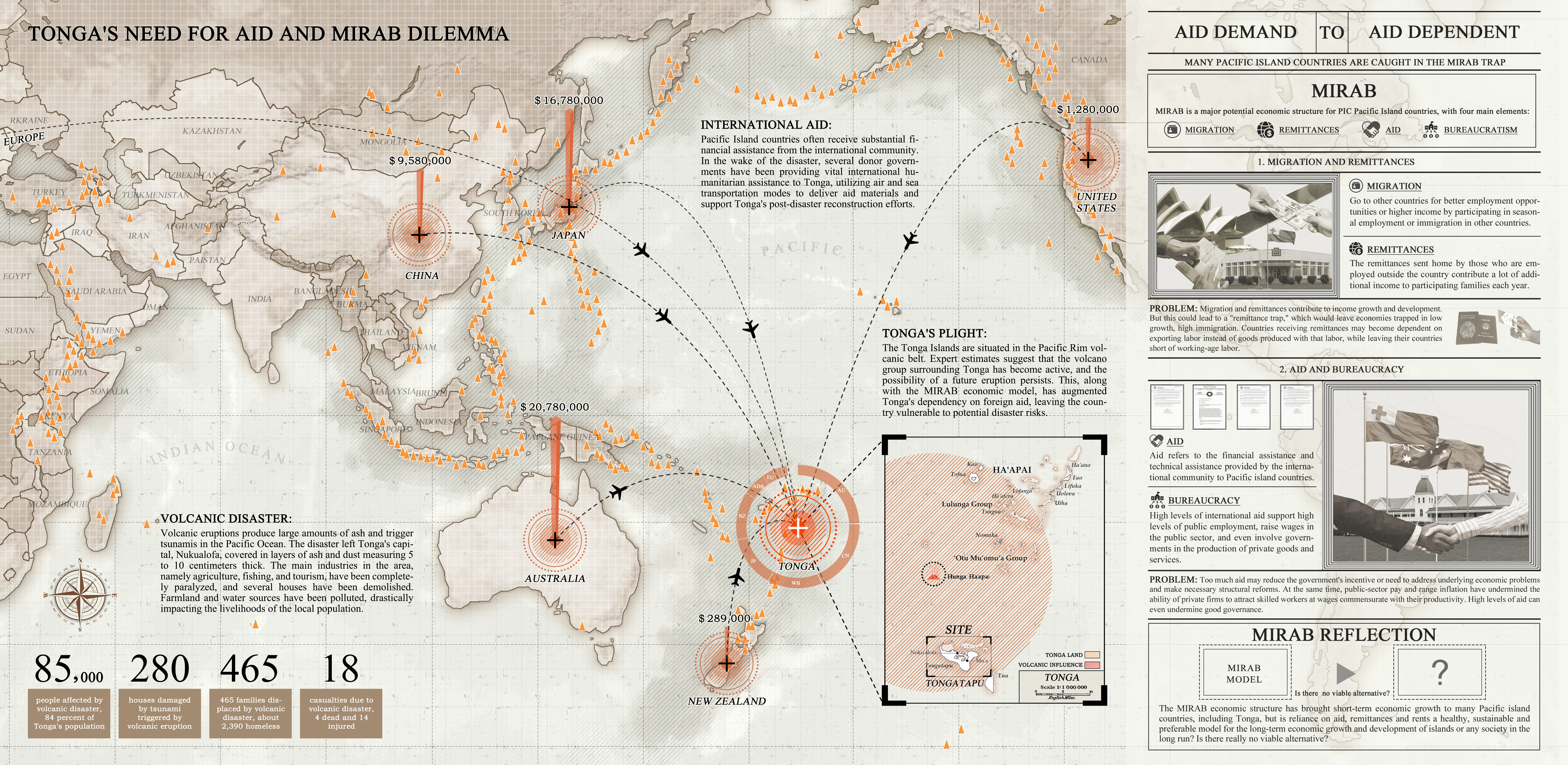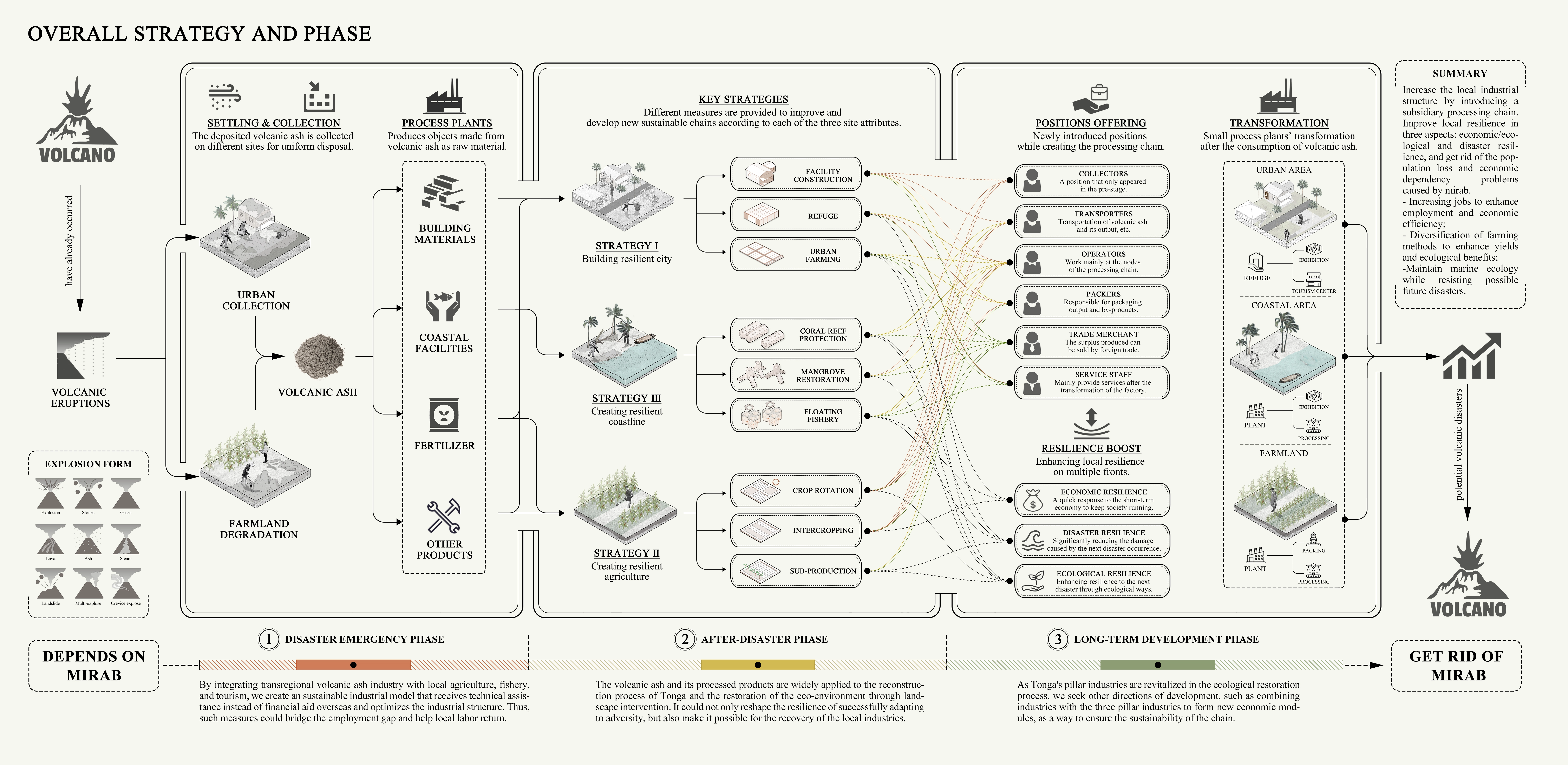 Two main solutions to Tonga's challenges are enhancing Tonga's ability to adapt to disasters through environmental resilience and achieving stable employment and economic growth to overcome the challenges posed by MIRAB. The project takes advantage of Tonga's reconstruction as an opportunity for sustainable development by collecting and processing volcanic ash into a variety of products to restore cities, farmland, and coastline. This process can rapidly promote agriculture, fishery, and tourism in Tonga. Our project envisions adaptive strategies for the after-disaster phase, long-term development phase, and disaster emergency phase, to ensure its implementation. By improving Tonga's environmental and industrial resilience, we can enhance Tonga's ability to adapt to potential risks and future disasters, creating a sustainable development model that overcomes the challenges posed by MIRAB.