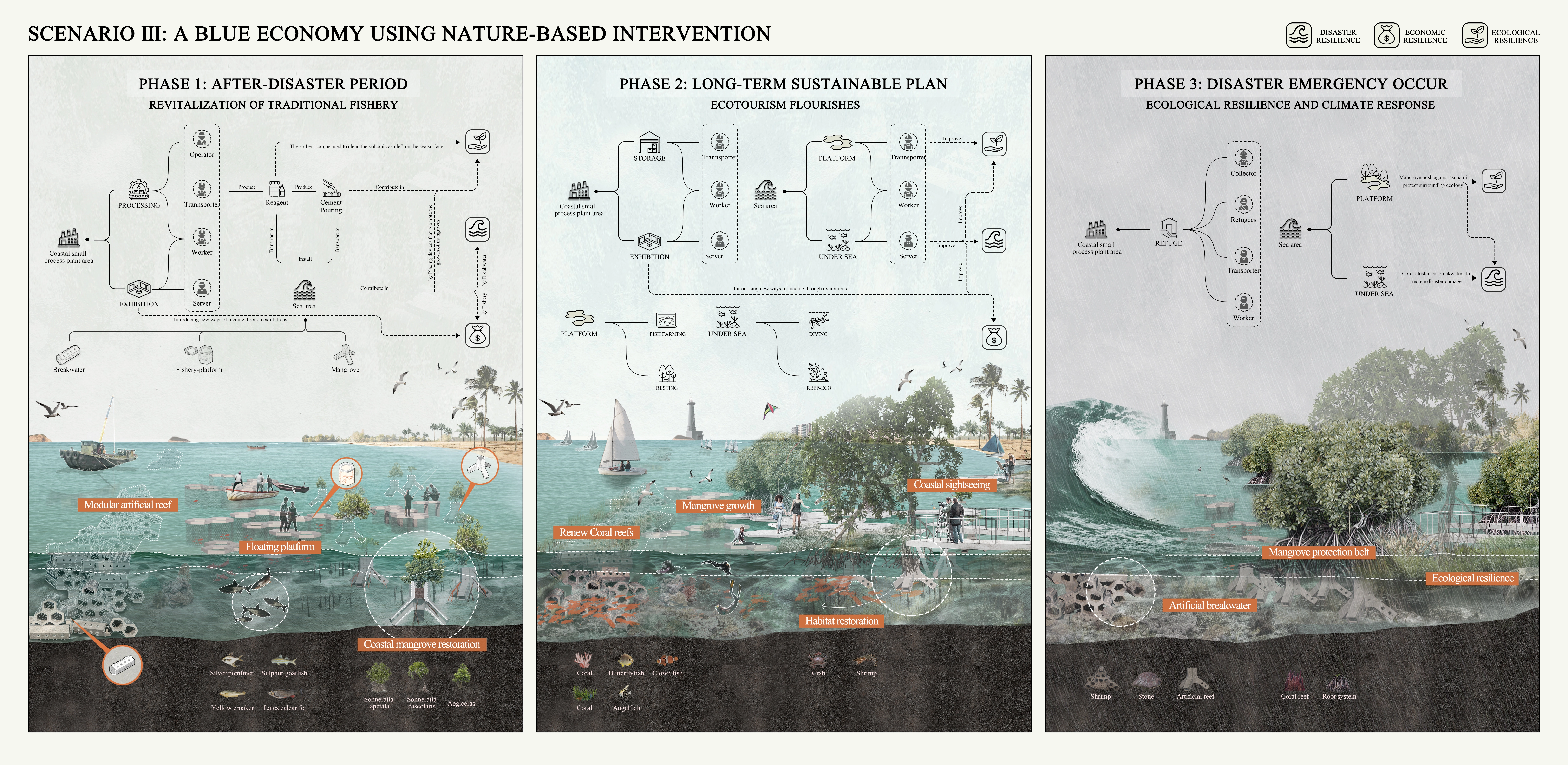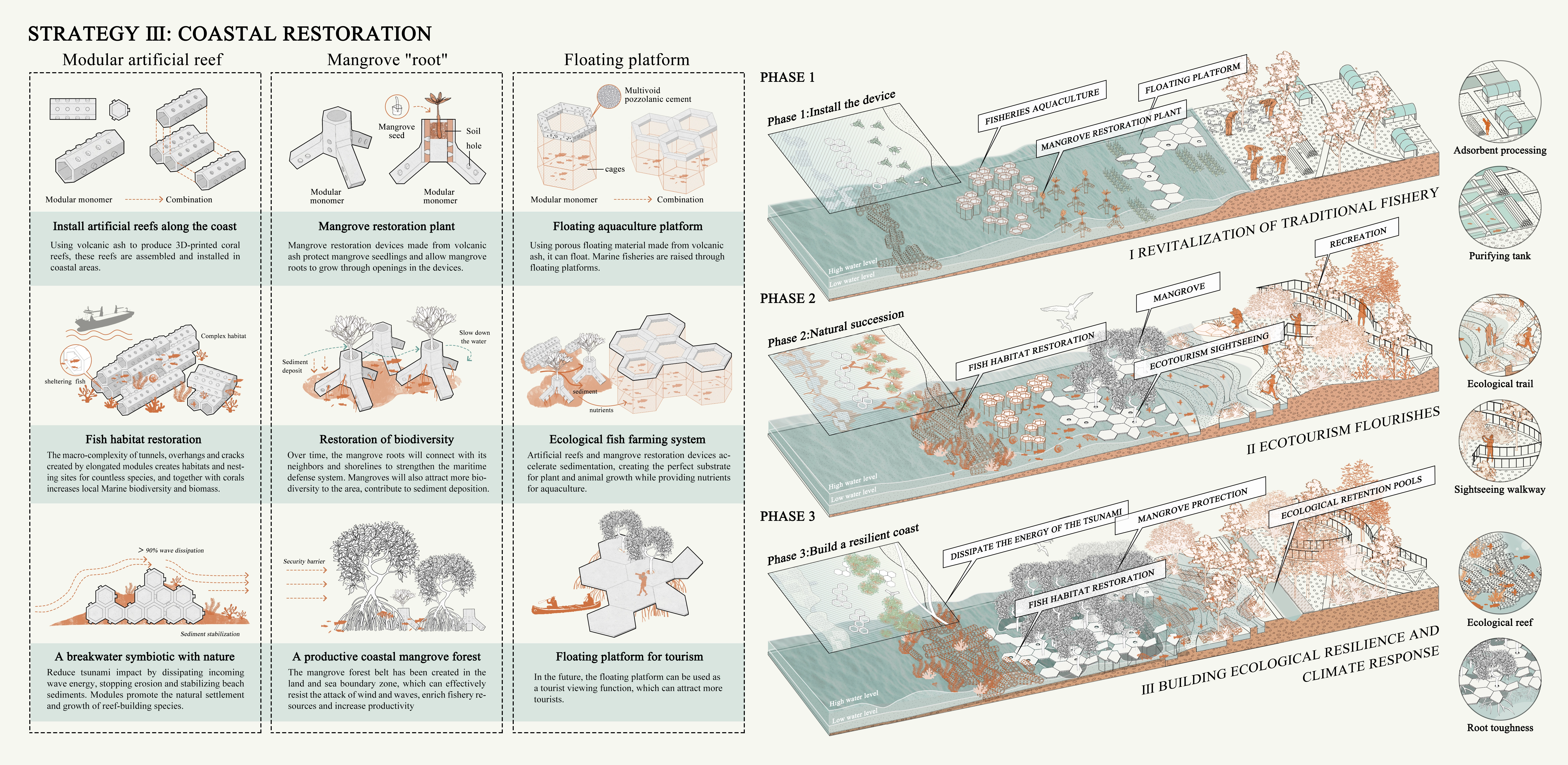 We use modular structures made of volcanic ash (artificial reefs, mangrove root units, and floating platforms) for post-disaster coastal ecological restoration, protect and restore coral reefs, and create a new mangrove habitat through long-term succession, thus revitalizing Tonga's traditional fisheries and promoting the recovery of tourism. The impact of future potential disasters can be mitigated by creating a more resilient coastal interface, while the revitalization of traditional fisheries and tourism will help alleviate the plight of MIRAB.