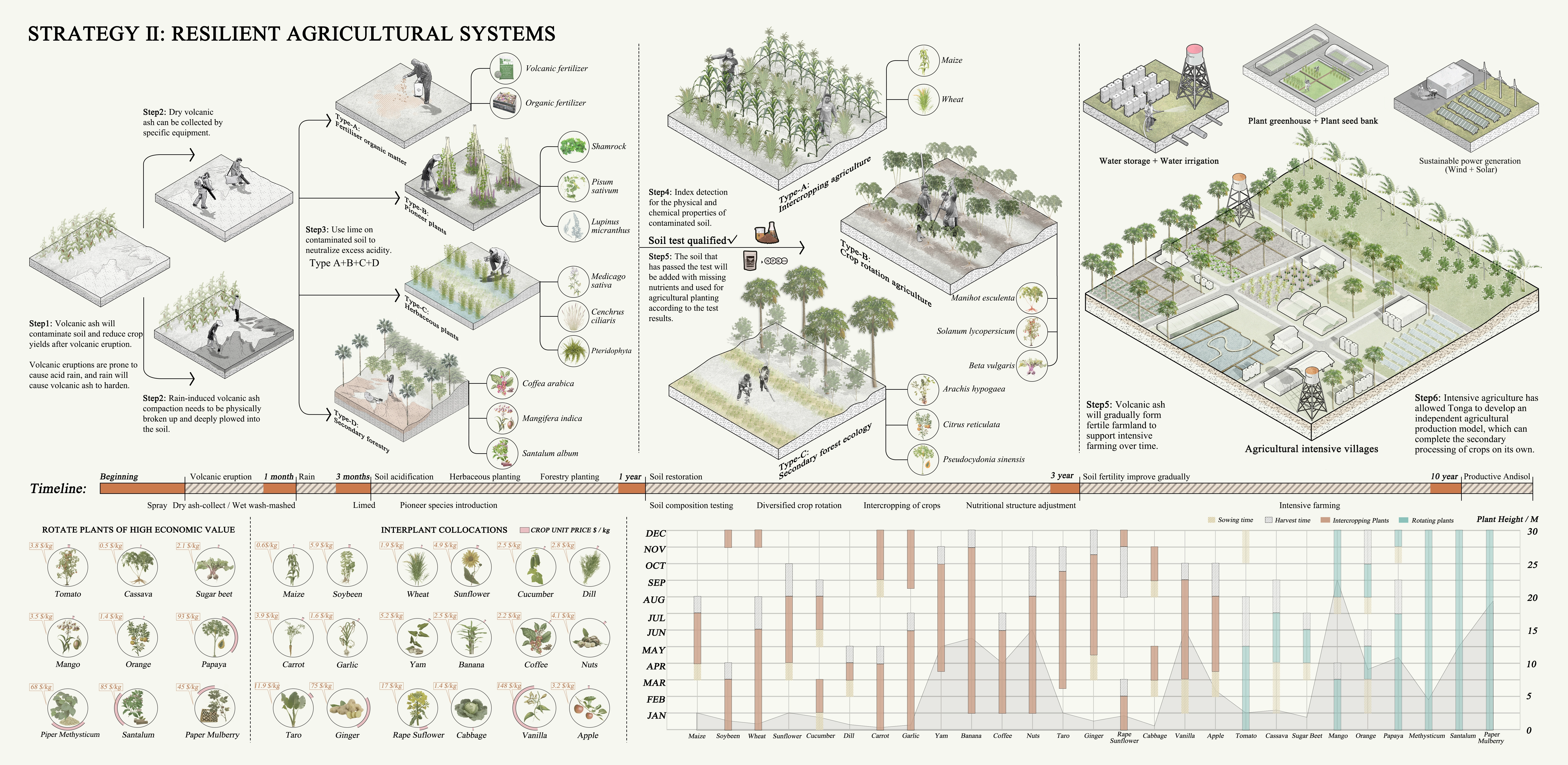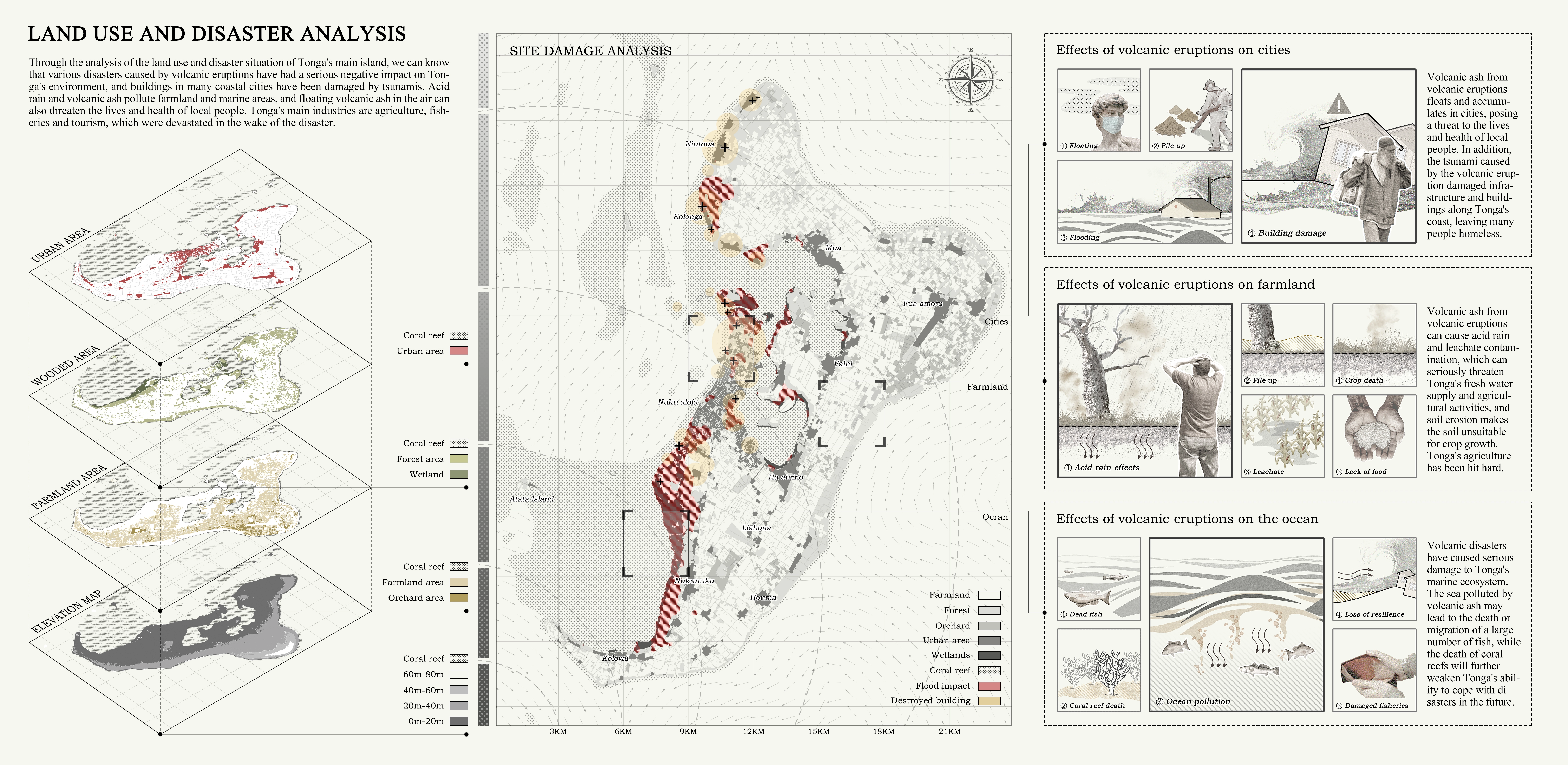 Activated volcanoes, post-disaster reconstruction pressures, and the MIRAB economic model have all increased Tonga's dependence on international aid. The project sees Tonga's reconstruction after the volcanic disaster as an opportunity for sustainable development in the future. Promote environmental and industrial recovery by applying volcanic ash-processed products to cities, farmland, and coastal areas. At the same time, our project accordingly envisages Tonga's strategies for the post-disaster period, the long-term development period, and even another disaster period. Through this holistic approach to a sustainable working landscape, Tonga will get rid of its "MIRAB trap" and achieve ecological and industrial resilience.