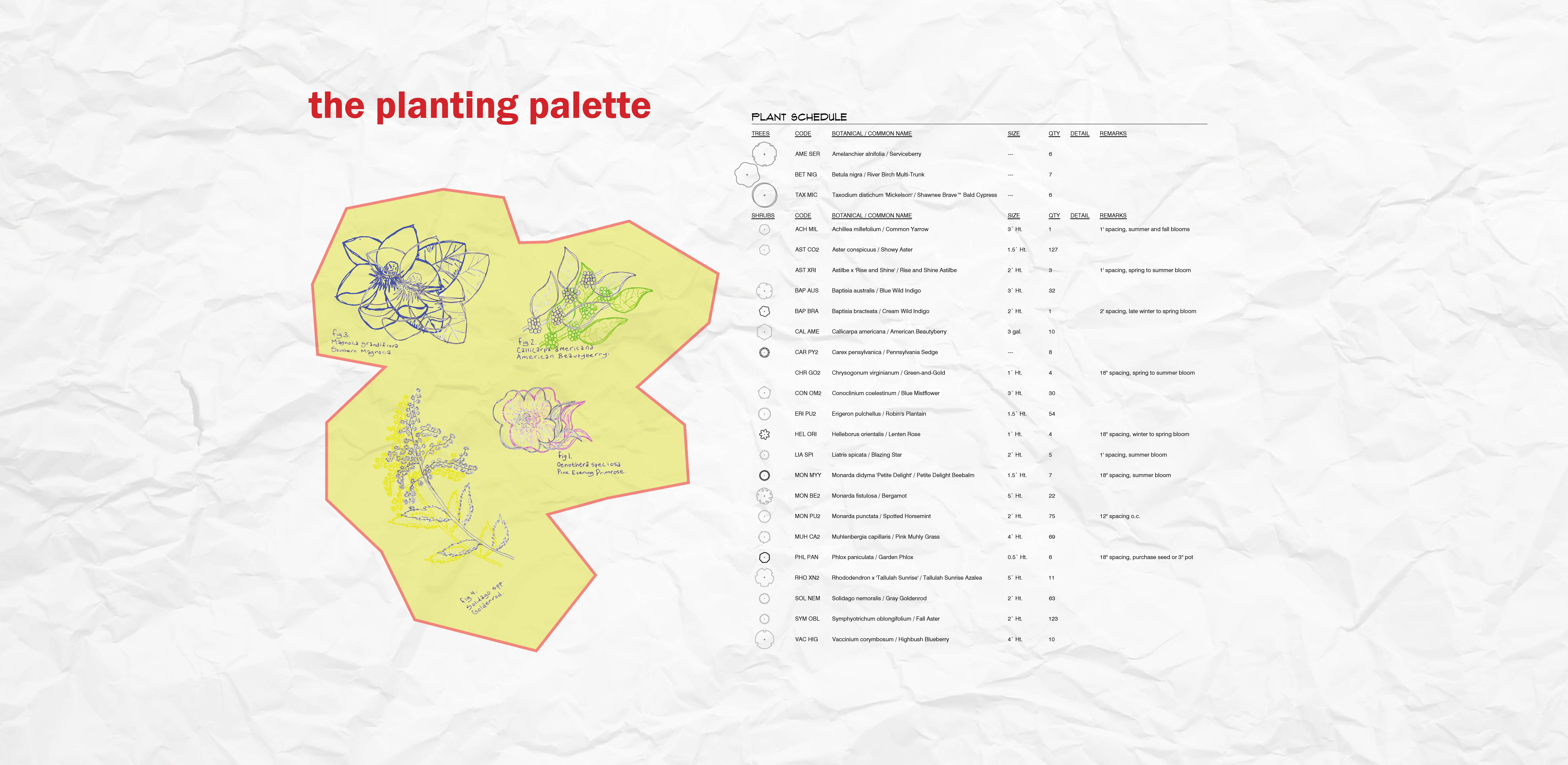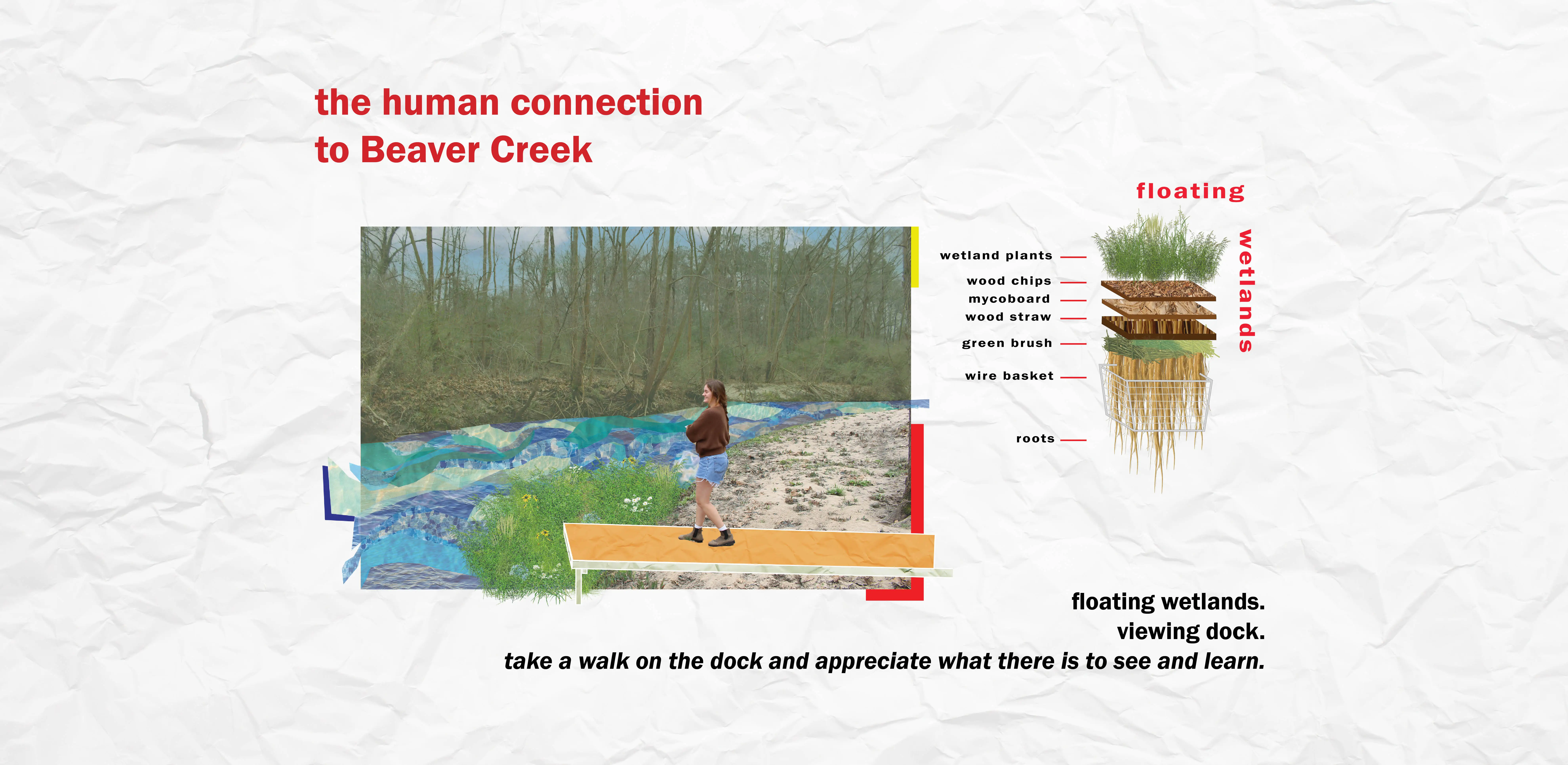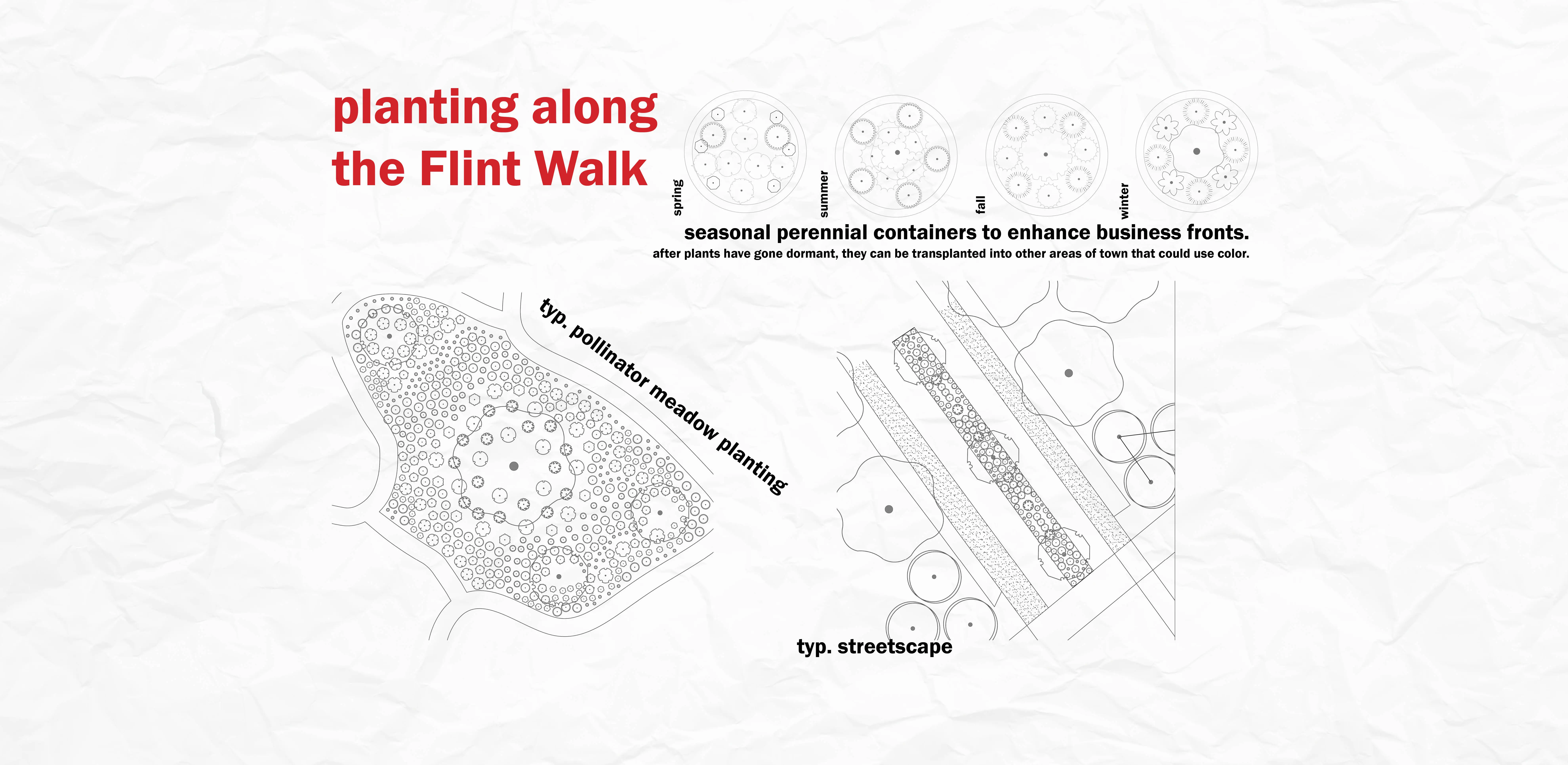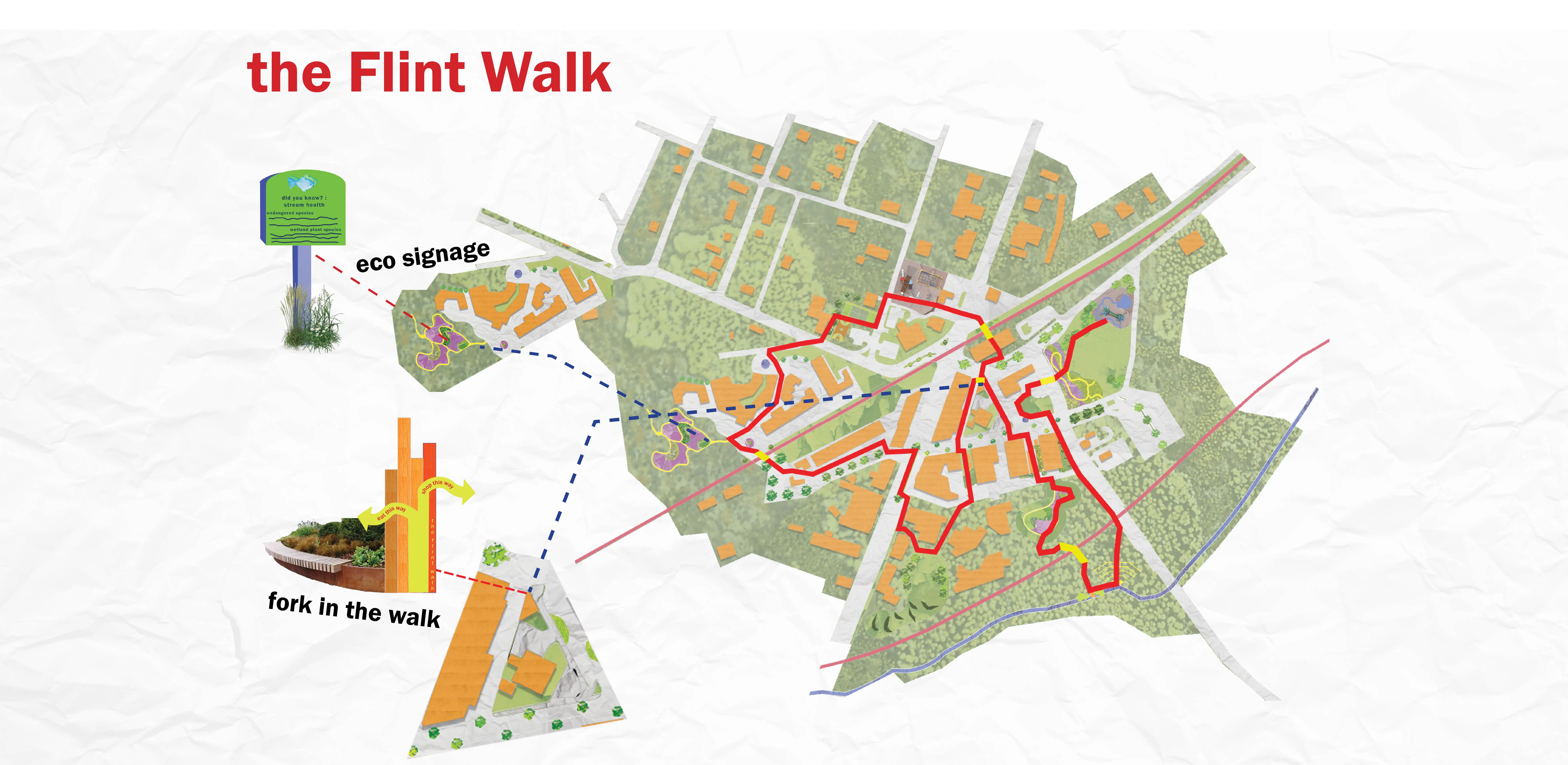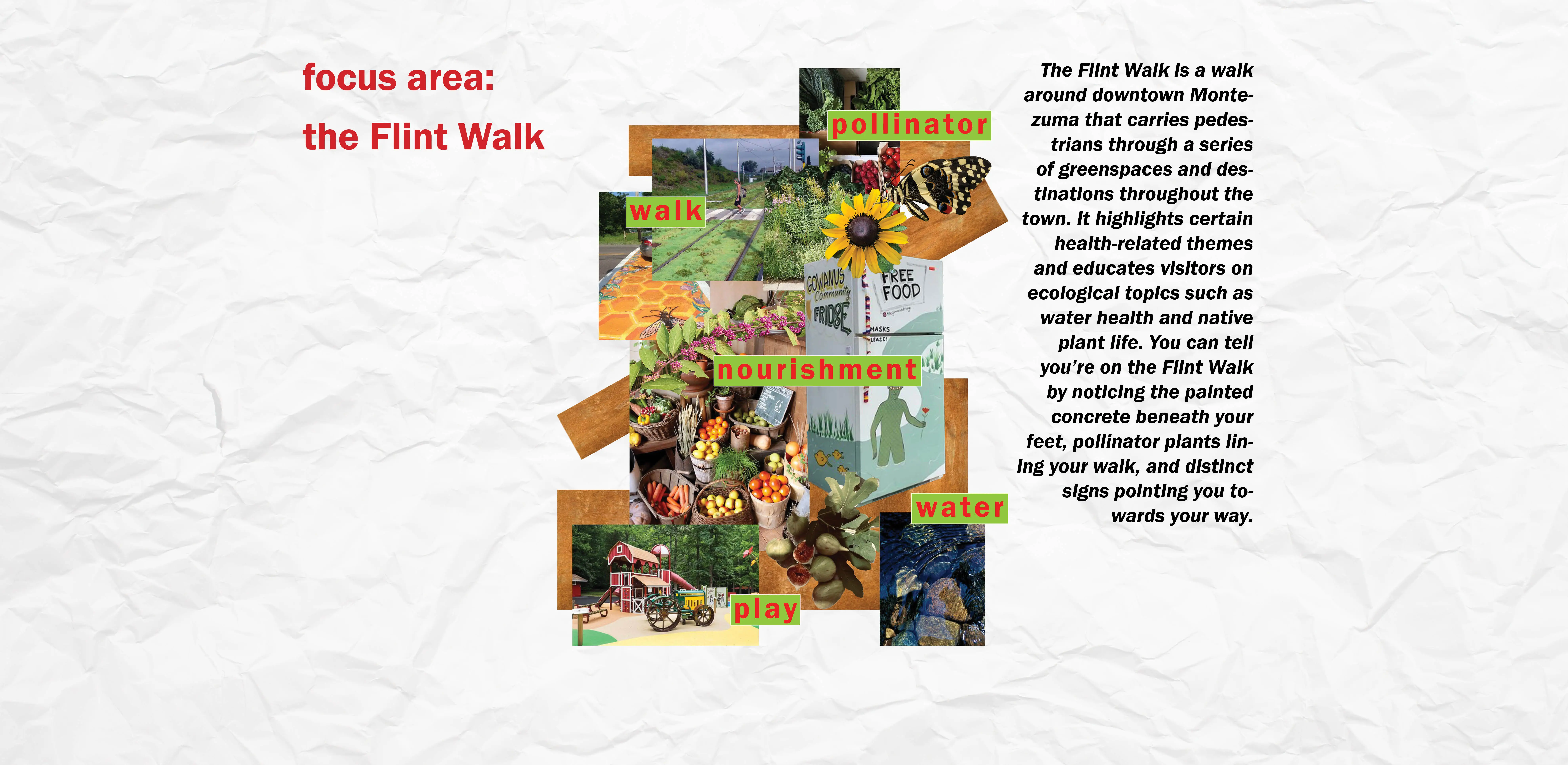 The heart of this project is called “The Flint Walk.” It is a walk around downtown Montezuma that carries pedestrians through a series of greenspaces and destinations throughout the town. It highlights certain health-related themes and educates visitors on ecological topics such as water health and native plant life. You can tell you’re on the Flint Walk by noticing the painted concrete beneath your feet, pollinator plants lining your walk, and distinct signs pointing you towards your way. Every design decision made along the Flint Walk was incepted for its contribution to health- be it human or ecological. The Farmer Kids’ playground promotes physical health, while the floating wetland and viewing dock promote cleaner water and education. All of the design decisions relate in some way to the overall theme of health.