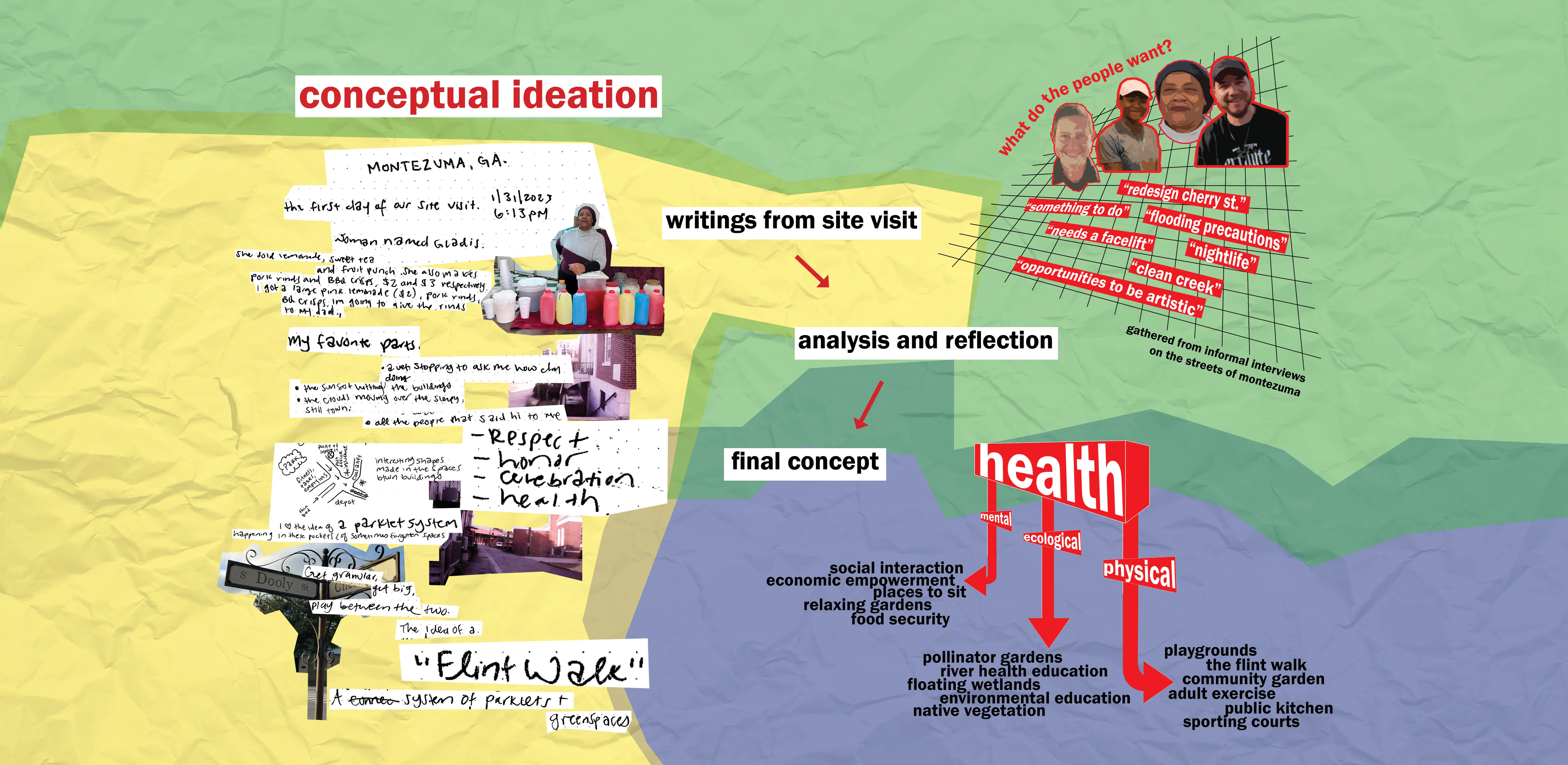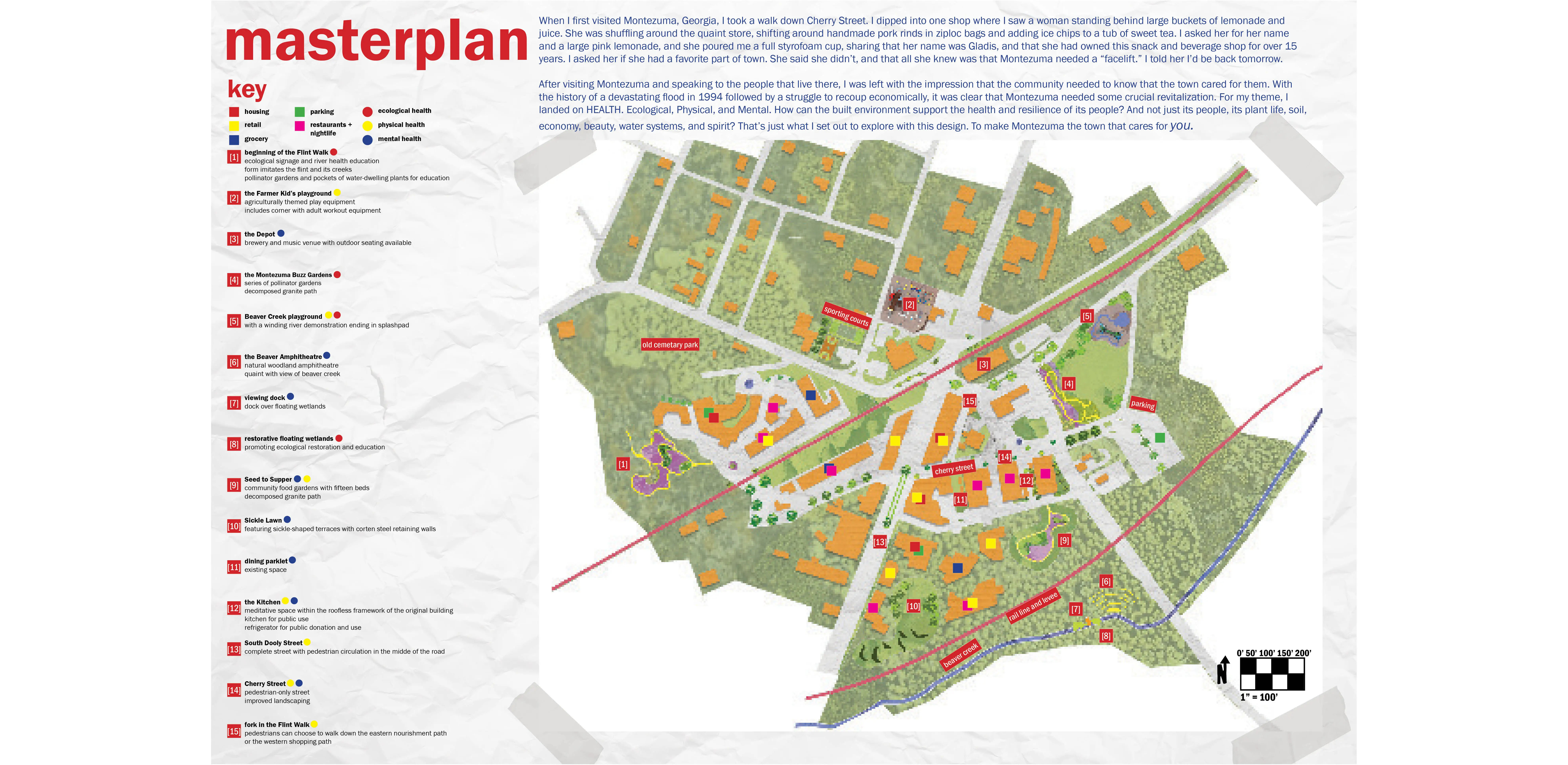 Rubber duck races, cups of lemonade, fields teeming with peaches, peanuts, and pecans. Life seems a little easier in rural Georgia. When tasked with creating a masterplan for Montezuma, GA, I took to the streets- a relaxed ambling- meeting all of the little details that make Montezuma the warm town that it is. But something was missing. Montezuma needed the tools to care for its own people. This project sought to do that; it analyzes the town’s existing resources, creating a framework of design solutions to enhance them. It extrapolates the theme of “Health” on three levels: Ecological, Physical, and Mental, extending an invitation to consider how the built environment can help folks living in the American South lead a more healthy life.