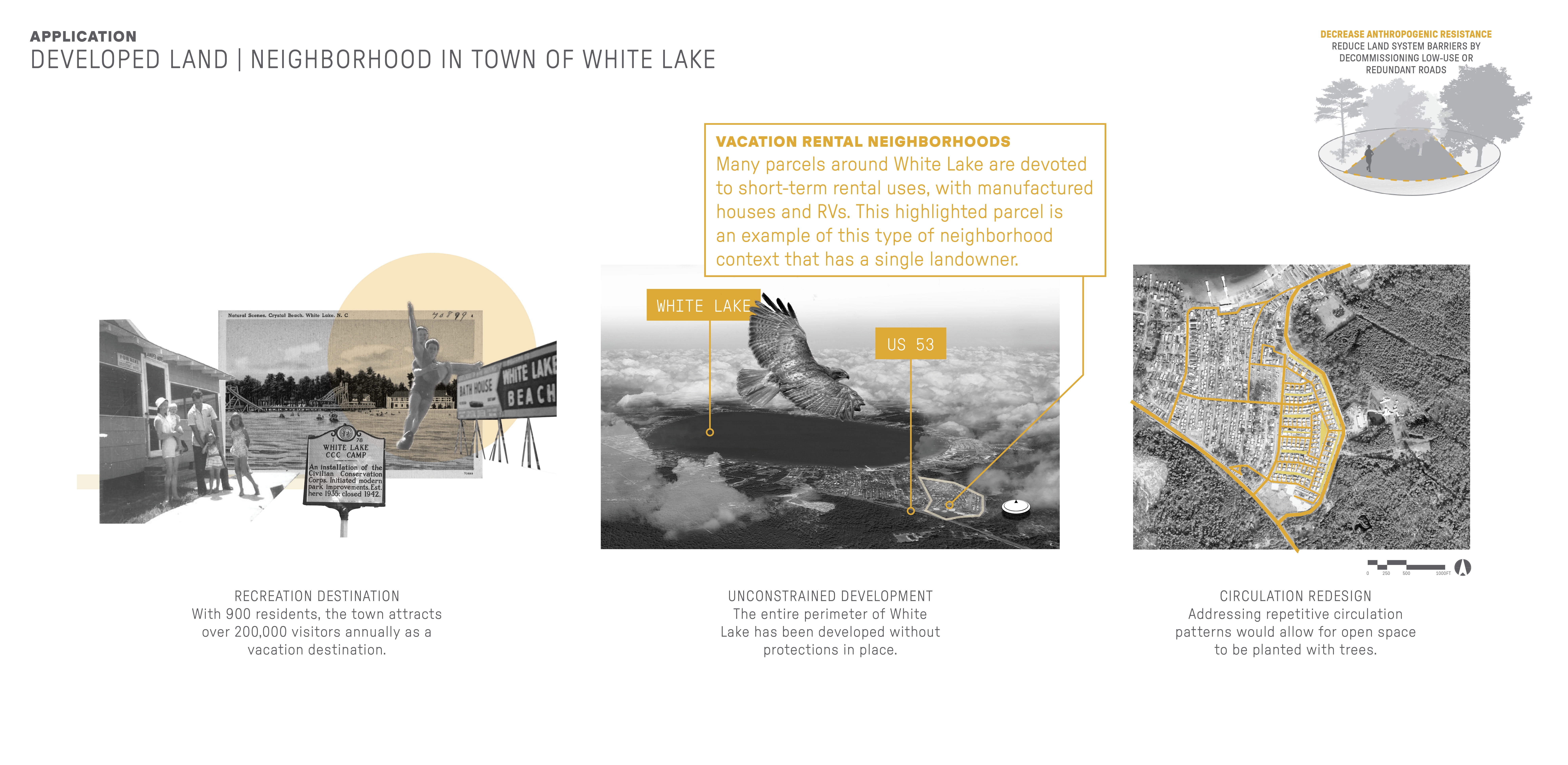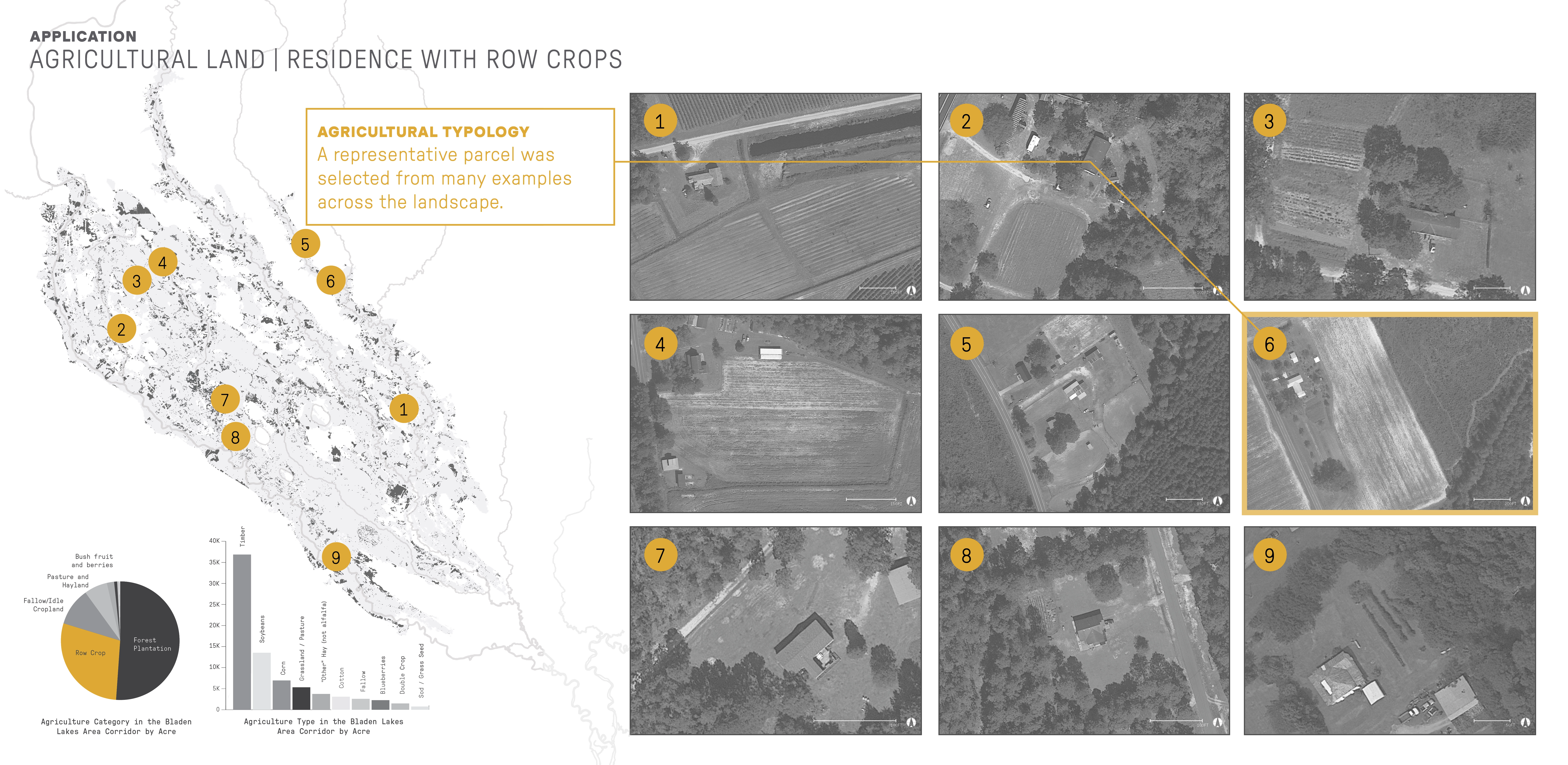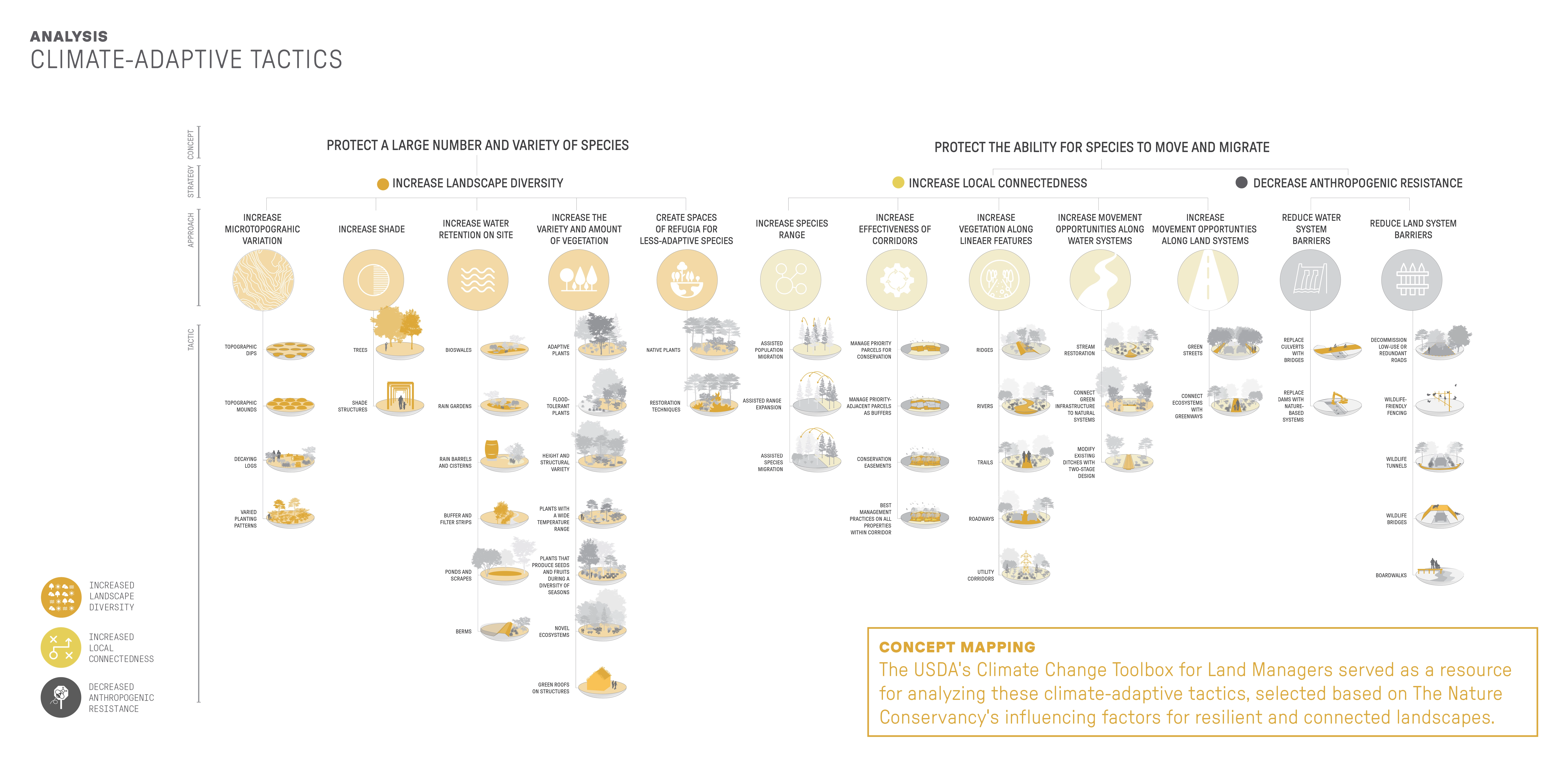 Contextually Sensitive Tactics for Climate Adaptation Projections indicate that the future in this area is hotter and wetter, with more invasives, pests, and wildfires. Research and analysis identified climate-adaptive tactics that fit into two overarching concepts: protecting a large number and variety of species and protecting the ability for species to move and migrate. Strategies that support these concepts are increasing landscape diversity, increasing local connectedness, and decreasing anthropogenic resistance. Forty-five resulting tactics were organized by 12 approaches. These tactics were applied to a range of sites representing five critical land types within the Bladen Lakes area: managed, agricultural, developed, and interstitial land, and priority connection parcels. Site-specific examples illustrate how in-situ design tactics can honor place and program while promoting climate adaptation that combats biodiversity loss.