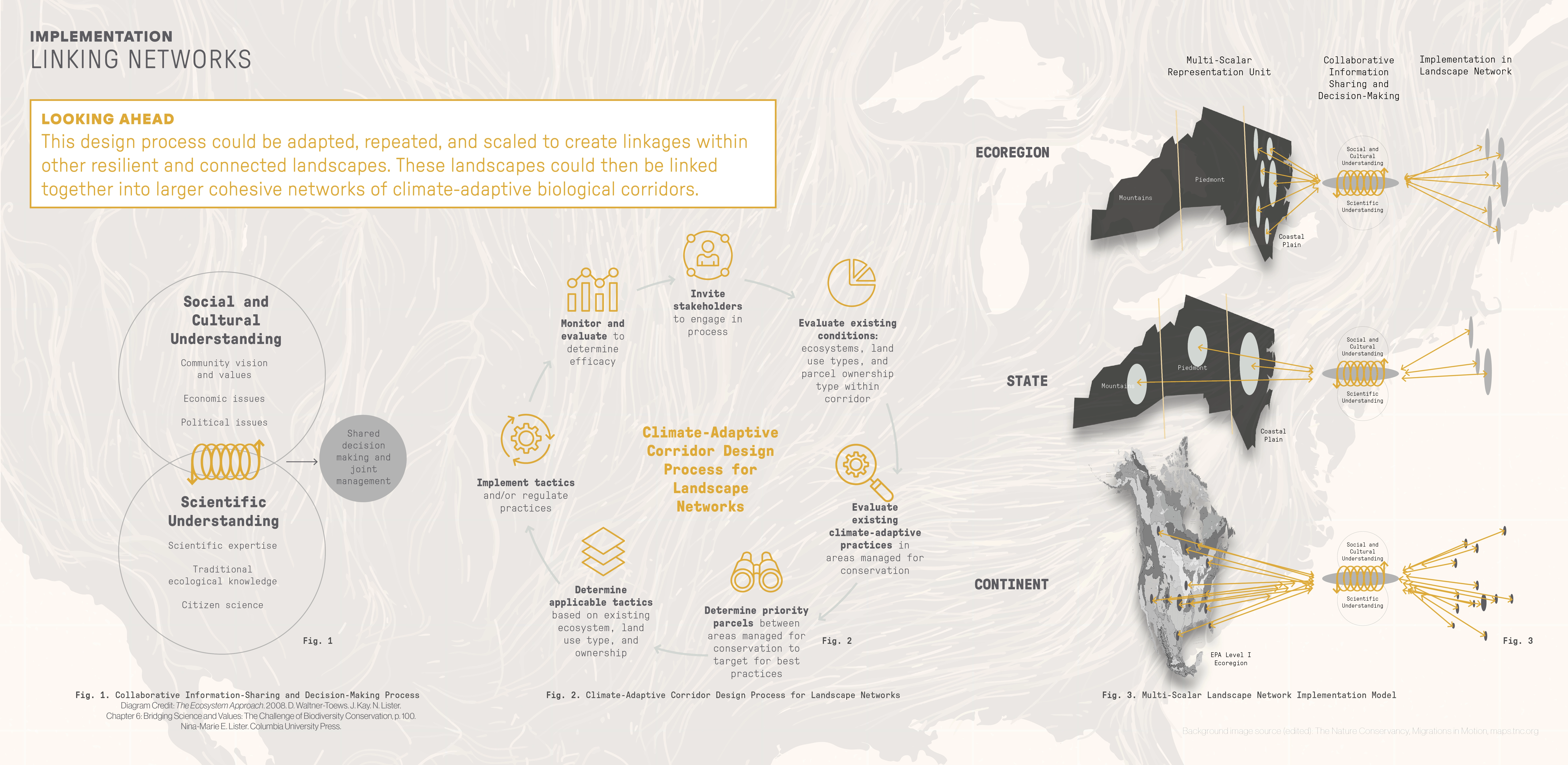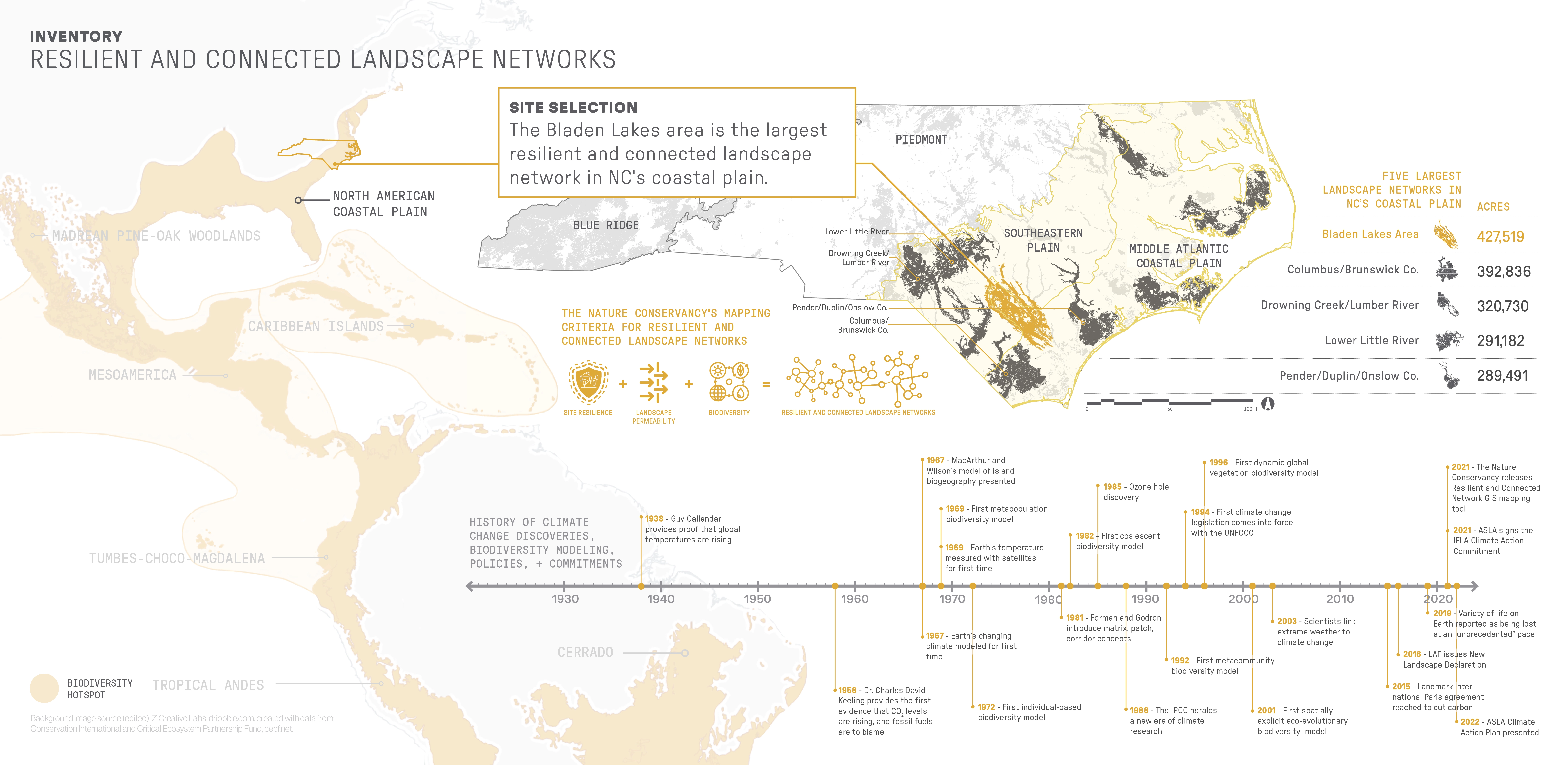 Biodiversity Conservation Through Resilient & Connected Networks As humans cause relatively rapid and global changes to our ecosystems, organisms are struggling to adapt in place to climate change. Habitats are shifting, and climate change will be the leading cause of extinction in the next several decades. Facilitating the movement of species through the landscape ecology principles of matrices, patches, and corridors helps reduce biodiversity loss and its cataclysmic effects on ecosystem services. Landscape architects must provide site-specific planning and design that breathes life into climate research, providing benefits to communities and their ecosystems. Embracing this role and designing for large landscapes would re-situate the profession as a leading voice for planetary change as we collectively confront our biodiversity crisis. Using “resilient and connected landscapes,” as identified by The Nature Conservancy, provides a framework for priority areas for corridor conservation that would sustain a region’s biodiversity and facilitate species movement. Implementing design tactics in these areas would improve site resilience, increase landscape permeability, and protect biodiversity.