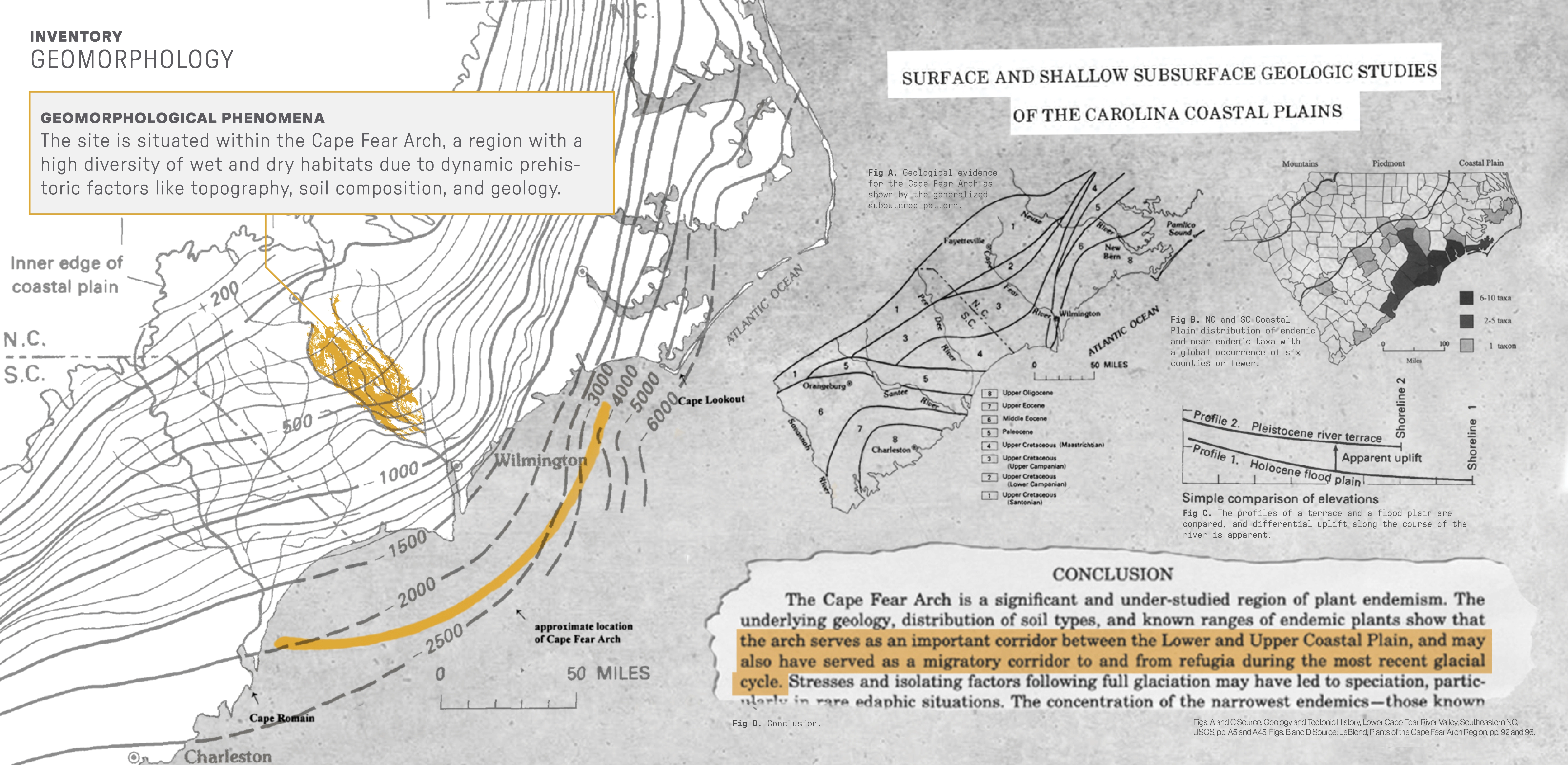 Ecologically Significant Study Area The Coastal Plain’s designation as the world’s 36th “Biodiversity Hotspot” recognizes that protecting and restoring this habitat has global significance in the effort to address the biodiversity crisis. At 55 miles long and 19 miles wide, the Bladen Lakes area is the largest resilient and connected landscape in NC’s Coastal Plain. This site is associated with two notable geomorphological phenomena, the Cape Fear Arch and the Carolina Bays. The Cape Fear Arch represents the largest amount of biodiversity along the Atlantic Coast north of FL. Carolina Bays, elliptical and uniformly oriented shallow wetland depressions fed by rain or groundwater, enhance the area’s biodiversity.