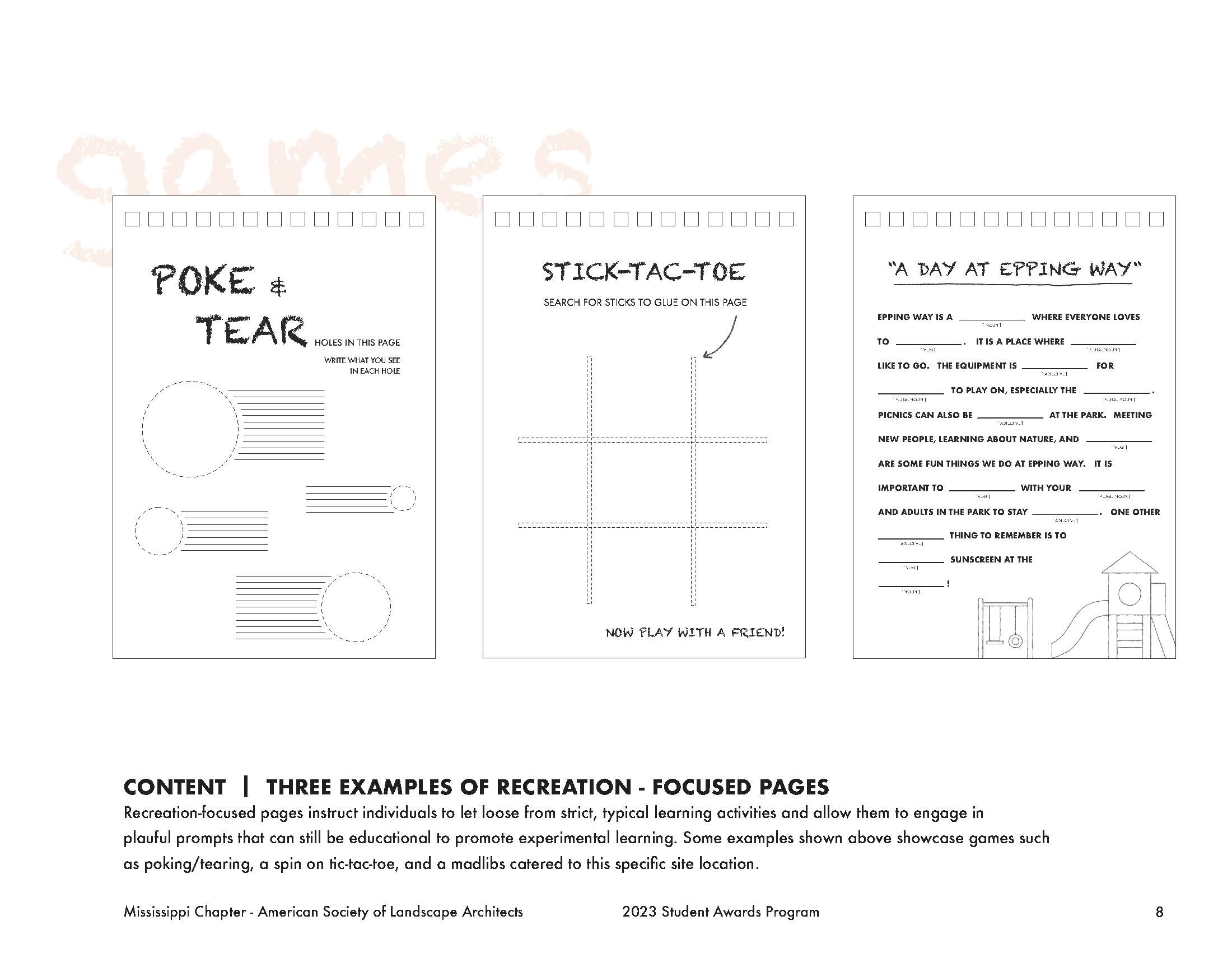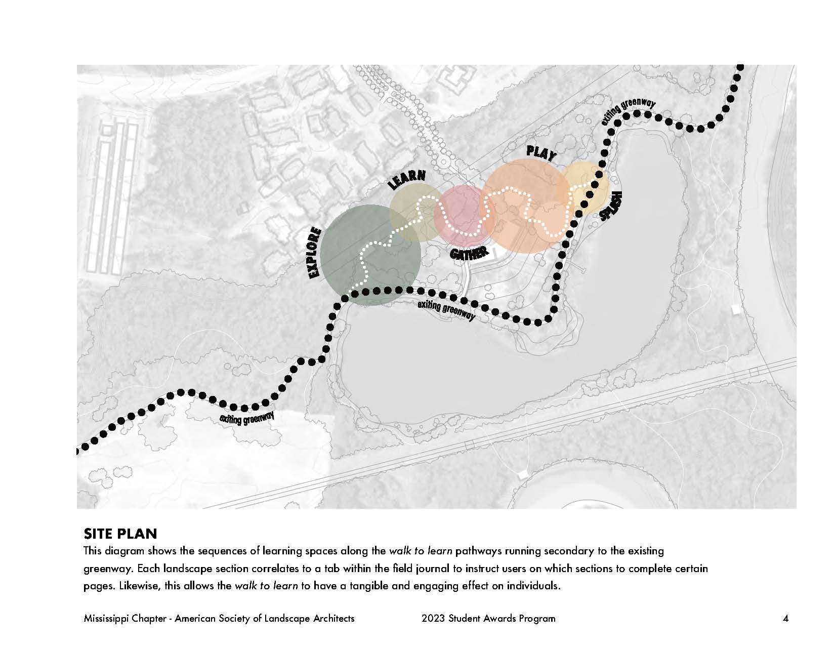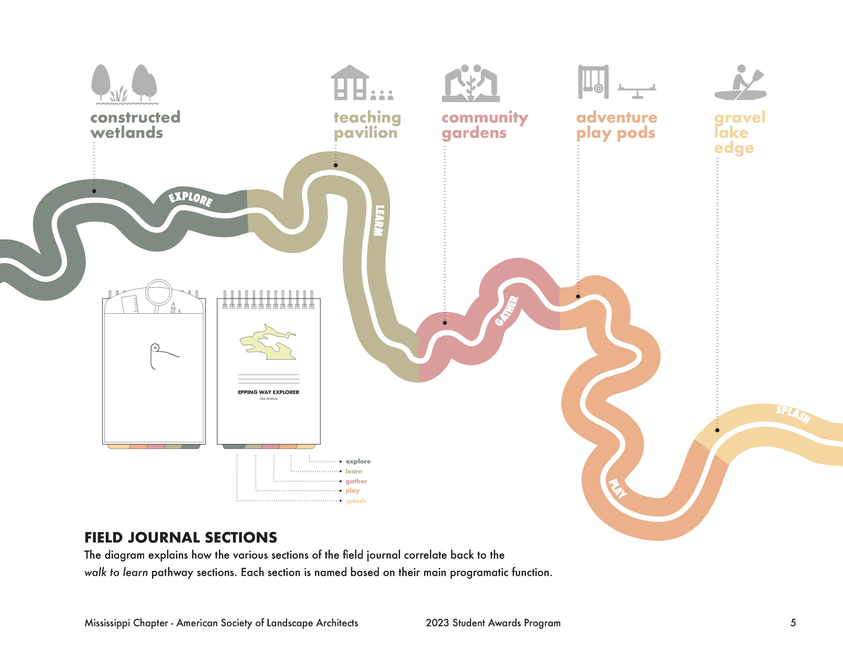 Throughout this design problem, the same question was posed: how can a designer provide the space for children and adults alike to explore new landscape typologies and understand their value? This design proposal leverages the existing site features and introduces new amenities and connections to become an artful, ecological, and interactive environment for its local community, the Wolf River Greenway system, and the greater Memphis area. The proposal integrates three unique programmatic changes to achieve this goal: experiential learning and a play pathway called the walk to learn. Playing off the walk to learn, the project showed that there was even more that could be done for community educational outreach for natural and curated landscapes within the urban context. This led to creating a field journal filled with prompts and guidelines to direct children (and adults) along the site to engage and explore the landscape. The walk to learn consists of five sections based on their programmatic functions in the masterplan: explore, learn, gather, play, and splash. The explore section encompasses the constructed wetlands and promotes people interacting with and becoming comfortable in natural landscapes and exploring the plant life and habitats that it inhabits. The learn section is a designated area for a teaching pavilion with worktables to create a space for field trip groups to convene or rest along the pathway. The gather section covers the community gardens which allow for exploration of a more manicured landscape maintained by surrounding residents. The play section caters to the more typical play. Lastly, the splash section covers the reconstructed lake edge with a low-slope gravel edge to allow for easy water access. Each section is specific to a different landscape typology to promote various learning potentials. The field journal pages in each section correlate to its section on the site plan by steering the prompts to engage users in both tactile and intellectual ways.