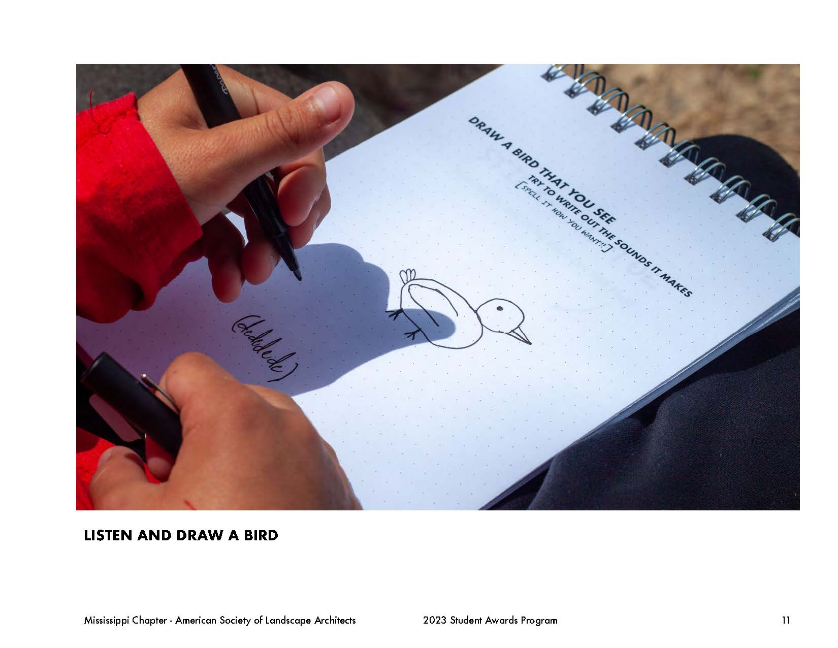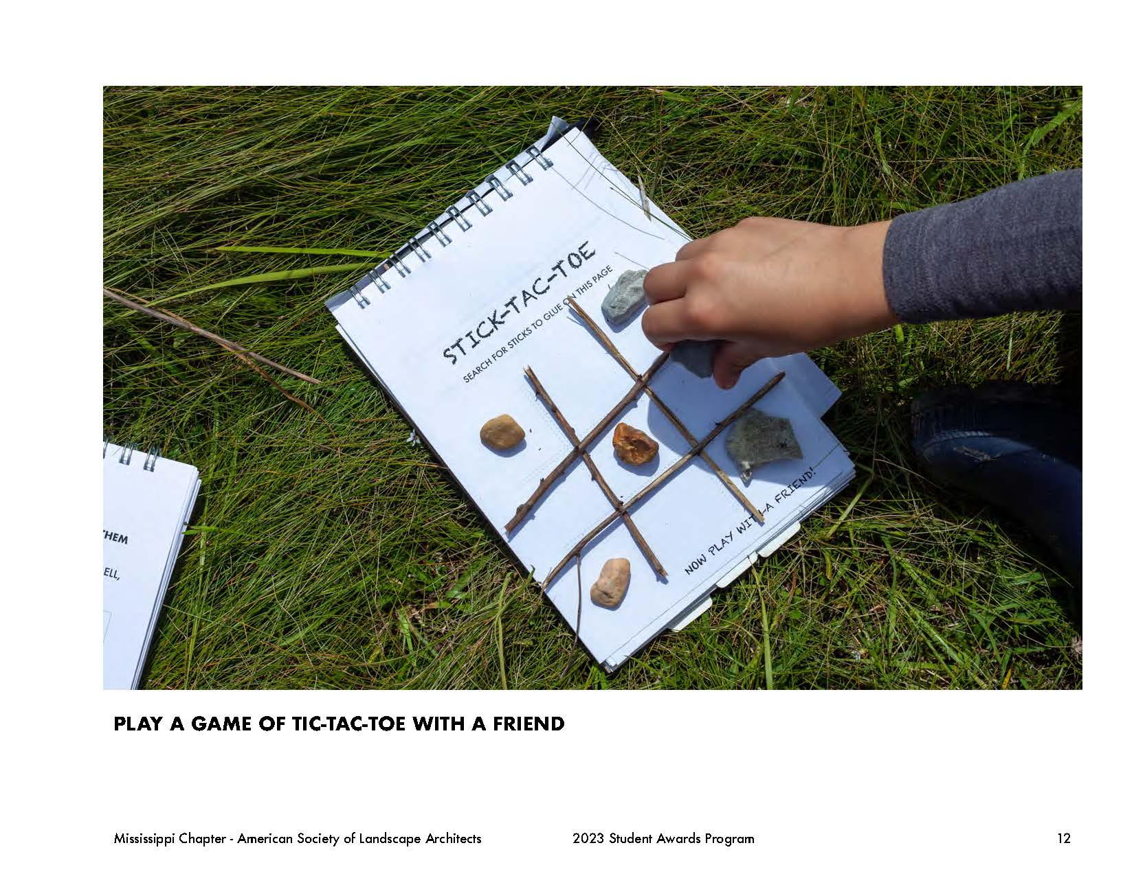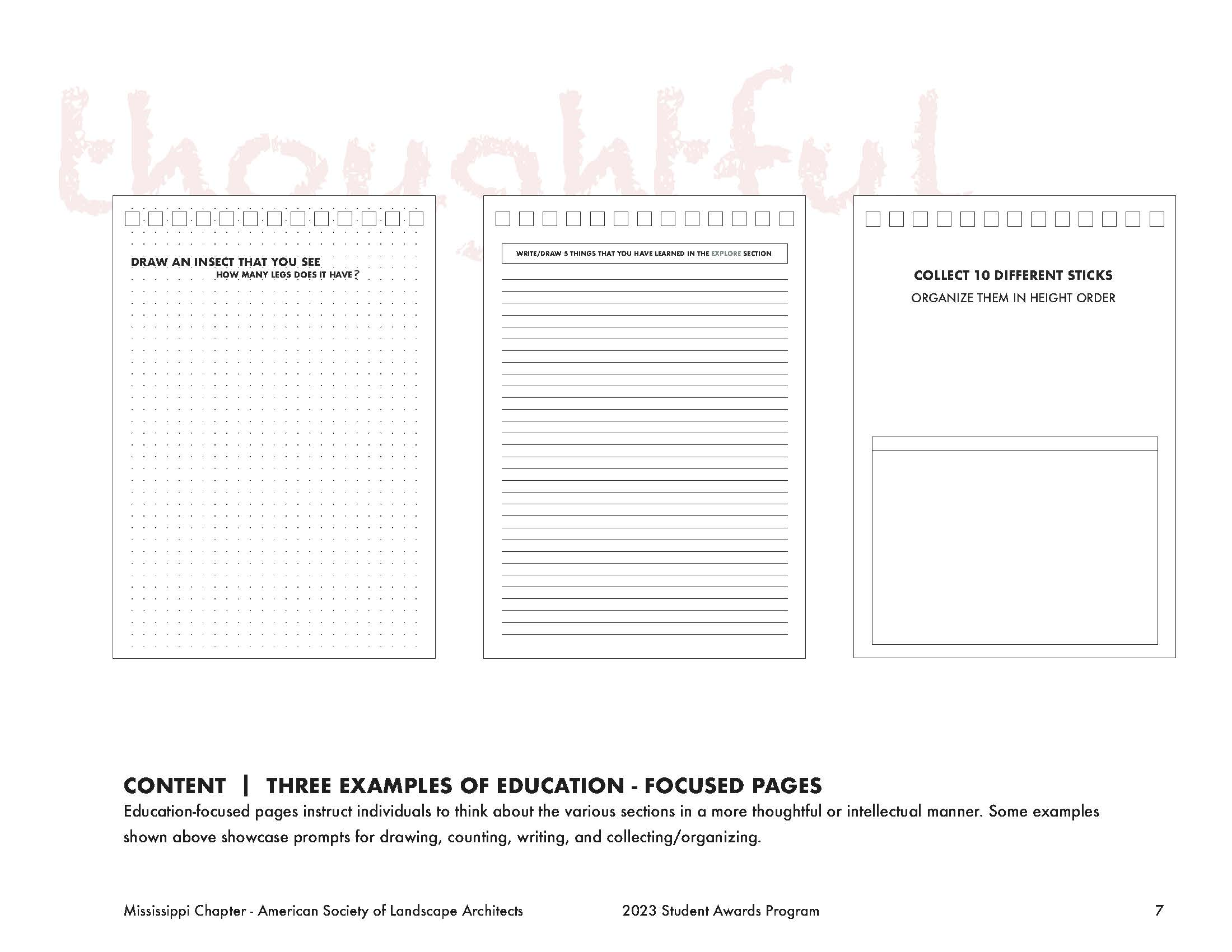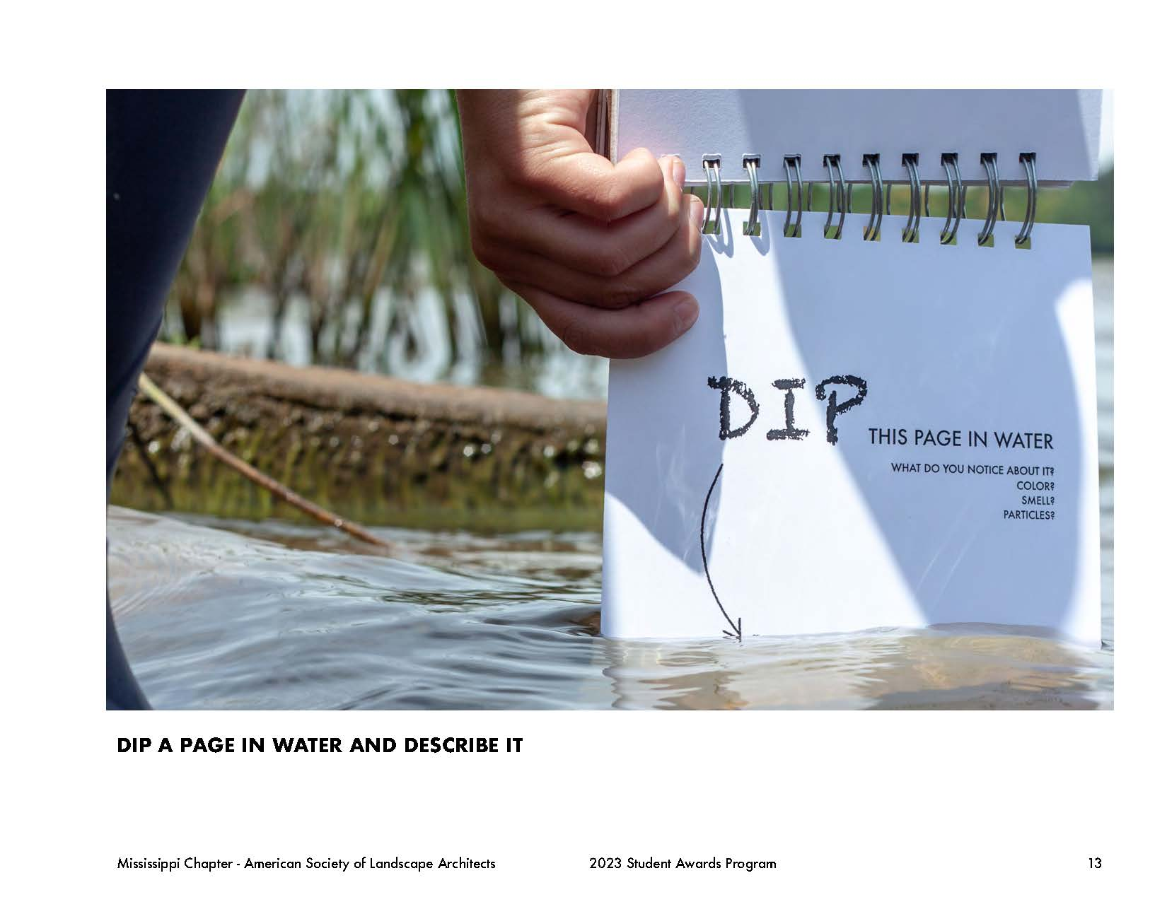 Throughout this design problem, the same question was posed: how can a designer provide the space for children and adults alike to explore new landscape typologies and understand their value? This design proposal leverages the existing site features and introduces new amenities and connections to become an artful, ecological, and interactive environment for its local community, the Wolf River Greenway system, and the greater Memphis area. The proposal integrates three unique programmatic changes to achieve this goal: experiential learning and a play pathway called the walk to learn. Playing off the walk to learn, the project showed that there was even more that could be done for community educational outreach for natural and curated landscapes within the urban context. This led to creating a field journal filled with prompts and guidelines to direct children (and adults) along the site to engage and explore the landscape. The walk to learn consists of five sections based on their programmatic functions in the masterplan: explore, learn, gather, play, and splash. The explore section encompasses the constructed wetlands and promotes people interacting with and becoming comfortable in natural landscapes and exploring the plant life and habitats that it inhabits. The learn section is a designated area for a teaching pavilion with worktables to create a space for field trip groups to convene or rest along the pathway. The gather section covers the community gardens which allow for exploration of a more manicured landscape maintained by surrounding residents. The play section caters to the more typical play. Lastly, the splash section covers the reconstructed lake edge with a low-slope gravel edge to allow for easy water access. Each section is specific to a different landscape typology to promote various learning potentials. The field journal pages in each section correlate to its section on the site plan by steering the prompts to engage users in both tactile and intellectual ways.