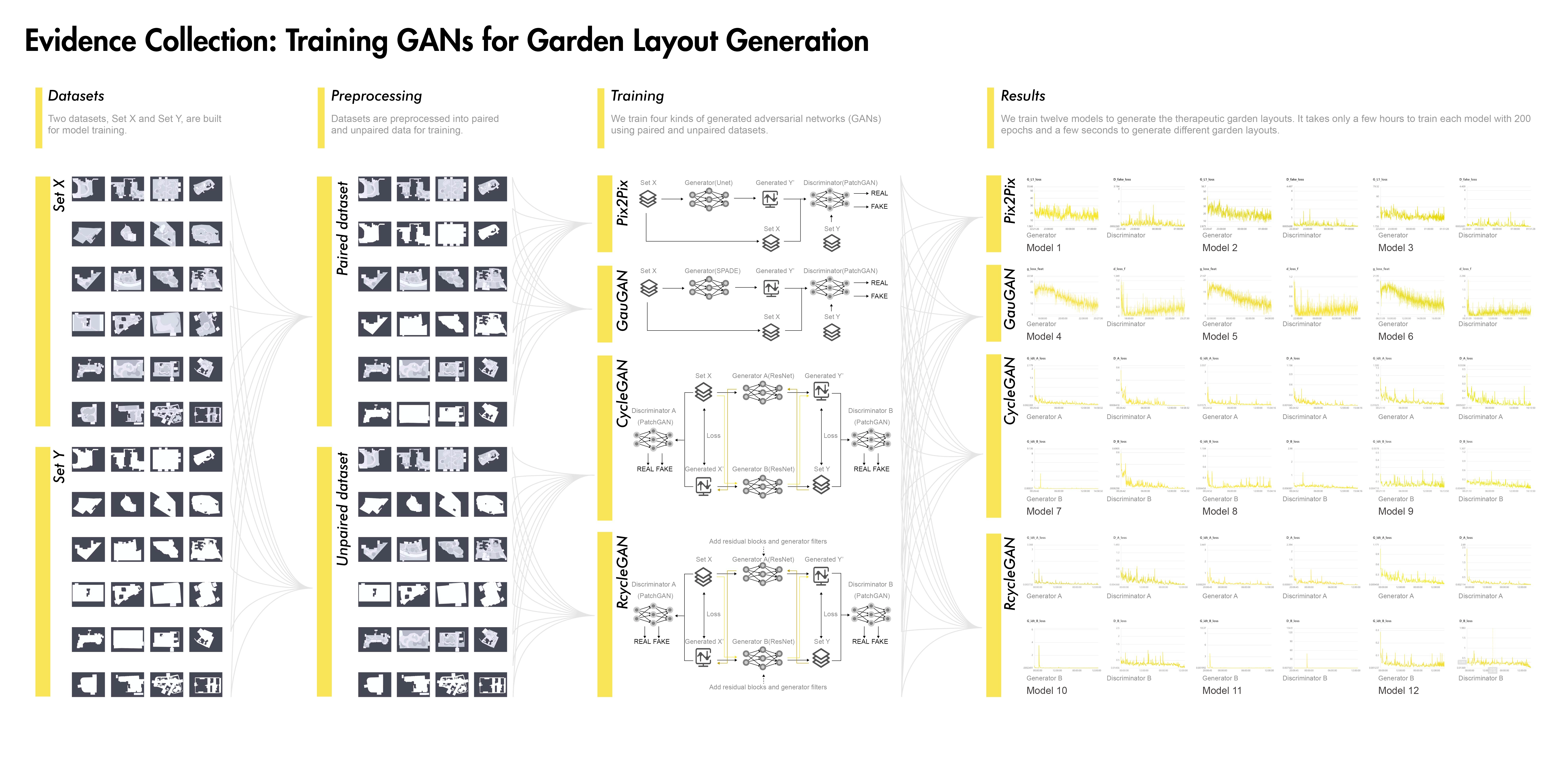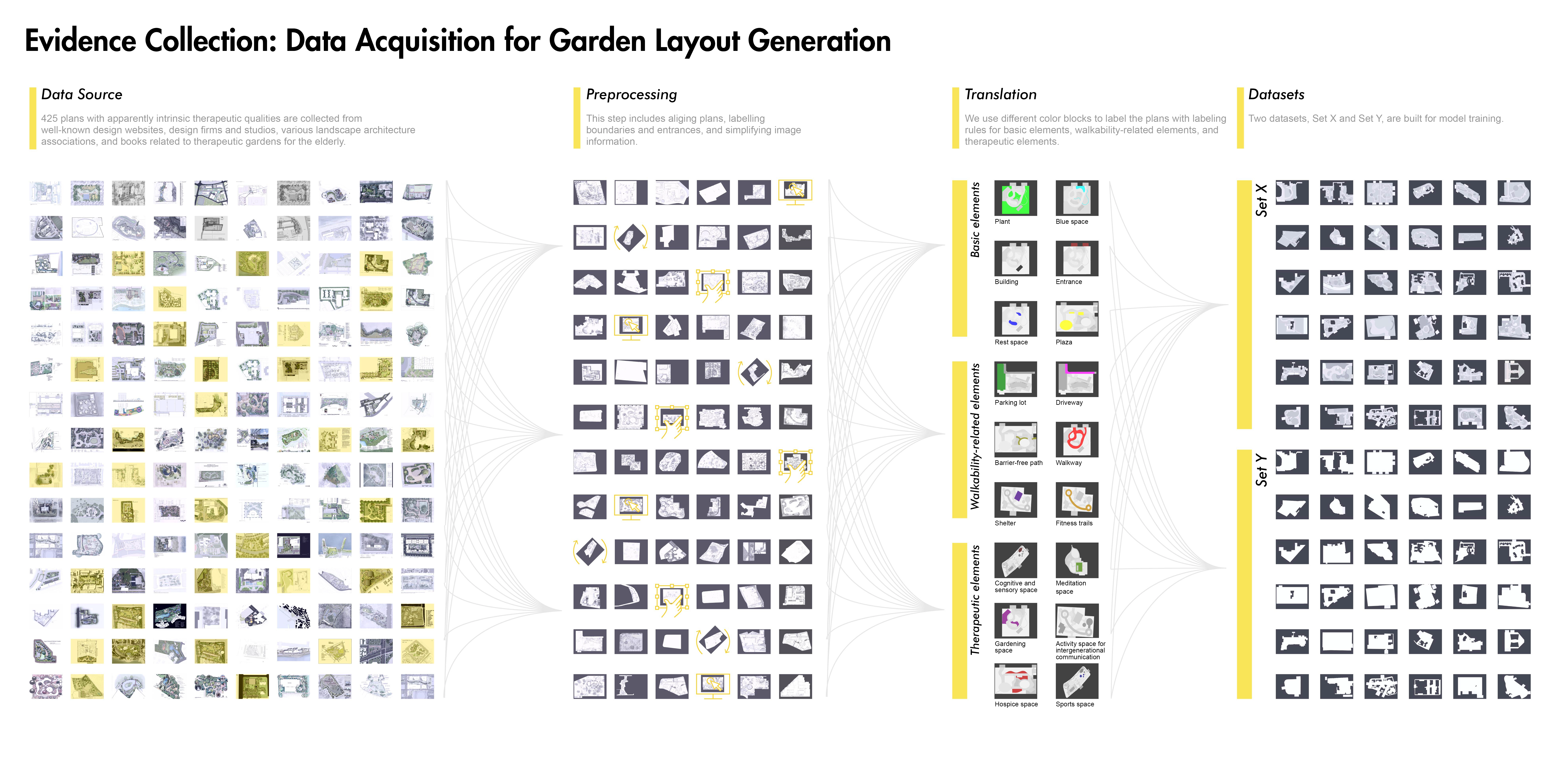 China’s population is aging dramatically, and health issue in old age has become a vital social concern. Providing green spaces, especially therapeutic gardens, is an effective measure to promote various dimensions of health for the elderly by encouraging physical activity, relieving mental fatigue, and facilitating social interaction (Taheri et al., 2021). The Evidence-based Health Design in Landscape Architecture (EBHDL) process model is often considered a scientifically valid approach to deliver on stated health outcomes of therapeutic or healing places (Stigsdotter & Sidenius, 2020). The model provides the basis for design decisions through scientific methods, making the design more rigorous, rational, and scientific. However, the process is a spiral that is time-consuming, labor-intensive, and costly. The growth of artificial intelligence is possible to improve the EBHDL process to create a dynamic and scientific method for therapeutic garden design. Especially the Generative Adversarial Networks (GANs), in which ideas of programming and mass can provide more inspiration for designers and evaluate design conveniently and efficiently.