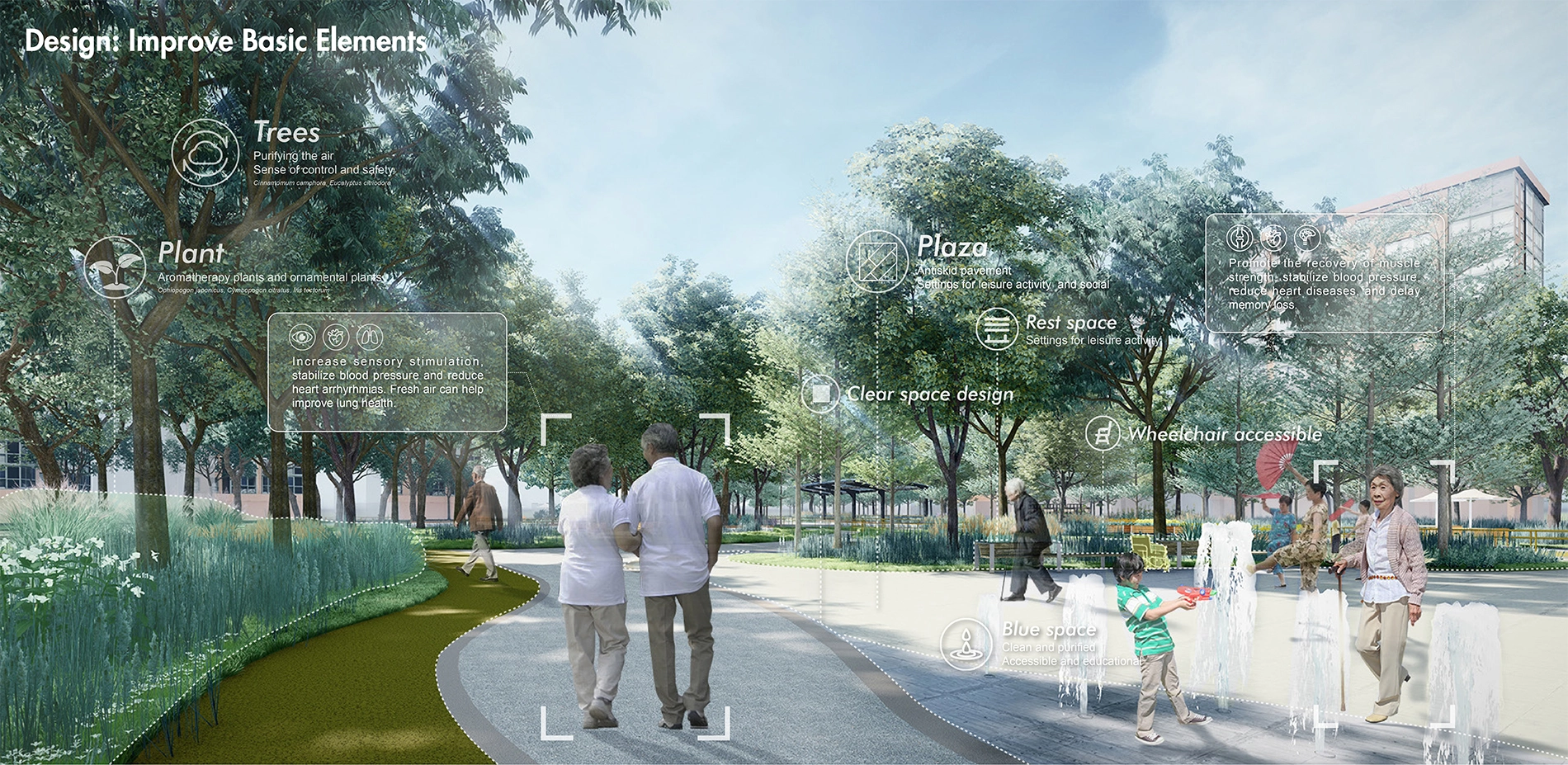 3) Design a Therapeutic Garden for the Elderly. We use the strategies to design and optimize the generated garden layout including basic garden function, walkability-related facilities, and therapeutic opportunities.