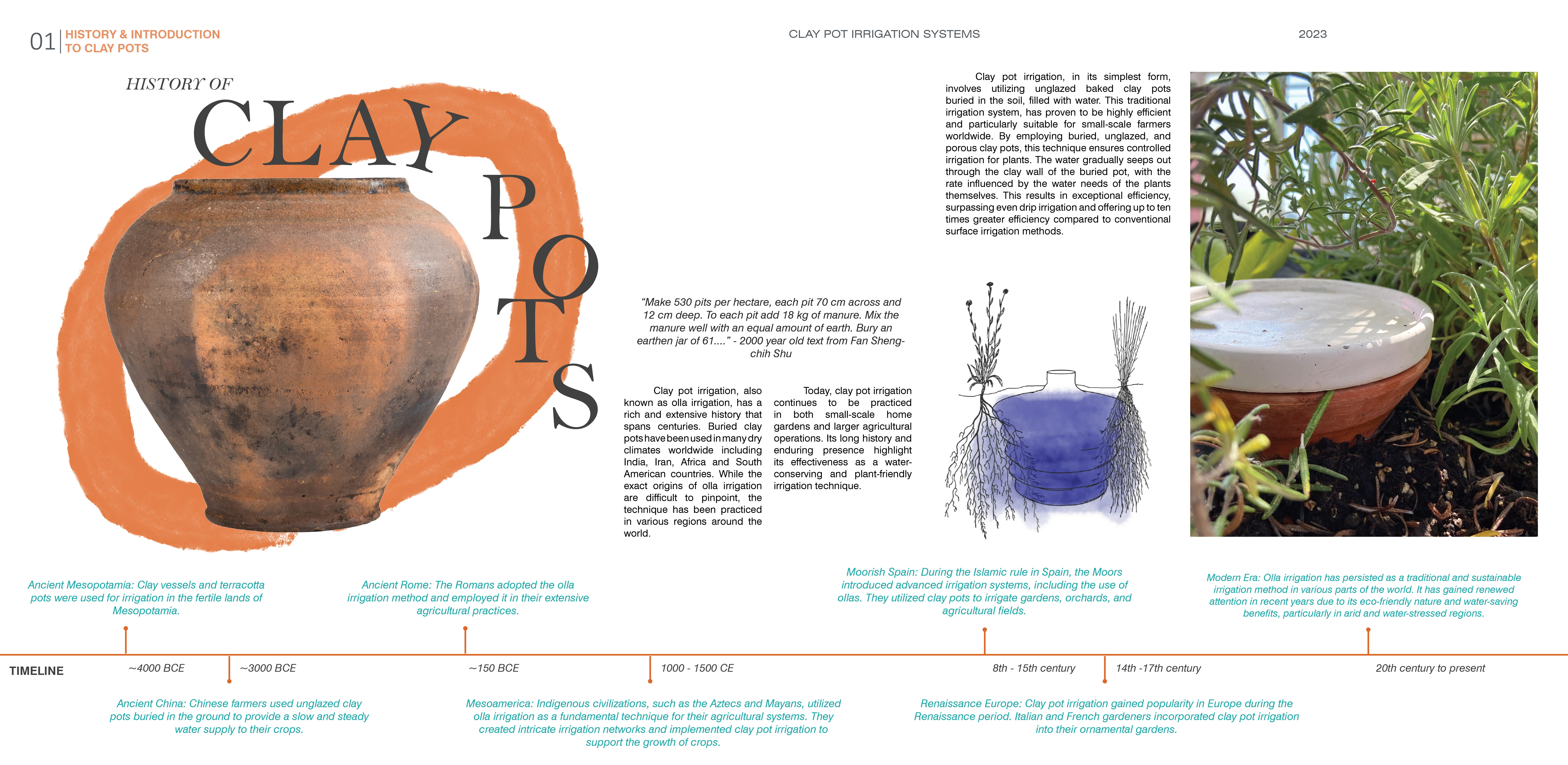 Climate change will alter growing conditions, necessitating adaptive irrigation practices. Landscape architects, trained in systems thinking, ecological planning, and water conservation knowledge, must urgently respond to landscapes facing water scarcity. To address future droughts, efficient irrigation systems, like buried clay pots, can be used and could enhance landscape design. These self-regulating irrigation systems are particularly efficient because the water flow rate varies with plant water demand. Plant survival and growth are dramatically increased with these systems, allowing for more robust plants that better tolerate drought.