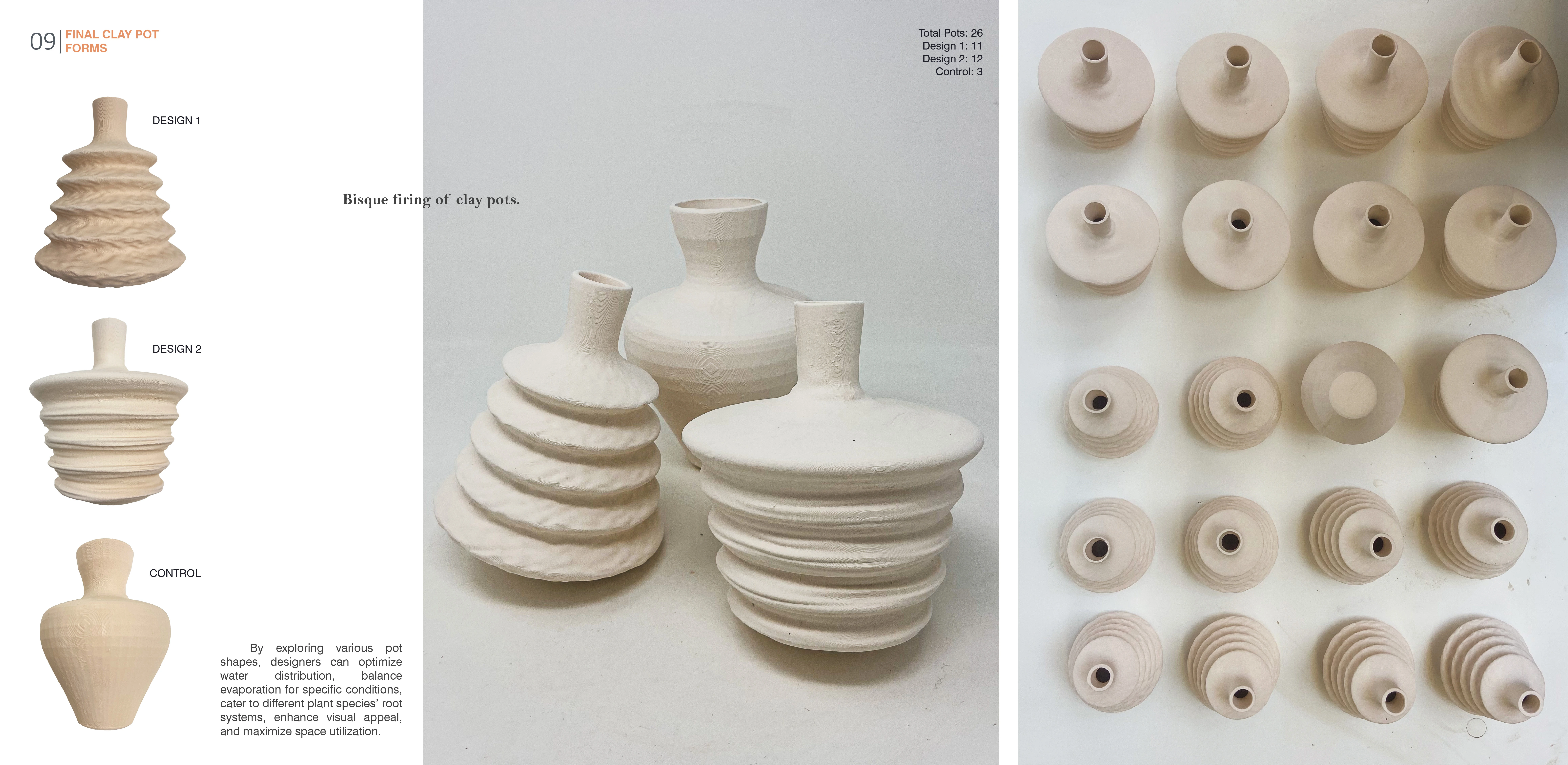 This project aimed to establish an iterative design approach using digital technologies, like 3D printing, to enhance irrigation performance, reduce water usage, and improve land management through the design of ceramic clay pots. While clay pots could be purchased, 3D printers provided opportunities for exploring pot design and efficiency. Multiple casts of homogenous pots were made using 3D-printed PLA master molds, ensuring greater accuracy and reproducibility. The slip casting technique enabled the creation of complex shapes not achievable with conventional methods.
