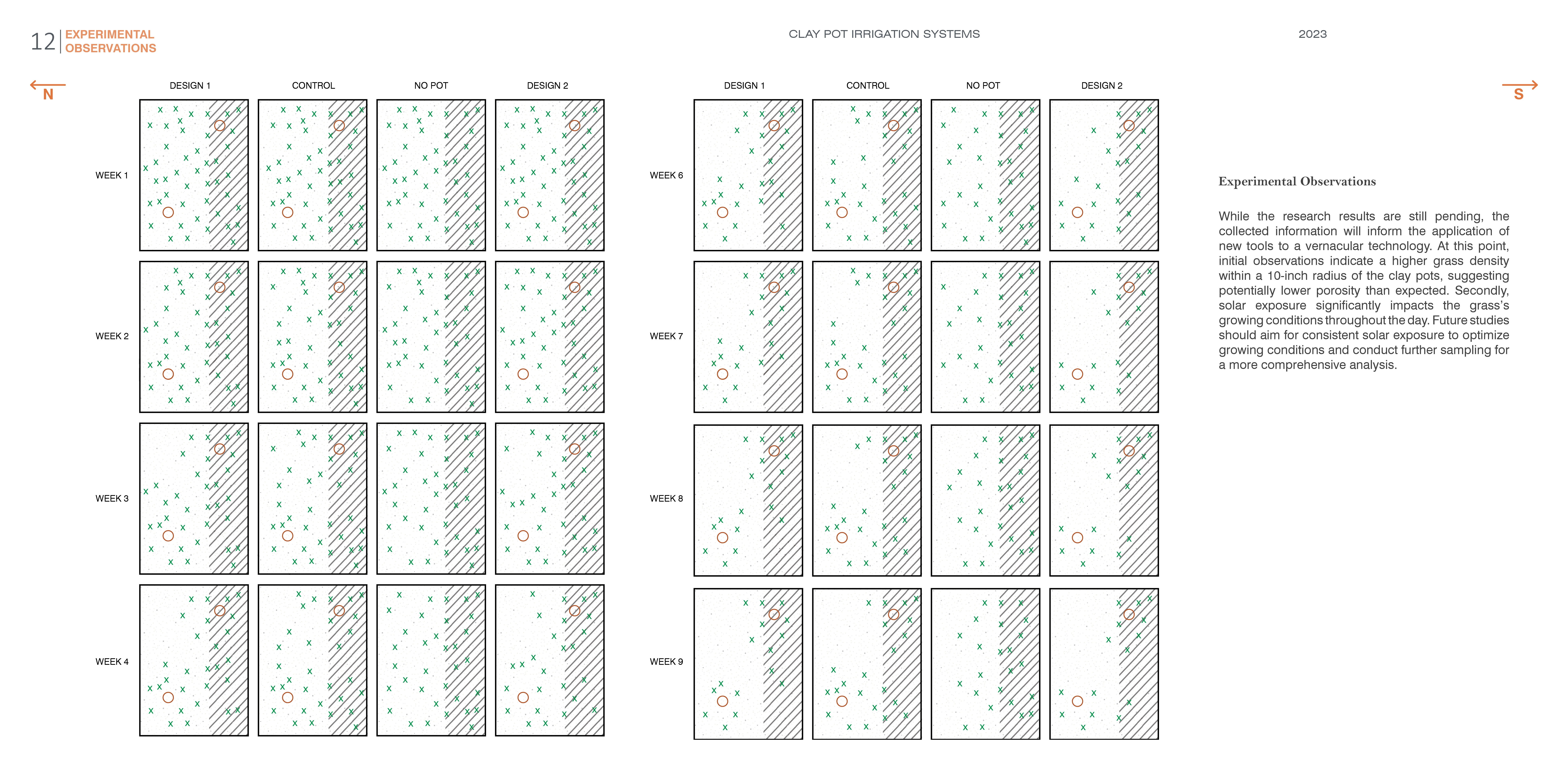 The greenhouse experiment utilized four containers filled with sand and seeded with roemer's fescue grass to evaluate the different pot designs. Two pots from each design were allocated to three containers, while the fourth container served as a control without a clay pot. The containers were uniformly watered by pouring water into the pots or by spraying the same amount of water into the control container. This research aims to determine which pot design yields the highest biomass of native grass, providing insights into the project's success. While the research results are still pending, the collected information will inform the application of new tools to a vernacular technology. However, initial observations indicate a higher grass density within a 10-inch radius of the clay pots, suggesting potentially lower porosity than expected. Secondly, solar exposure significantly impacts the grass's growing conditions throughout the day. Future studies should aim for consistent solar exposure to optimize growing conditions and conduct further sampling for a more comprehensive analysis.