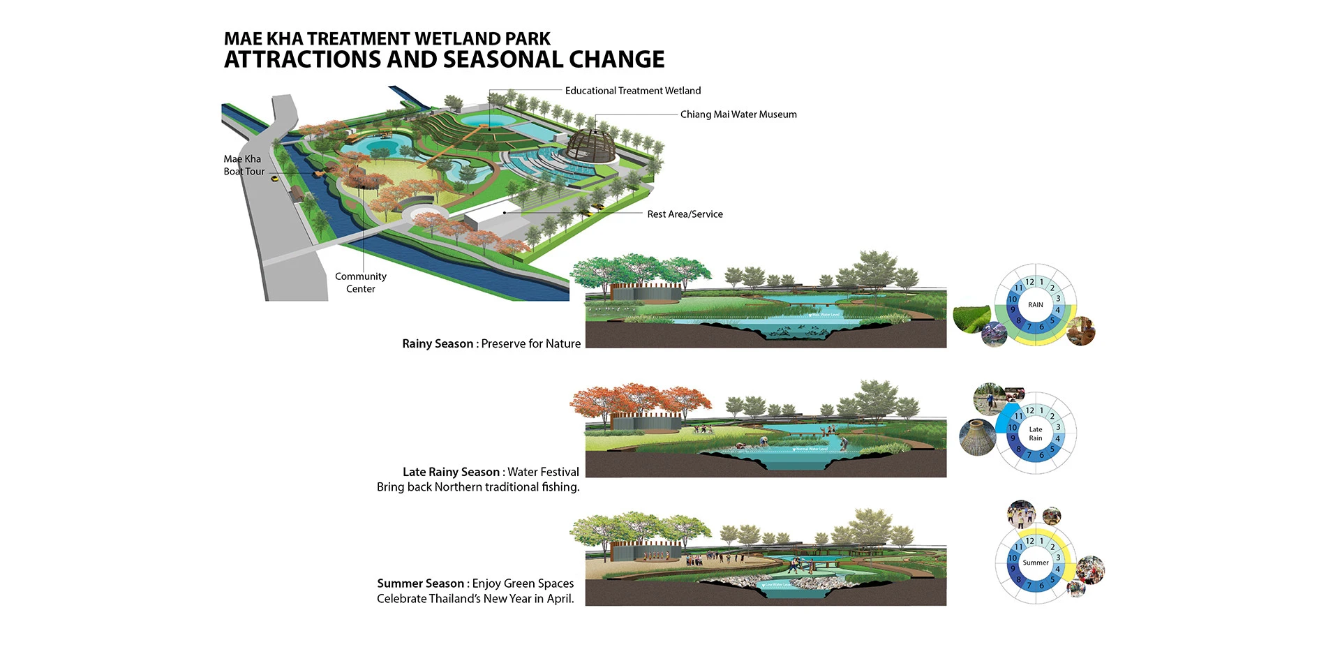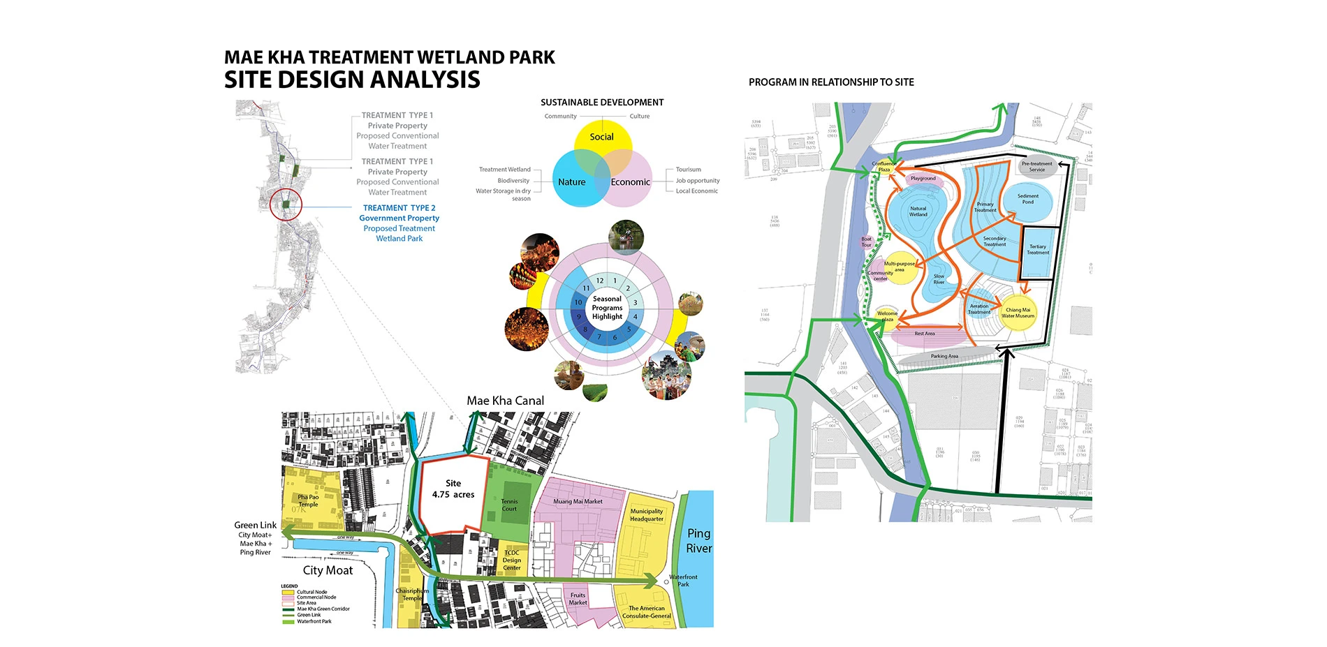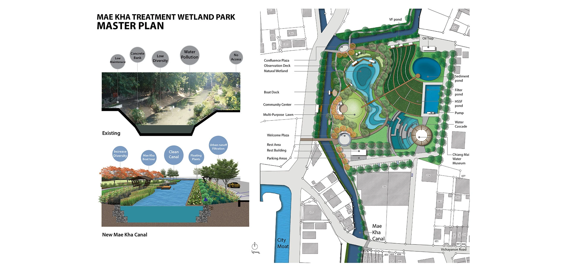 To help mitigate the issue of water pollution, this project focuses on Mae Kha Canal, the most degraded urban canal in the North, with the aim of creating a sustainable future for the degraded urban canal. It aims to promote ecological and sustainable approach in improving water quality in Mae Kha Canal. In an urban scale, it suggests a Green Corridor along the canal where people can interact with nature and enjoy recreation spaces. it intends to promote a stewardship program that encourages participation of communities, government, organizations, stakeholders and private sectors in coordination to Mae Kha Canal development. In a site scale, it proposes a landscape infrastructure of an urban wetland park in the North of Thailand that integrates ecological processes and recreation spaces. As a pilot project of wetland water treatment, the infrastructure will demonstrate and help educate people to learn how to purify water by using ecological methods and the benefits of long- term maintenance and development. Moreover it will articulate Mae Kha Canal’s historical significance and culturally rich in order to encourage a sense of preservation and respect.