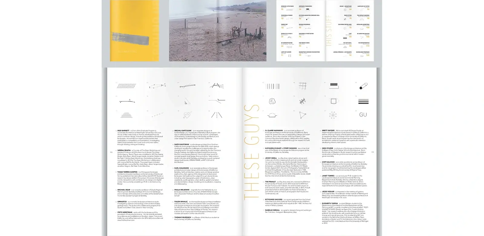 GROUND UP: Is the student journal of the Department of Landscape Architecture and Environmental Planning, College of Environmental Design, UC Berkeley is an annual print and web publication intended to stimulate thought, discussion, visual exploration and substantive speculation about emerging landscape issues affecting contemporary praxis. IS an examination of a critical theme arising from the tension between contemporary landscape architecture, ecology and pressing cultural issues. IS intended as a discursive platform to explore concepts grounded in local issues with global relevance.