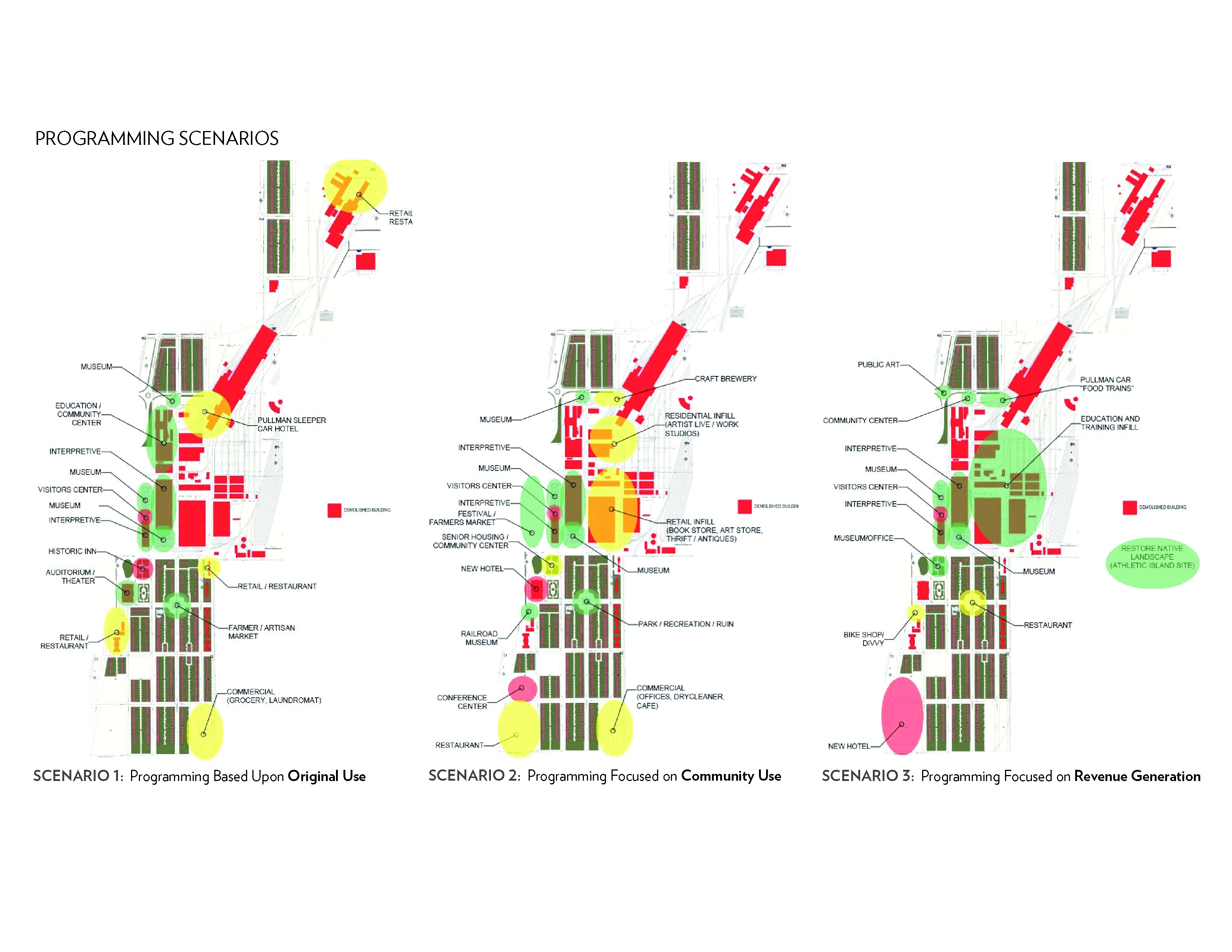 The workshop was facilitated by a technical team of 40 volunteer architects, landscape architects, city planners, economists, and engineers, who assembled to work with Pullman stakeholders to develop a roadmap for improvement and operations. Discussion was organized around four topics: park experience; historic preservation and adaptive reuse; access and connections; and community development. Input was collected from the over 500 diverse and committed stakeholders who attended the events.