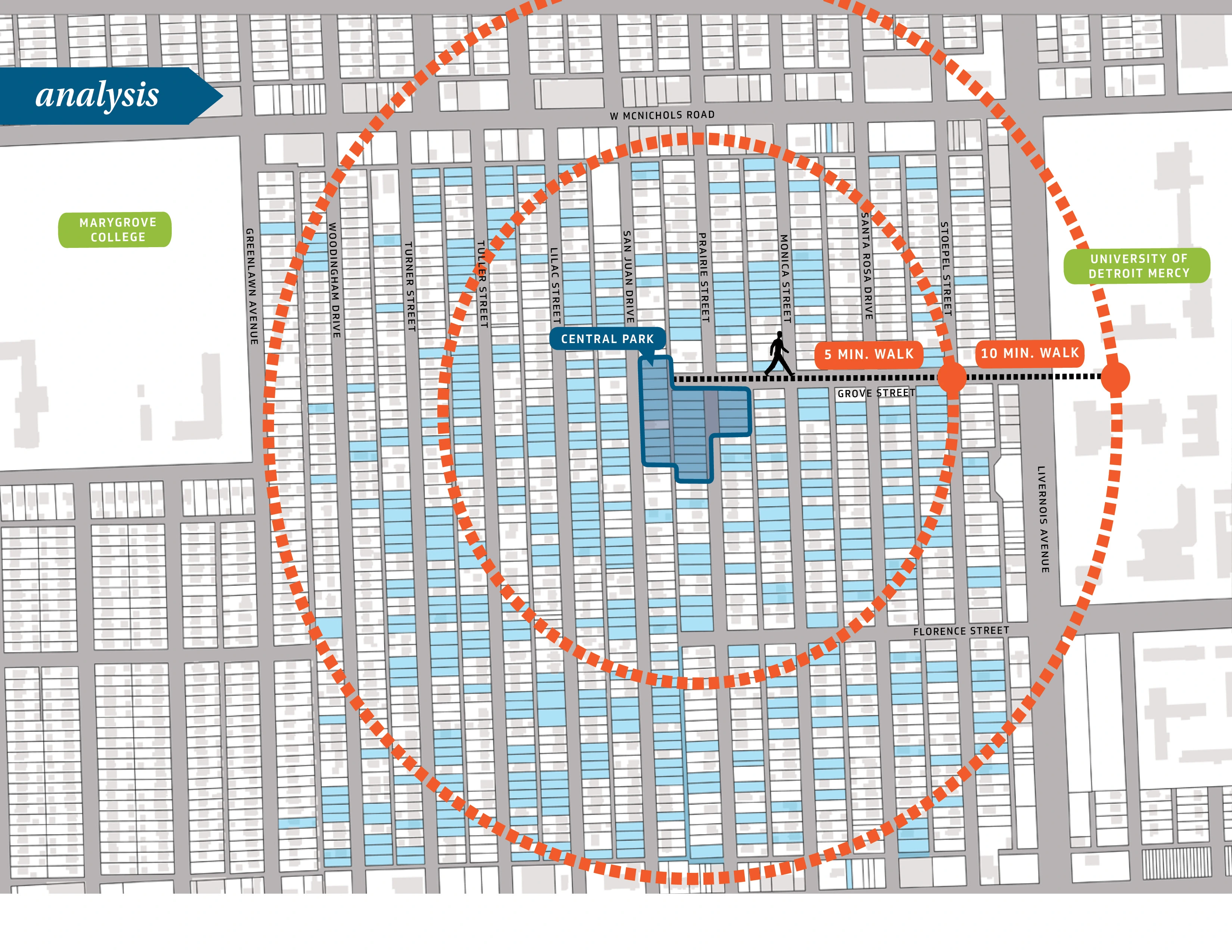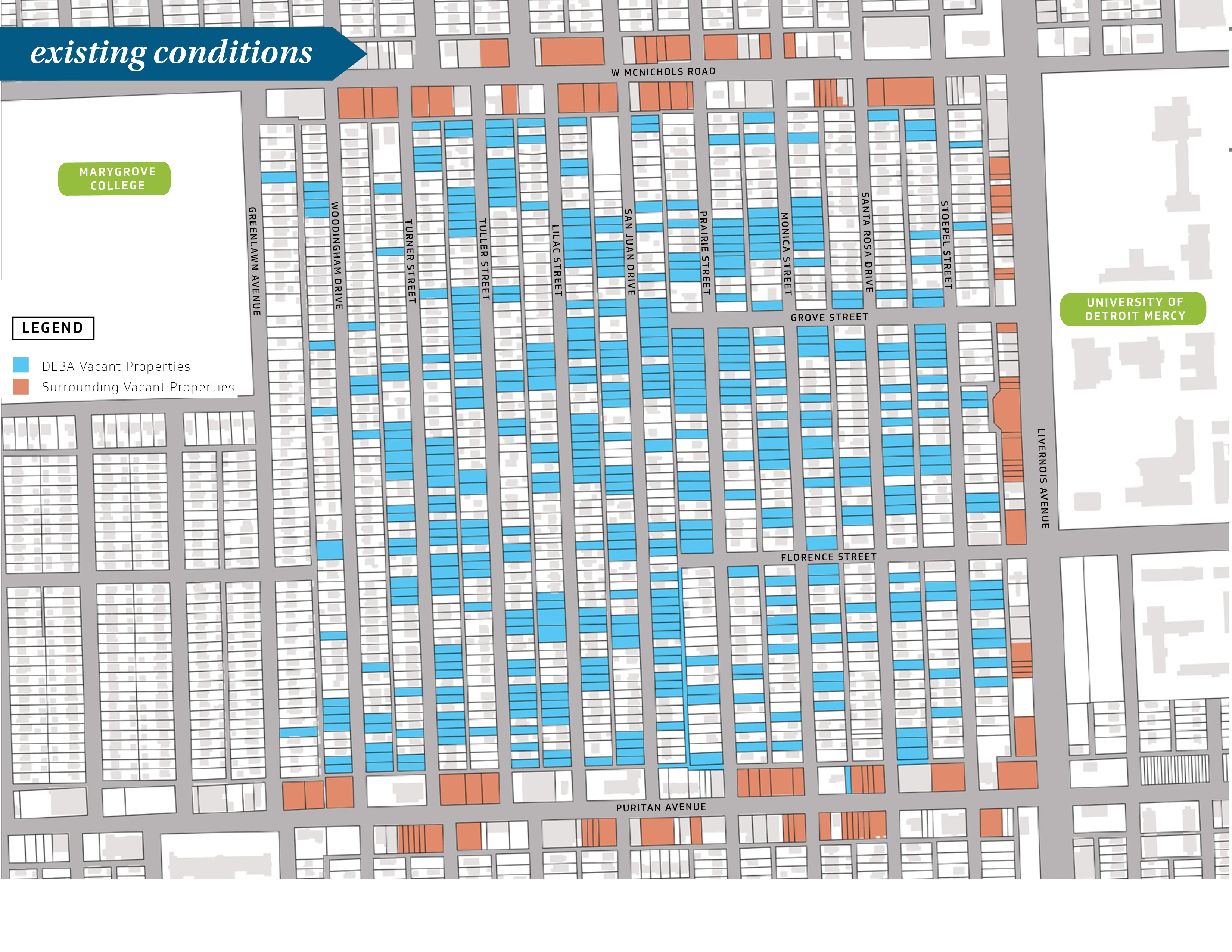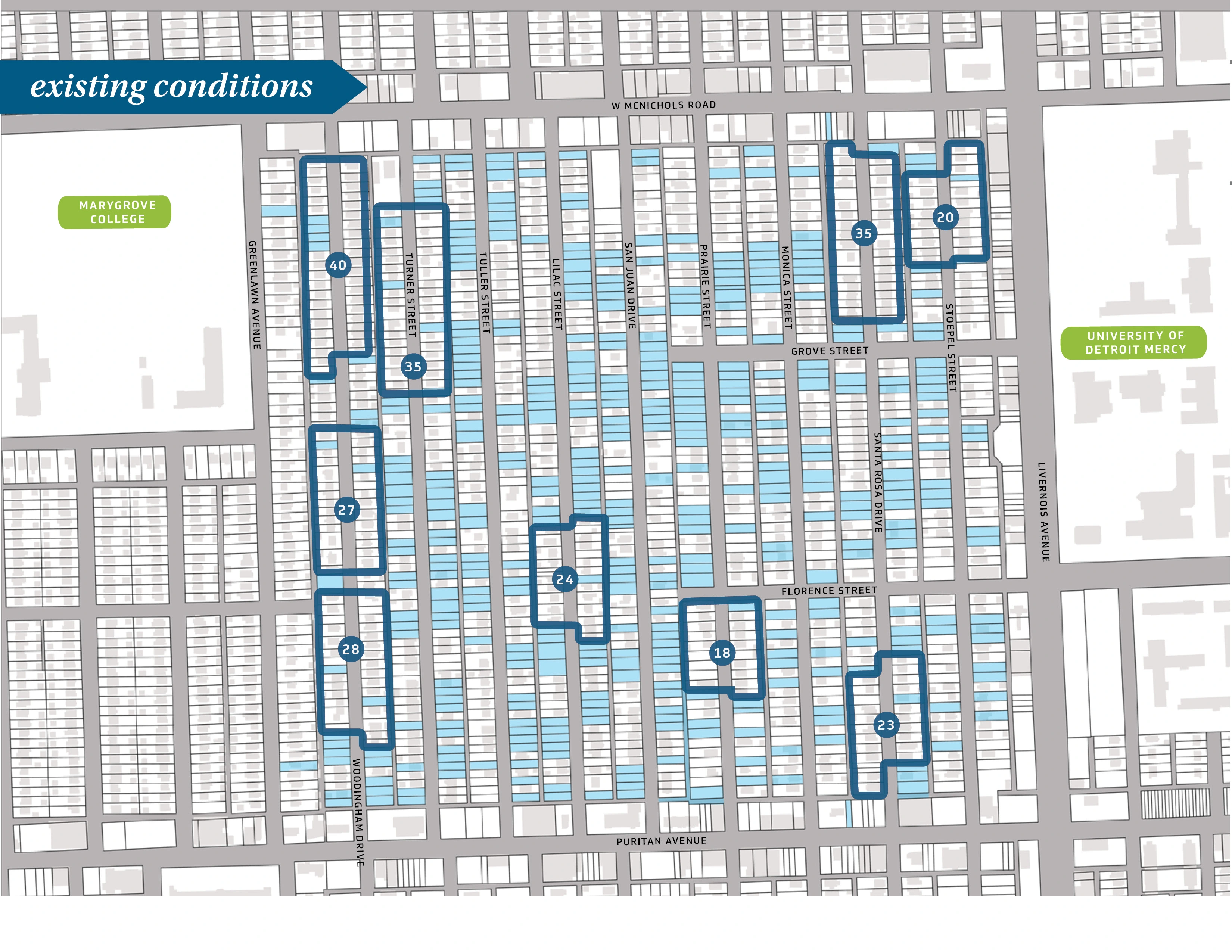 The project is located in the Fitzgerald neighborhood of Detroit, located between two anchor institutions: the University of Detroit Mercy and Marygrove College. As the population in Detroit declined, this neighborhood was hard hit, with over 1,500 residents leaving the area. Currently, the vacancy rate in the neighborhood is around 50%, with over 300 vacant parcels in this ¼ square mile area. Vacant, overgrown lots and empty houses, some in good shape, some in grave disrepair, are interspersed among active households. Pedestrian circulation in the neighborhood is compromised due to the street layout, lack of pedestrian routes, and the high speed of traffic.