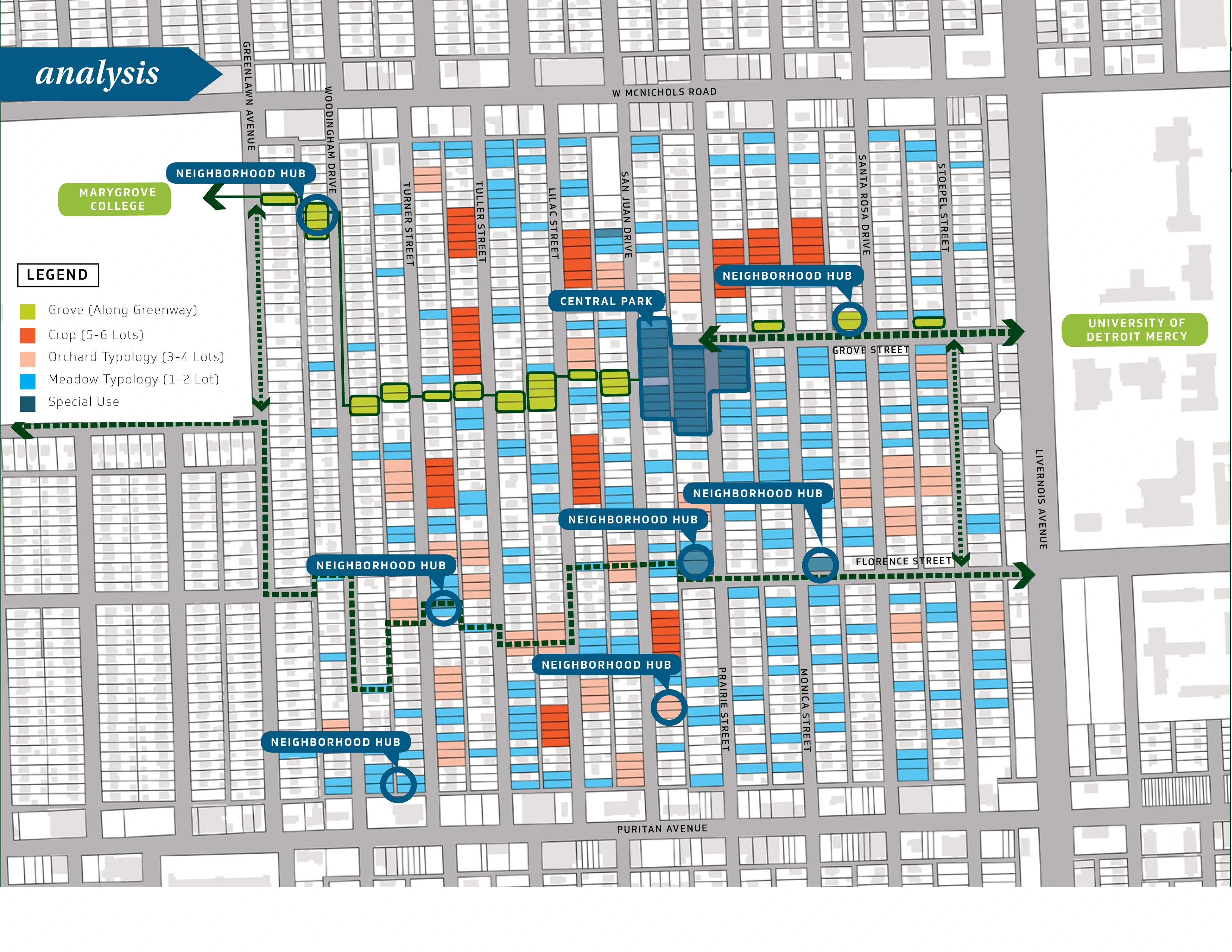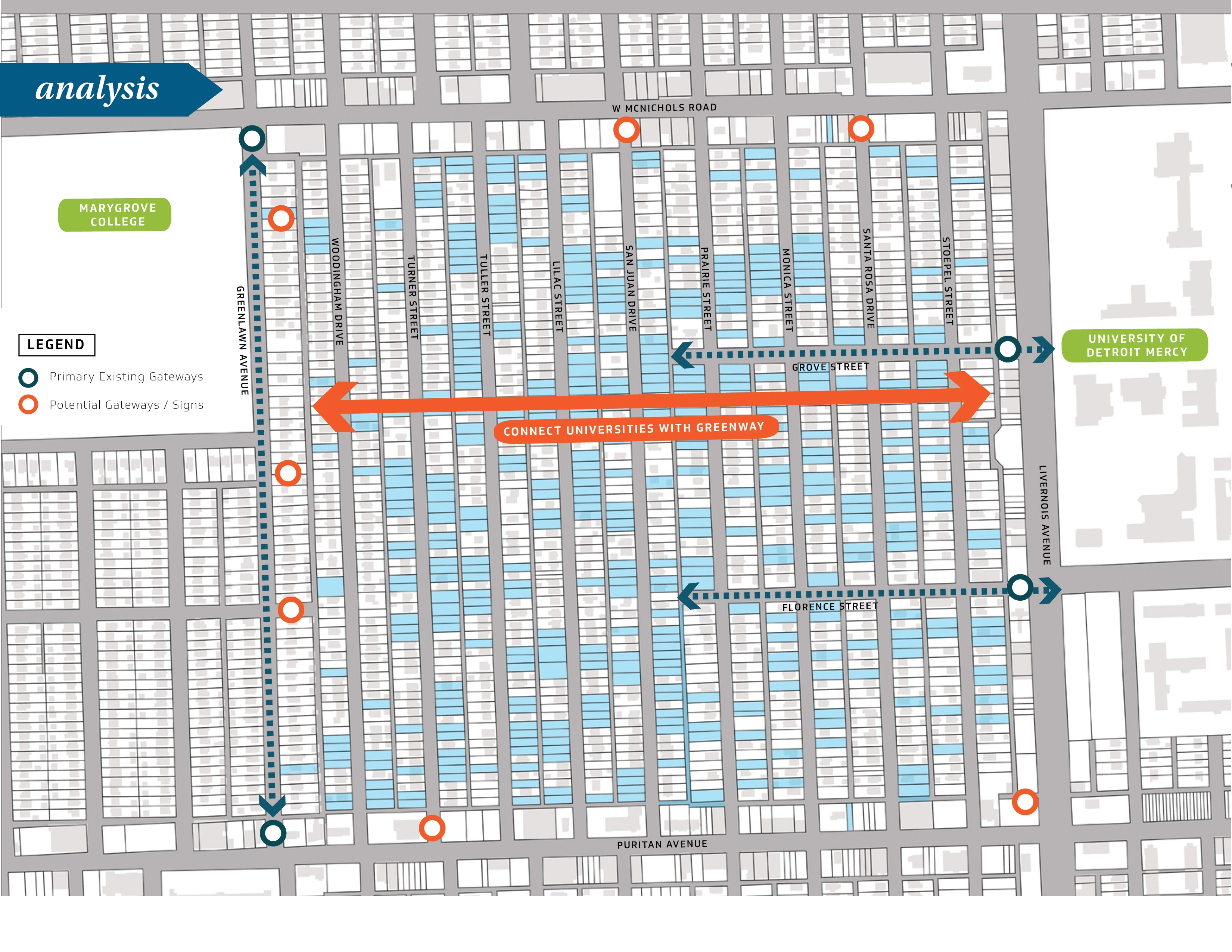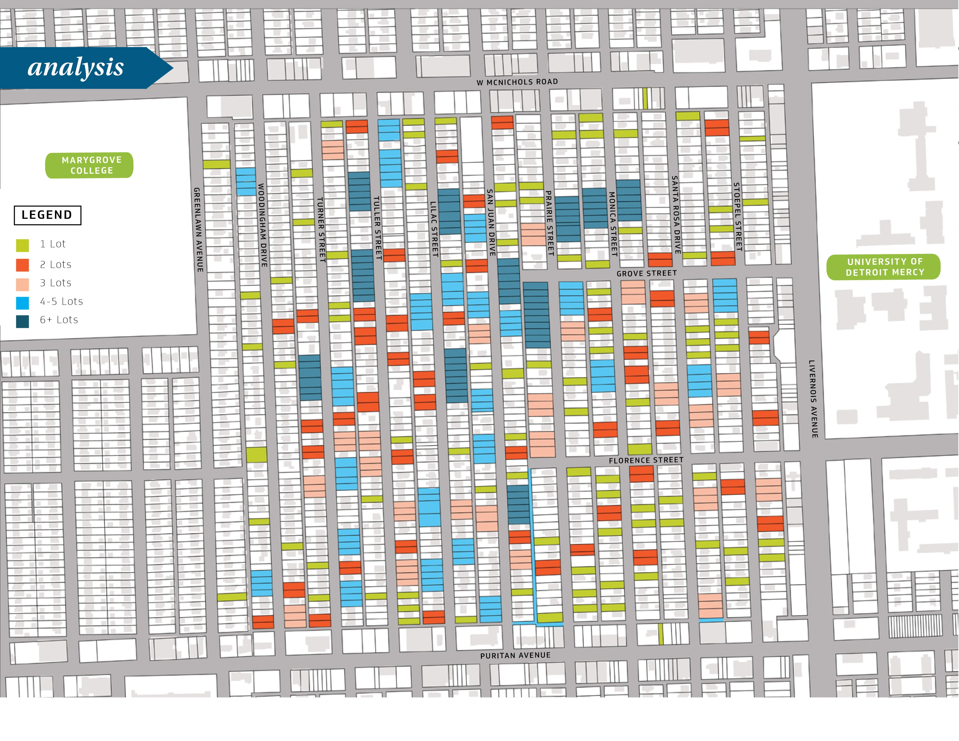 The project is located in the Fitzgerald neighborhood of Detroit, located between two anchor institutions: the University of Detroit Mercy and Marygrove College. As the population in Detroit declined, this neighborhood was hard hit, with over 1,500 residents leaving the area. Currently, the vacancy rate in the neighborhood is around 50%, with over 300 vacant parcels in this ¼ square mile area. Vacant, overgrown lots and empty houses, some in good shape, some in grave disrepair, are interspersed among active households. Pedestrian circulation in the neighborhood is compromised due to the street layout, lack of pedestrian routes, and the high speed of traffic.