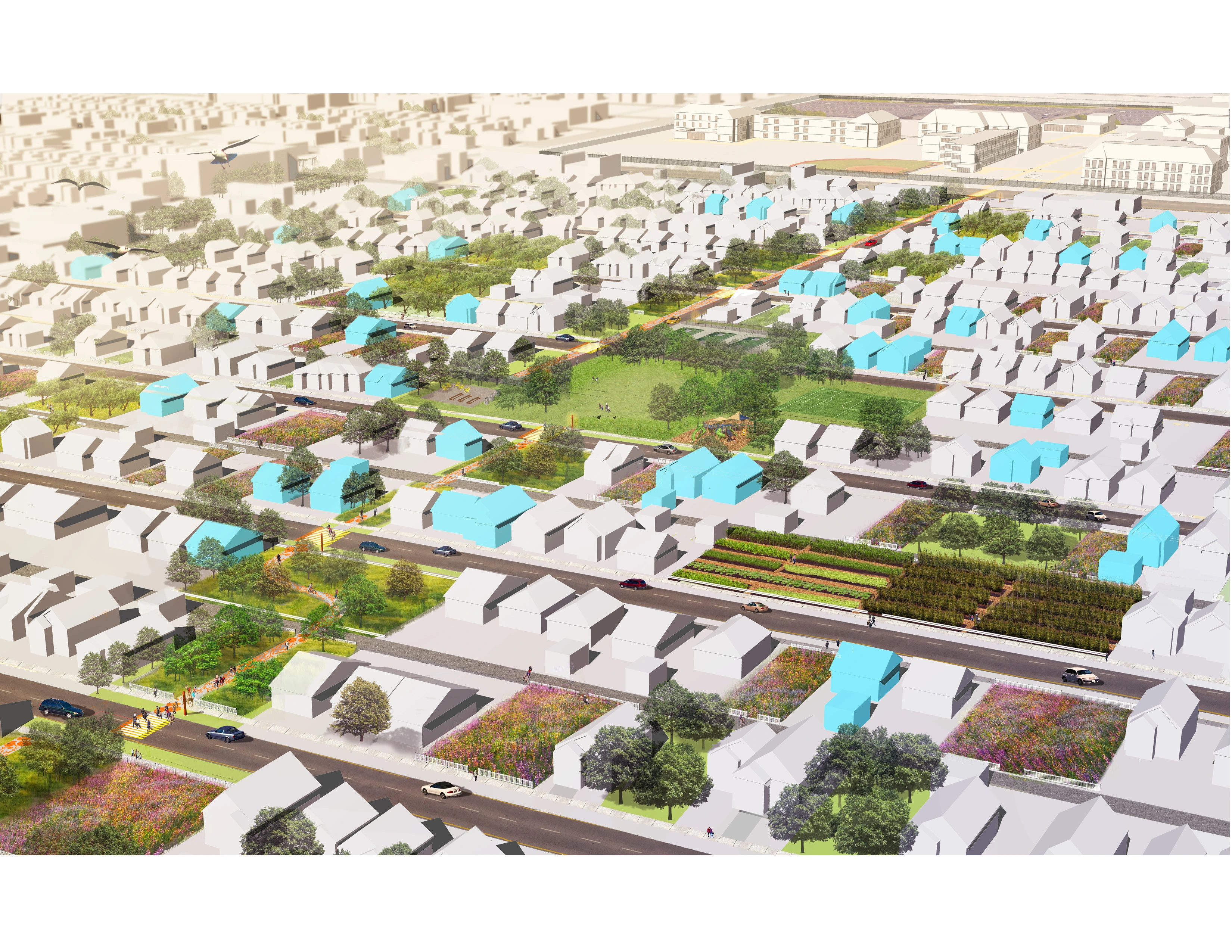 The plan calls for a new greenway and park created by consolidating vacant parcels, as well as the transformation of 200 vacant lots into community hubs, orchards, pollinator habitats, and stormwater management sites. Built on this landscape framework are market-driven productive landscapes, the rehabilitation of 115 abandoned structures into affordable housing, and a green-collar workforce initiative.