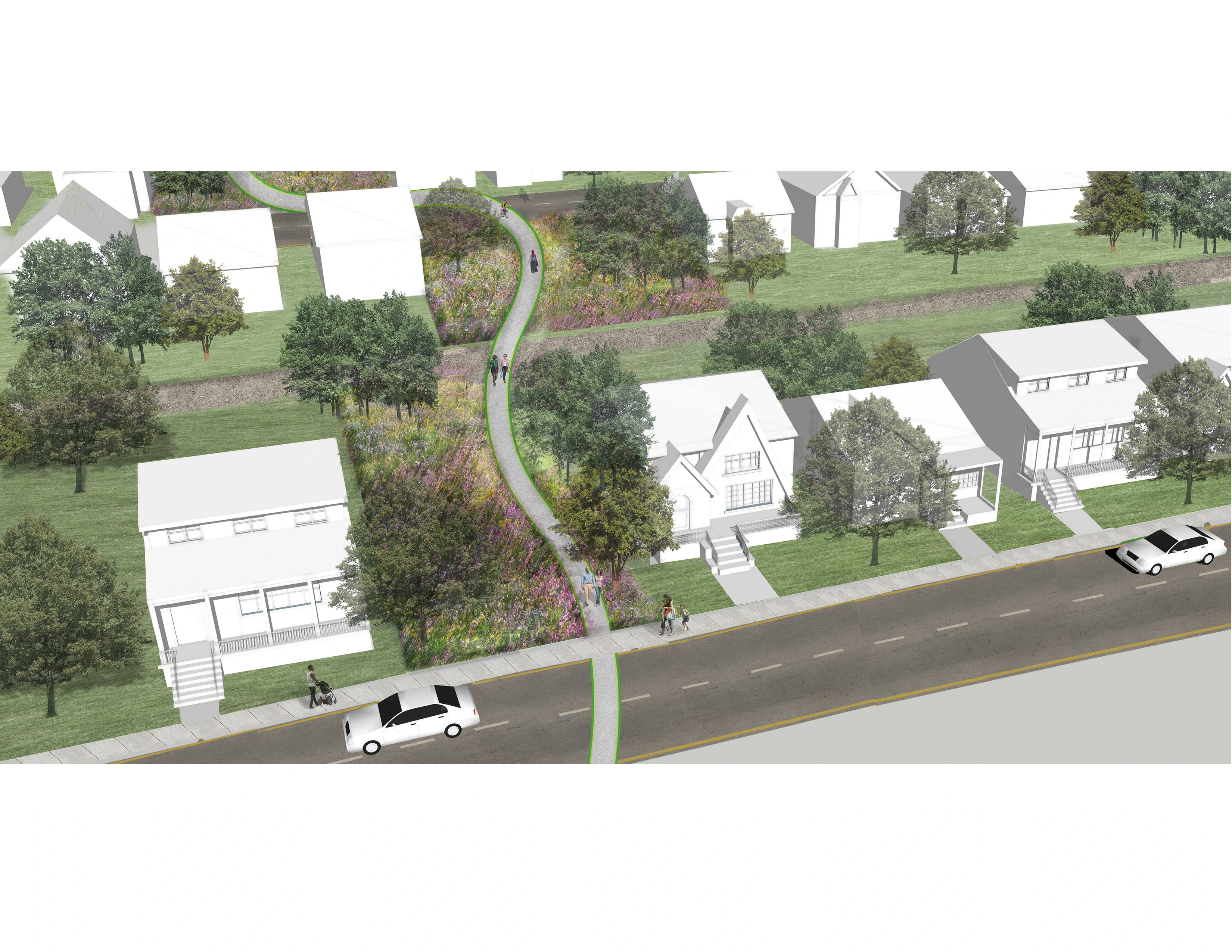 One of the key goals of the project is to build resiliency into the landscape systems in the neighborhoods through increased ecosystems services. The landscape stewardship plan envisions a new way to manage these neighborhood landscapes that focus on creating pollinator habitat with native meadow landscapes. Opportunities to increase the coverage and quality of the urban tree canopy, increase biodiversity, and manage stormwater in the neighborhood are all key components to the plan. A clear and consistent goal of the community is to restore the landscapes and bring back lush, vibrant landscapes that support a host of ecosystem services.