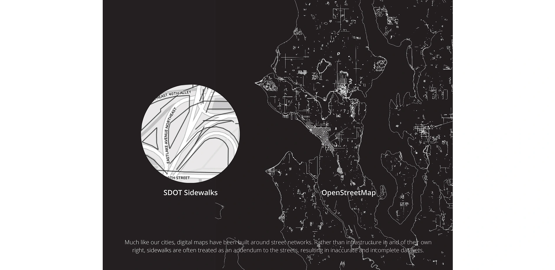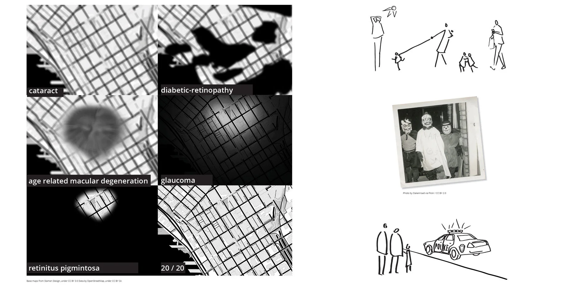 Illustrative documentation of both the process and analysis that went into making these maps is directed more squarely at the design community. This project re-examines the pedestrian environment, with a focus on the specific needs of the low vision and blind communities. The goal of this work is to persuade designers to consider a broader spectrum of experience, and engage more critically in what it means to be designing inclusive cities.