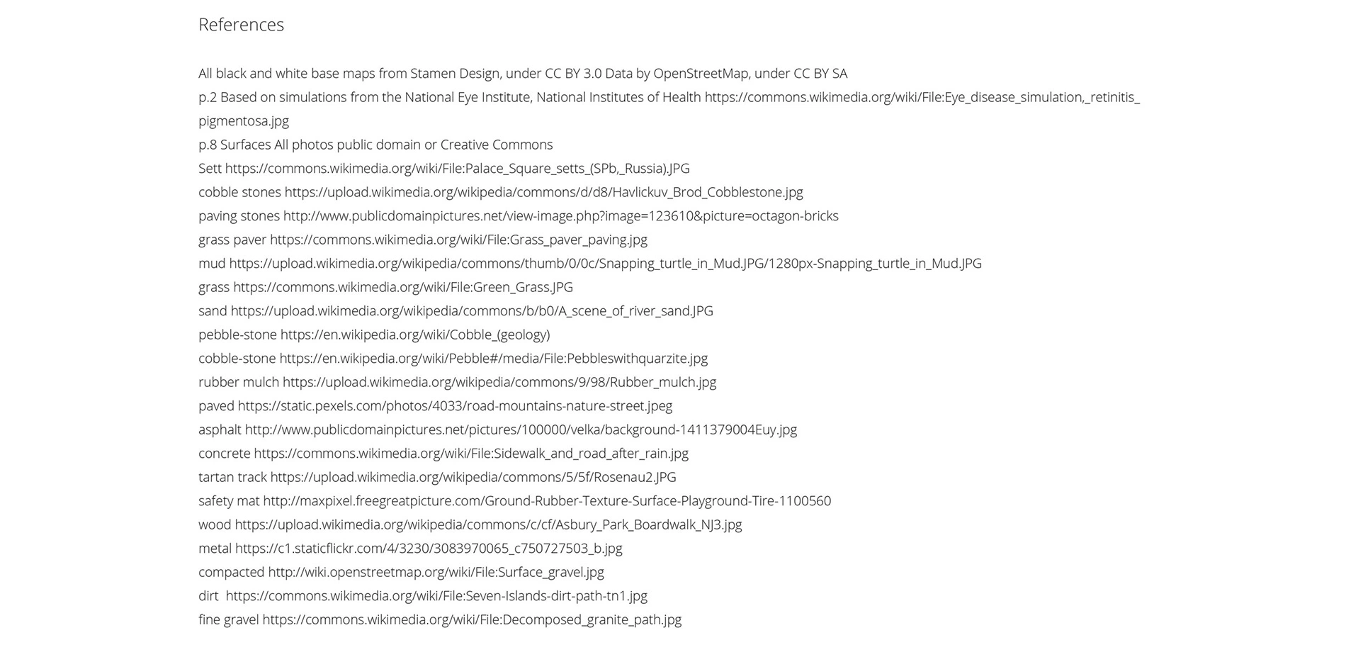 This project is meant to bring attention to the deficiencies of the system currently place, in which accessibility checklists too often are accepted in lieu of truly inclusive design. The straightforward approach is intended to remind designers that accessible design is good design, and if we want to build more equitable cities that means there is a huge spectrum of experiences we must first understand.